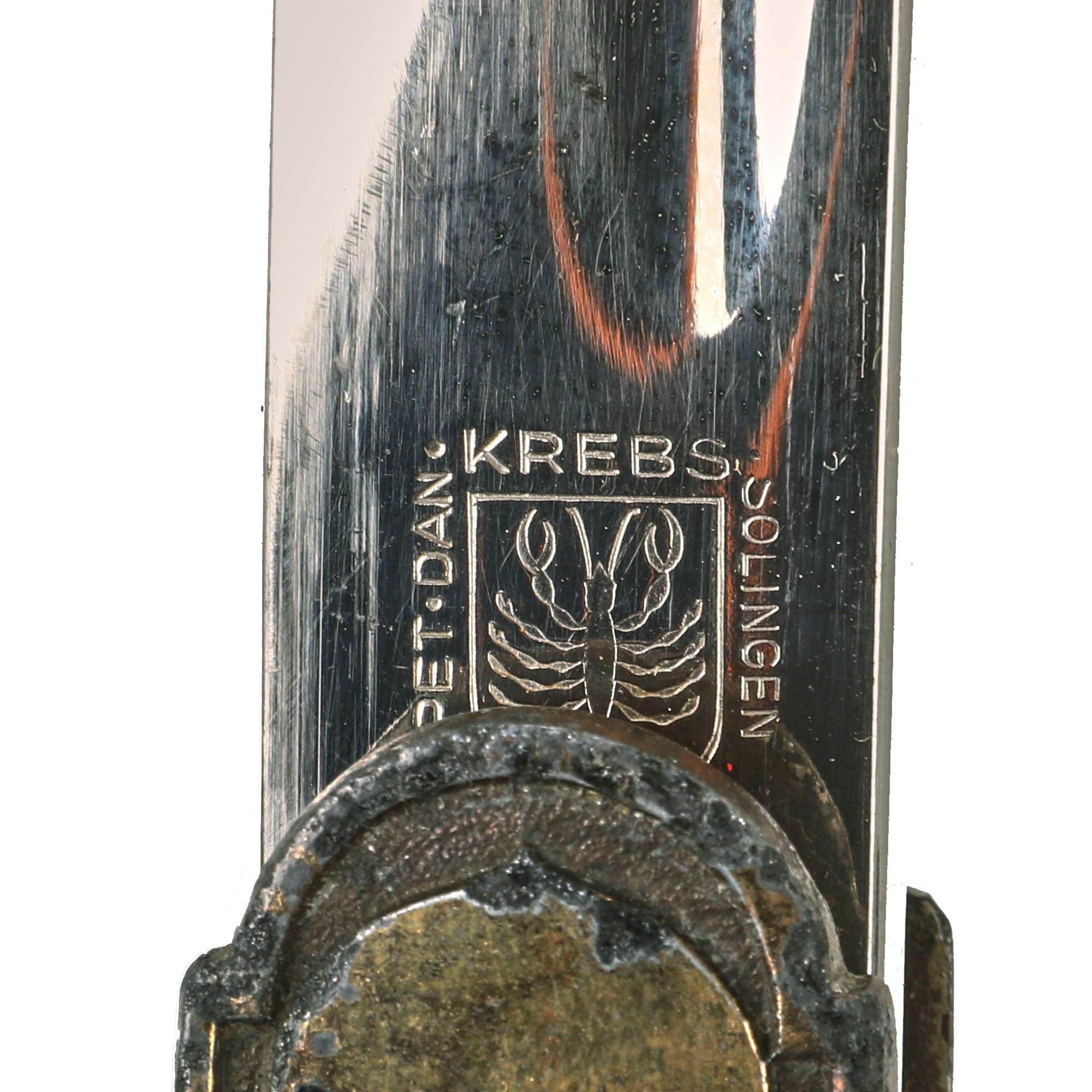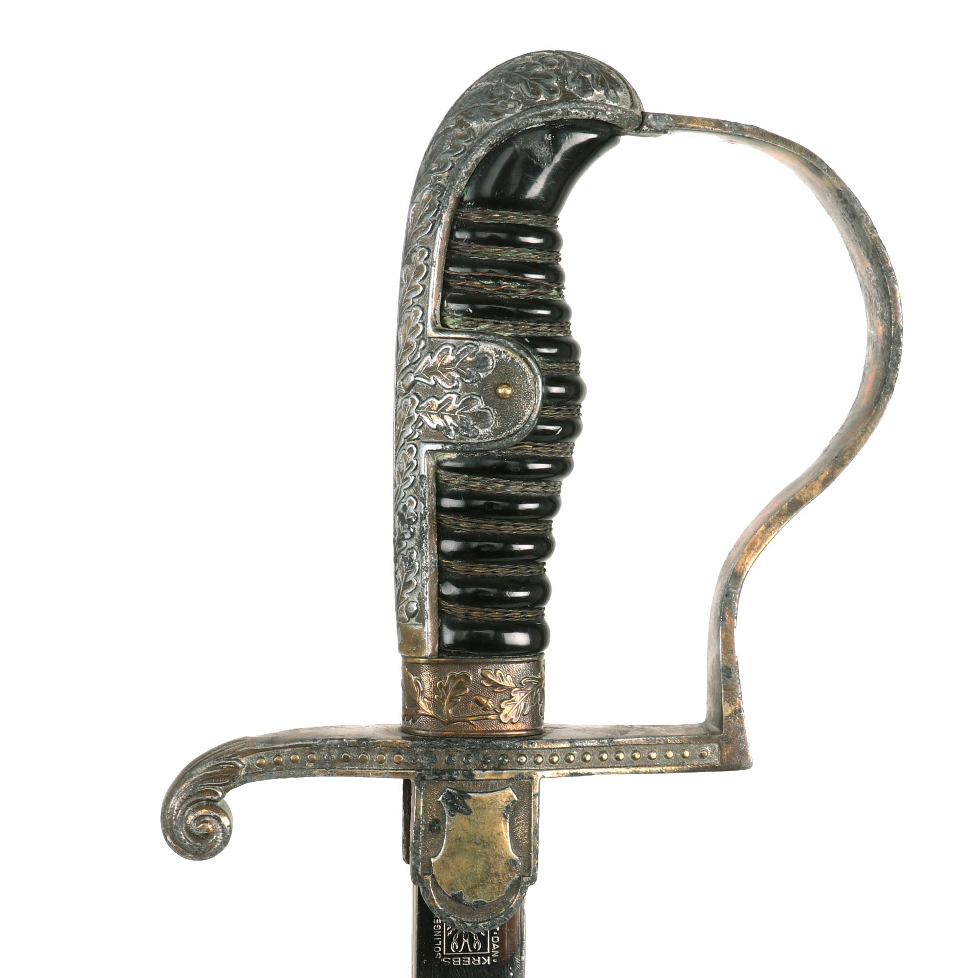 The reverse ricasso is maker marked with a "Crayfish" or "Fresh Water Lobster" mark inside a shield, surrounded by PET · DAN · KREBS · SOLINGEN, the maker mark of Peter Daniel Krebs, Waffenfabrikation (Arms Manufacture. This was a relatively well-known maker from Solingen, the famous "City of Blades" in Western Germany, which produced many fine edged weapons. Per J. Anthony Carter's fine work GERMAN SWORD AND KNIFE MAKERS, this company began trading in 1860, though it did not register until 1899. Krebs is the German word for "Crayfish", and was originally registered as a trademark by August Krebs. The company was run by his relatives and descendants, and survived post war until 1954, when the company was dissolved.