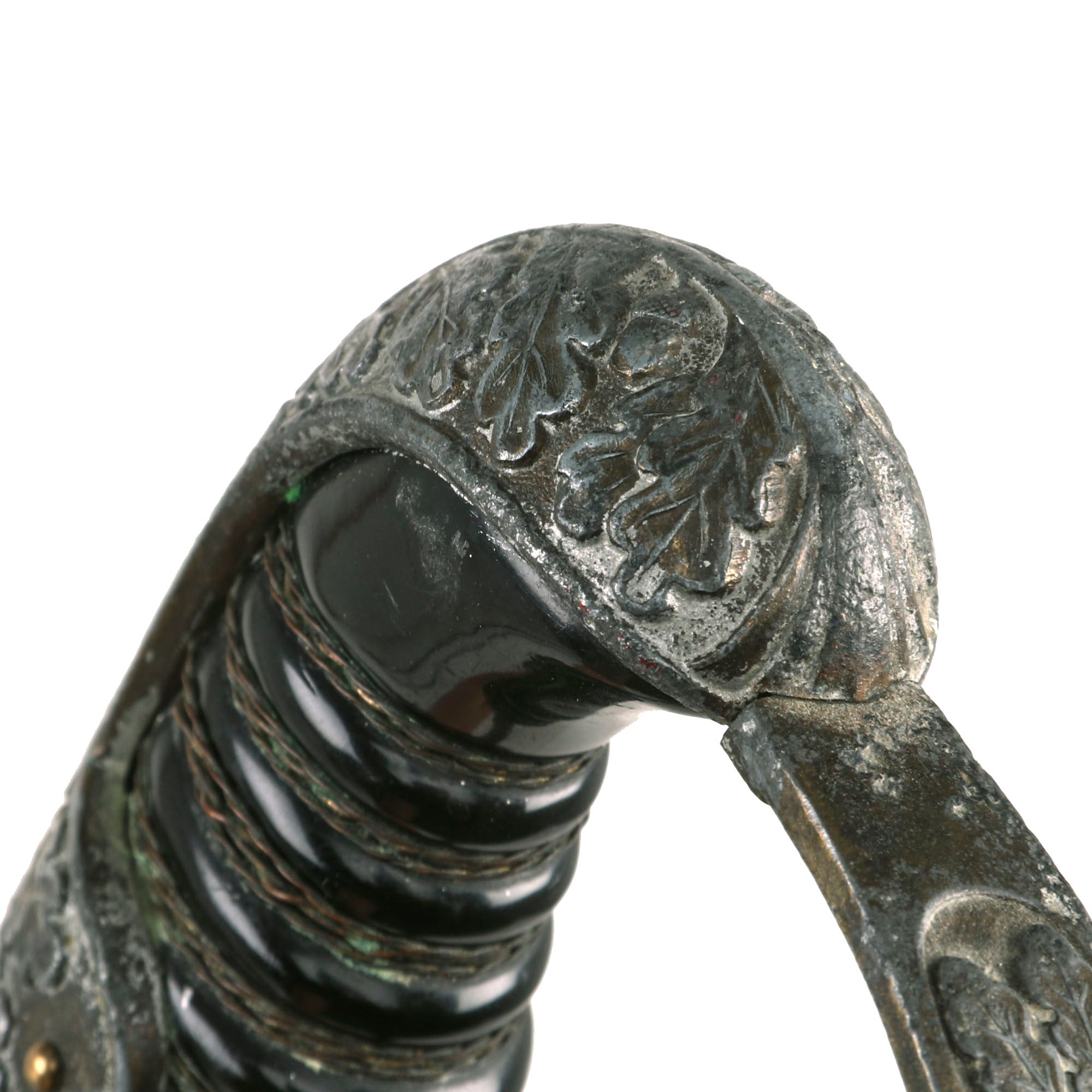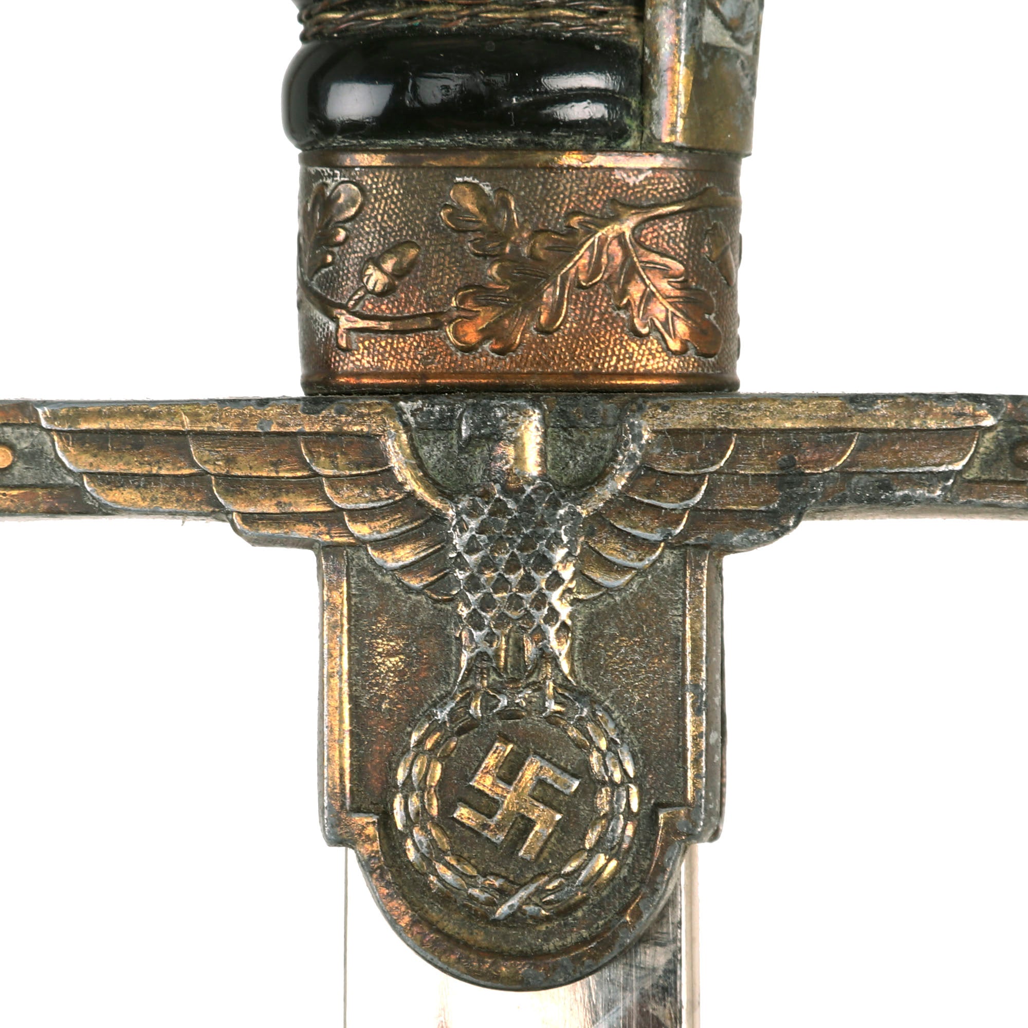 The hilt on this example is of the later war gilt & plated aluminum style, which looks to have had the gilded coating applied directly to the aluminum. It now shows a lot of wear and oxidation from hanging on the grip area and back strap, while the guard shows a lot more of the original color. It does appear to have suffered some type of weathering or exposure that has caused parts of the aluminum to oxidize. The overall design is a bit of a departure from the other examples we have seen, which mostly take after the "Field Marshall" series of Carl Eickhorn. The dove head and backstrap are embossed with the classic German oak leaves and acorns motif, which extends onto the side tabs. The "flat" P guard has the same motif, as does the brass ferrule. There are lots of hand enhancing visible, especially on the cross guard area .