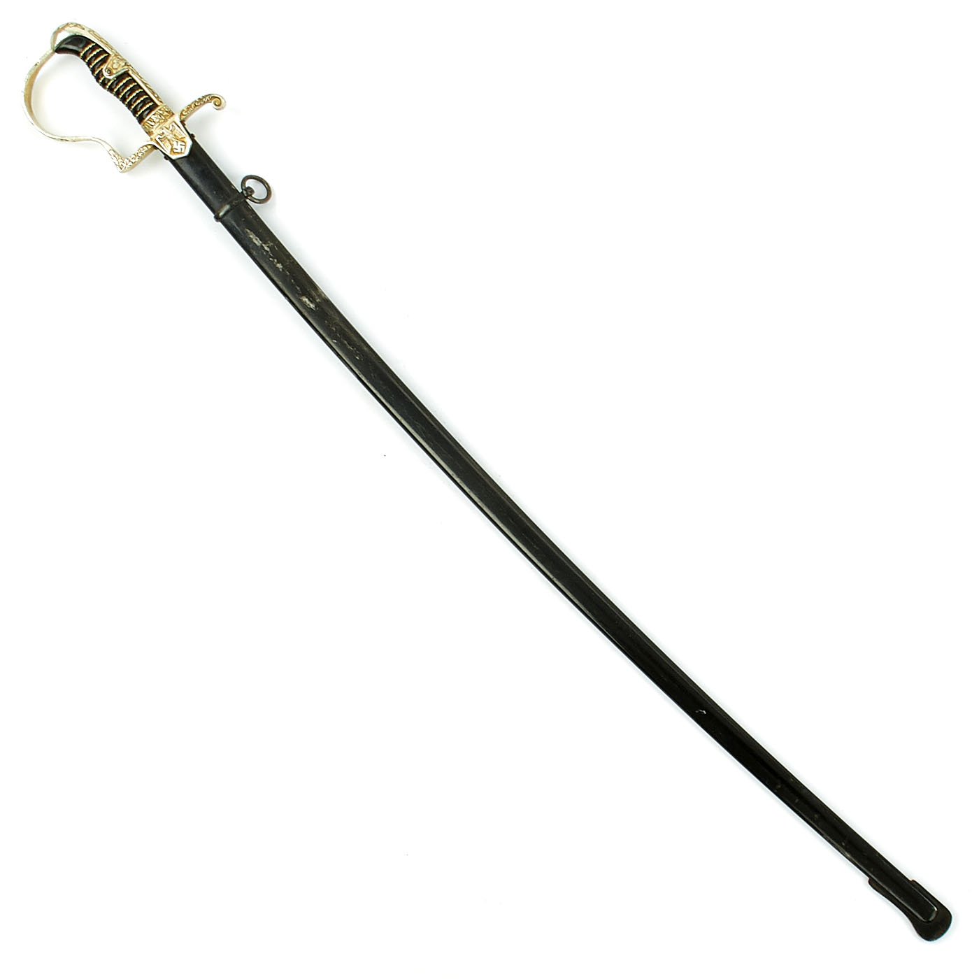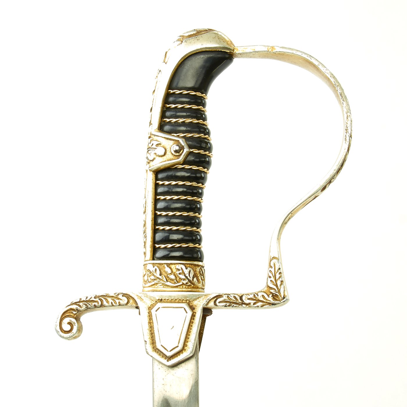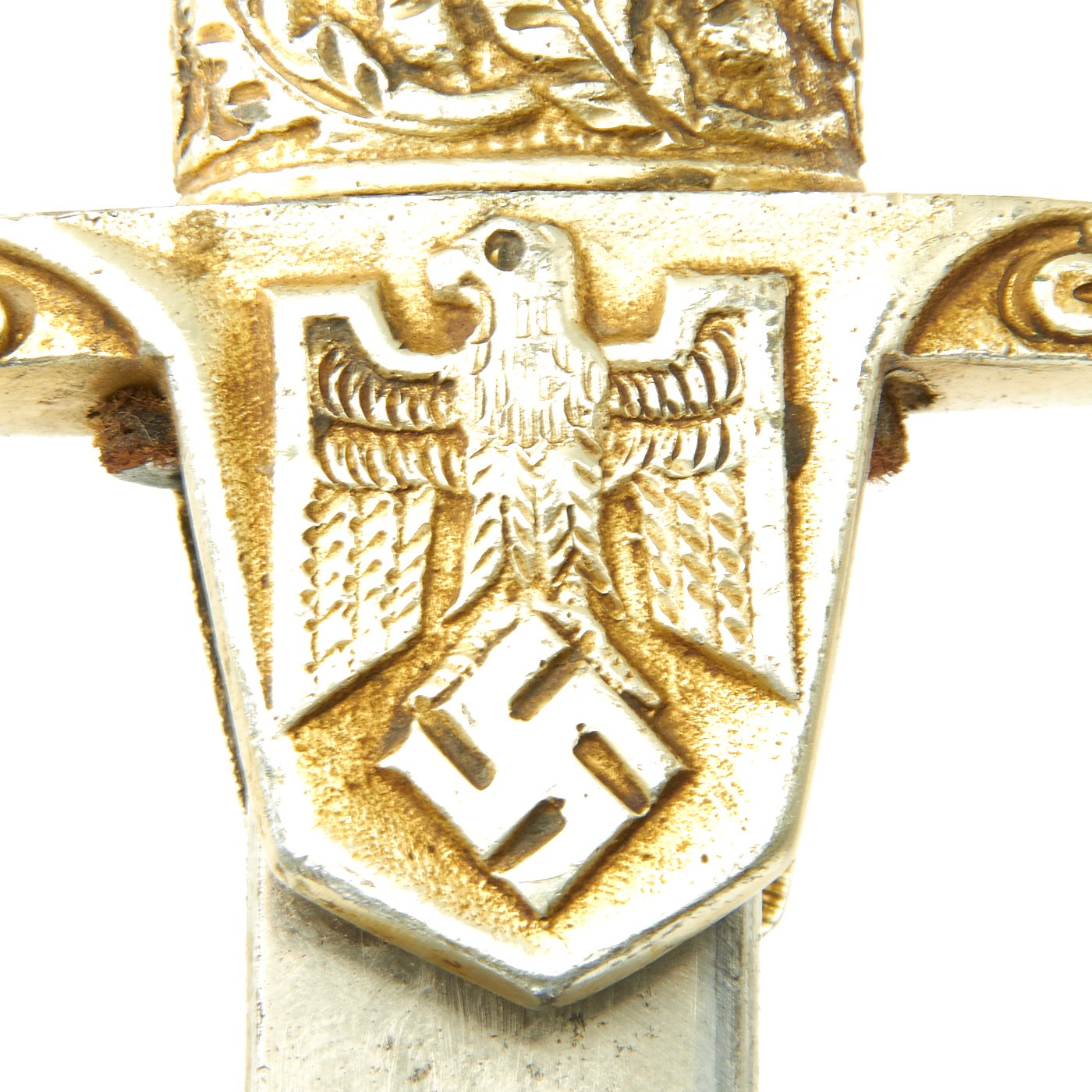 Original Item: Only One Available. This Army Dove Head Sword is a very nice example, with some interesting features that we usually do not see. The hilt of this example looks to be nickel, or possibly brass or zinc with a very sturdy nickel plating. It looks to at one time have been gilt, and the nickel under the gold would have made it very attractive. The dove head and backstrap are engraved with oak leaves and acorns, a common decoration used on German ceremonial edged weapons, as well as with other types of foliage. The "flat" P guard repeats this oak leaf motif, as does the ferrule at the top of the grip. There are lots of hand enhancing and many of the backgrounds have received pebbled decoration.