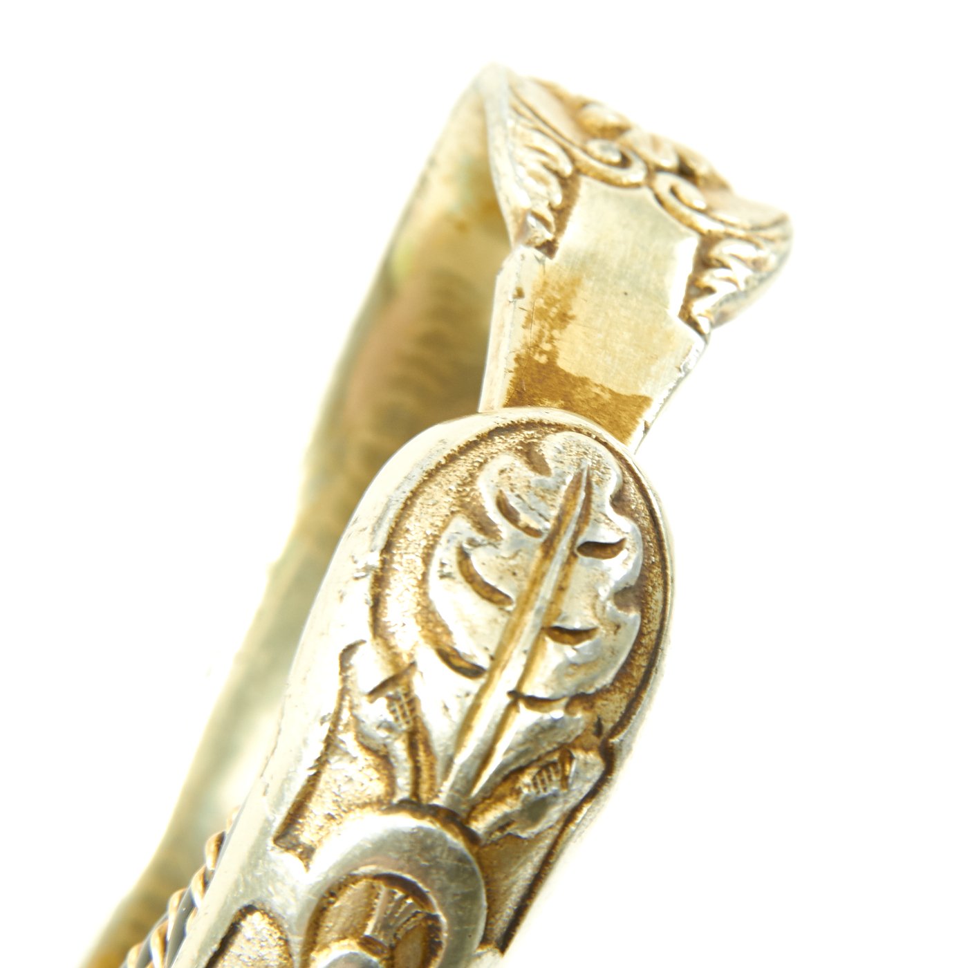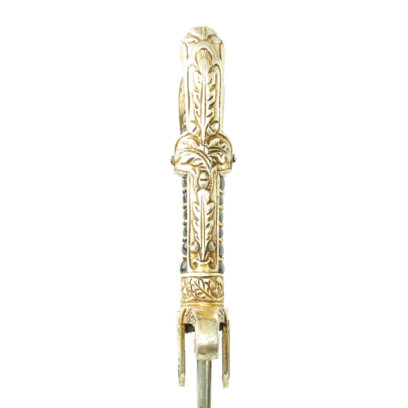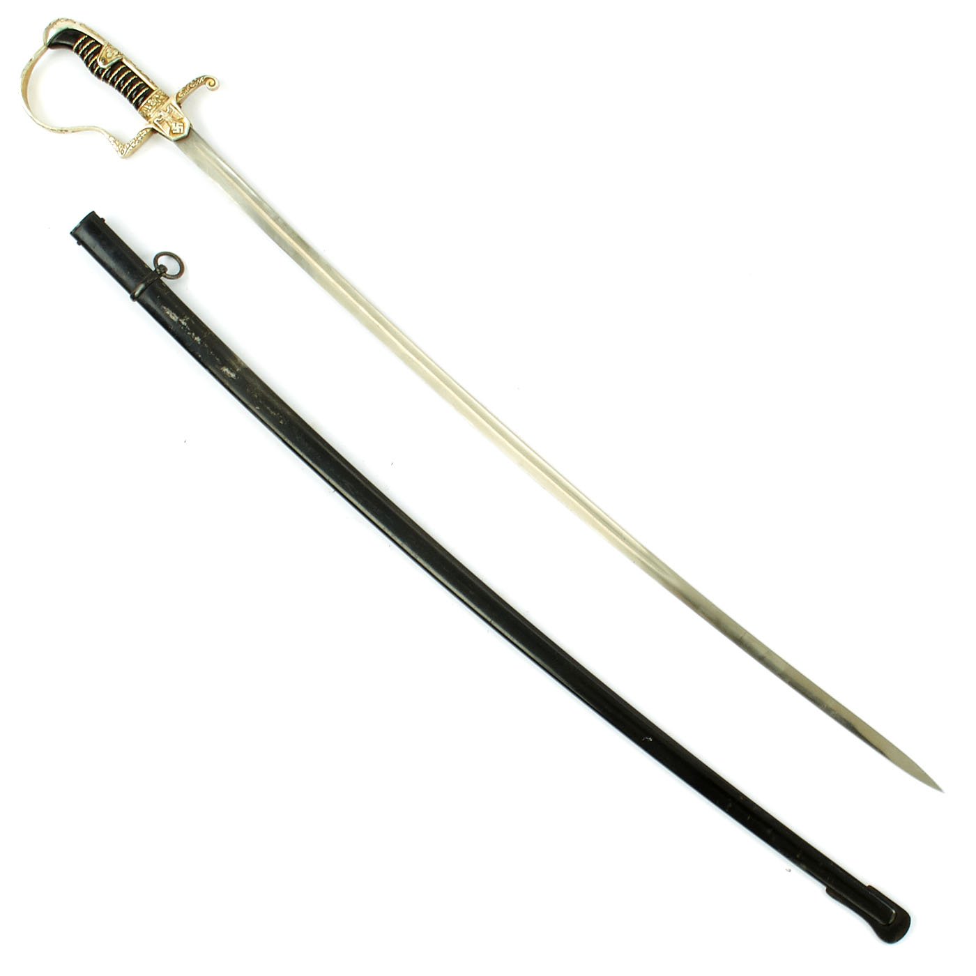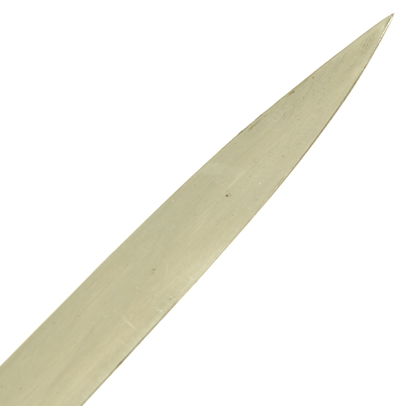 Original Item: Only One Available. This Army Dove Head Sword is a very nice example, with some interesting features that we usually do not see. The hilt of this example looks to be nickel, or possibly brass or zinc with a very sturdy nickel plating. It looks to at one time have been gilt, and the nickel under the gold would have made it very attractive. The dove head and backstrap are engraved with oak leaves and acorns, a common decoration used on German ceremonial edged weapons, as well as with other types of foliage. The "flat" P guard repeats this oak leaf motif, as does the ferrule at the top of the grip. There are lots of hand enhancing and many of the backgrounds have received pebbled decoration.