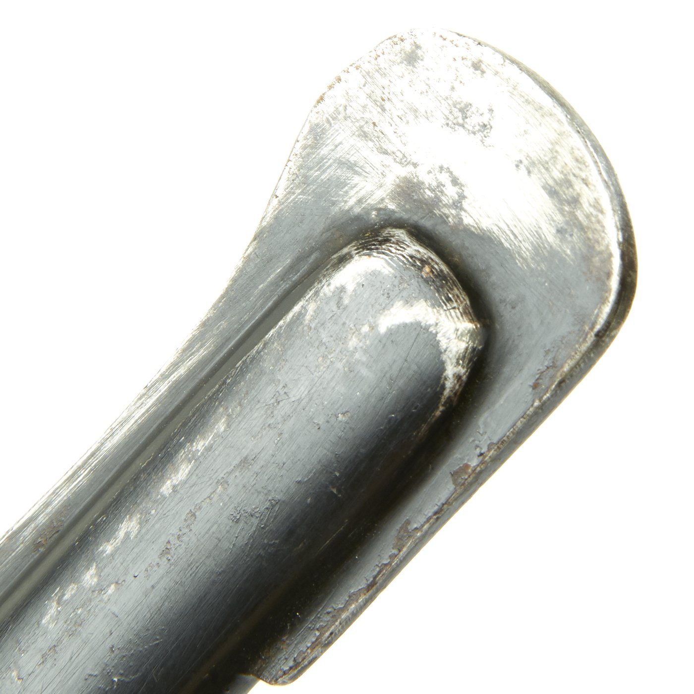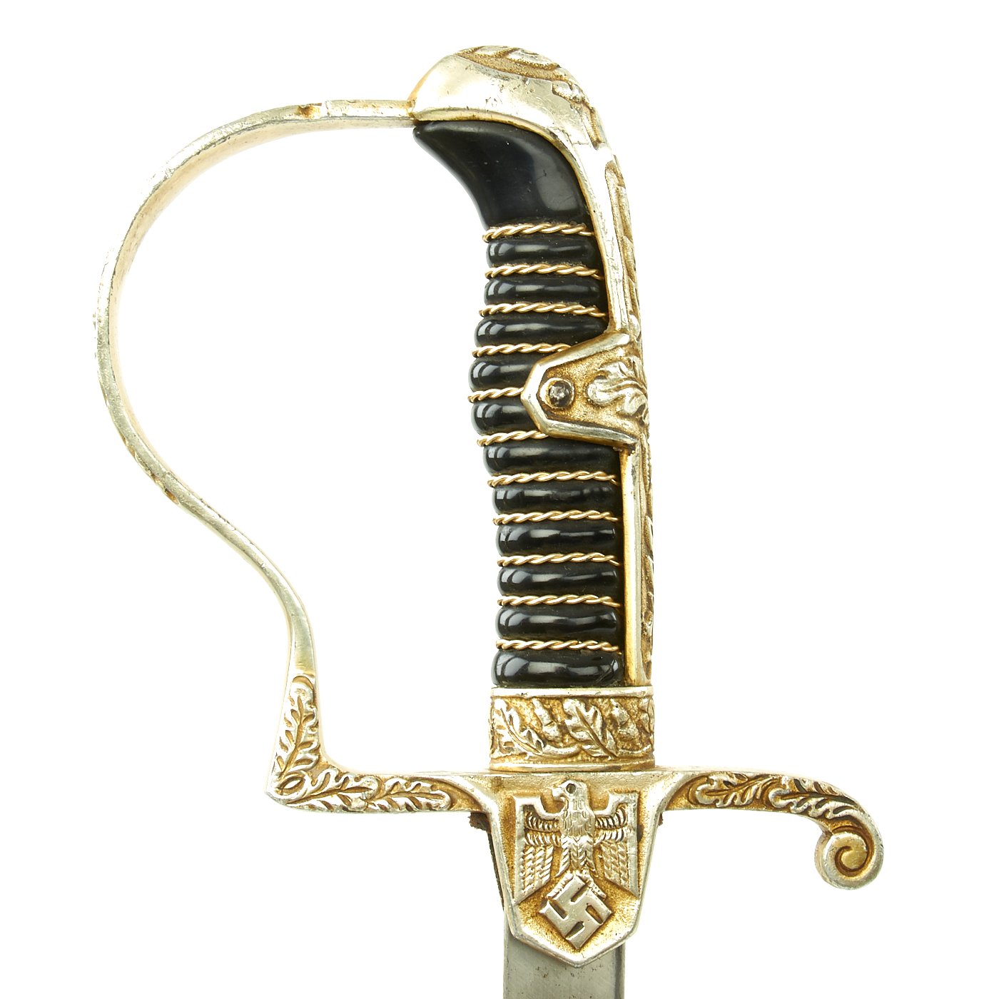 The chappe/langet features a raised out Wehrmacht eagle which shows excellent detail to his beak, eye, breast feathering, wing feathering, talons and mobile clutched swas. The other side is black, and would often be used for the officer to add a monogram. The grip of this example is a black celluloid over a carved wood base. The celluloid is still in perfect bright condition. The grip is wrapped with twisted silver wire, which is fully intact. There is a bit of play in the back strap and hilt overall, not uncommon for a 70 + year old sword.