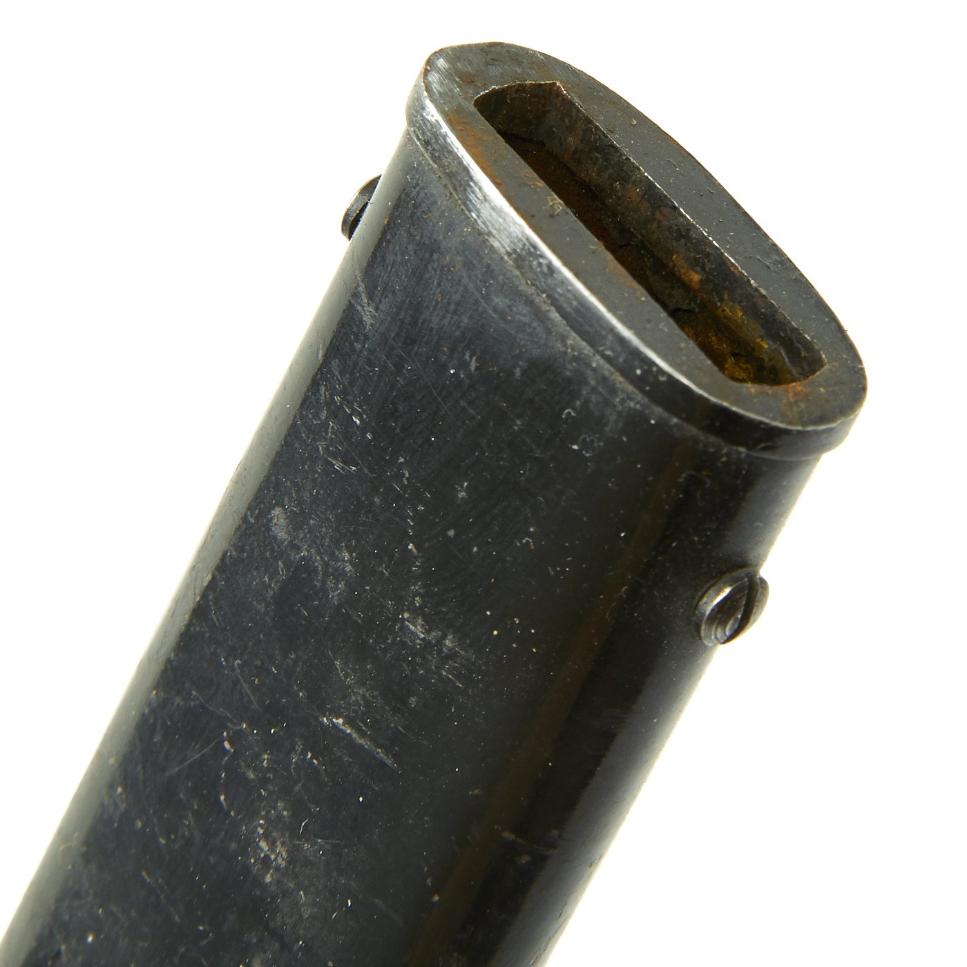 The steel scabbard of this example is straight throughout. The black enamel paint of this scabbard is mostly complete, with some flaking and wear on the drag and on the "in" side of the scabbard. It also has the usual checking and crazing of age, and still retains both throat screws.