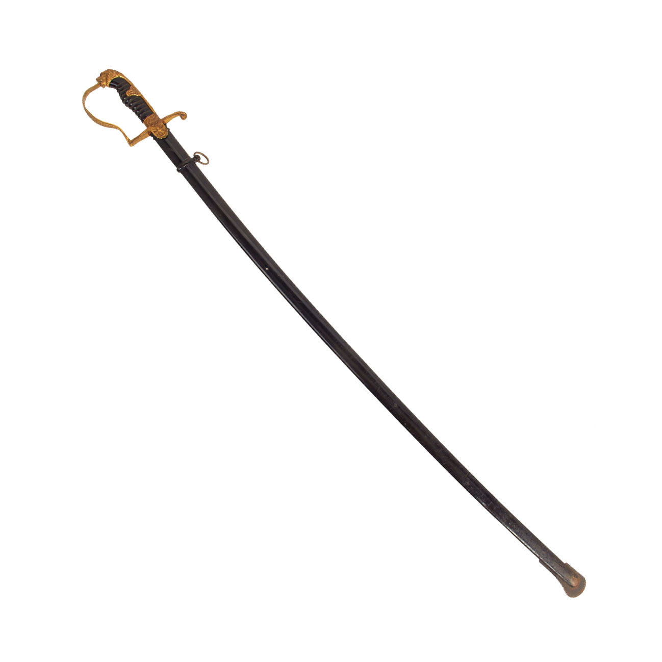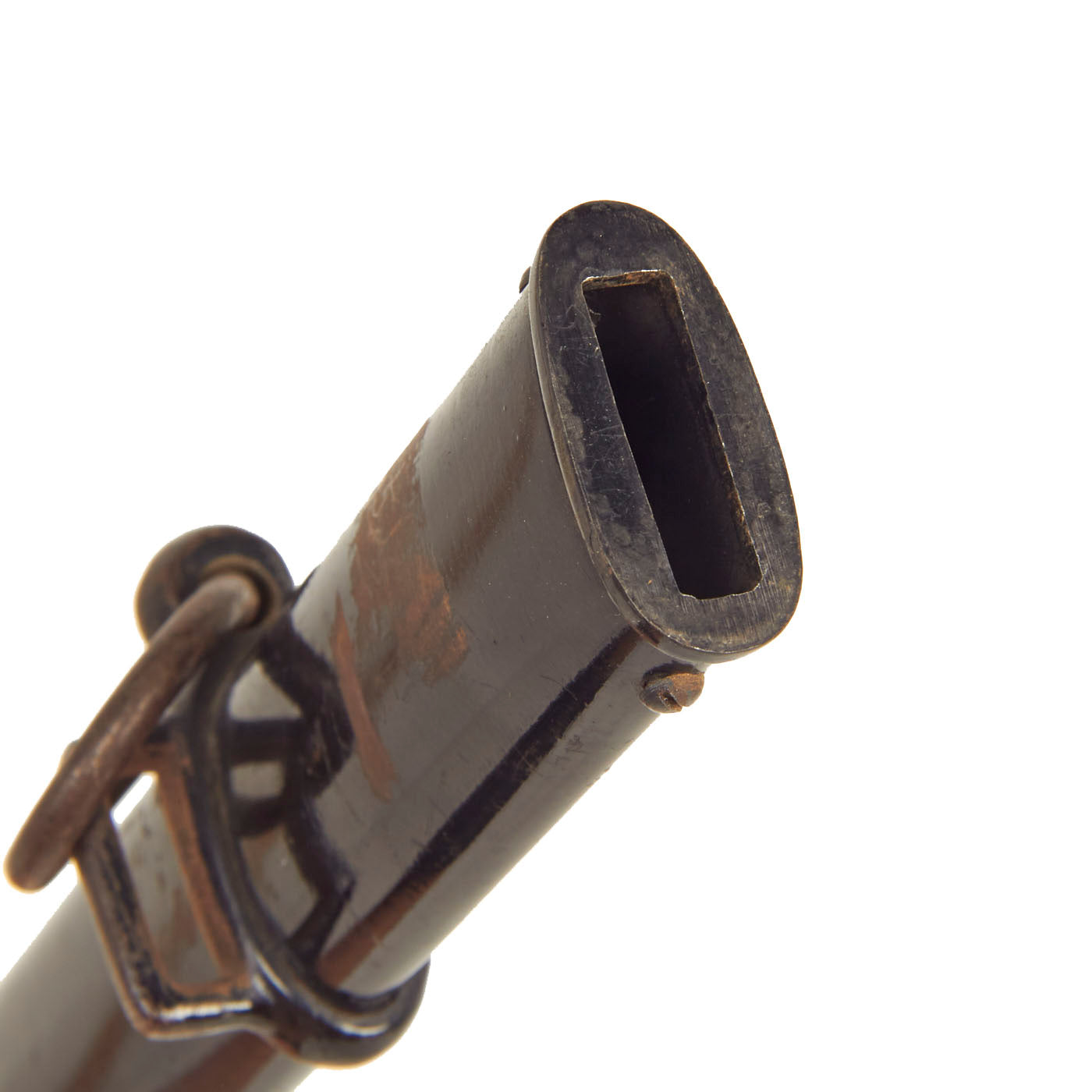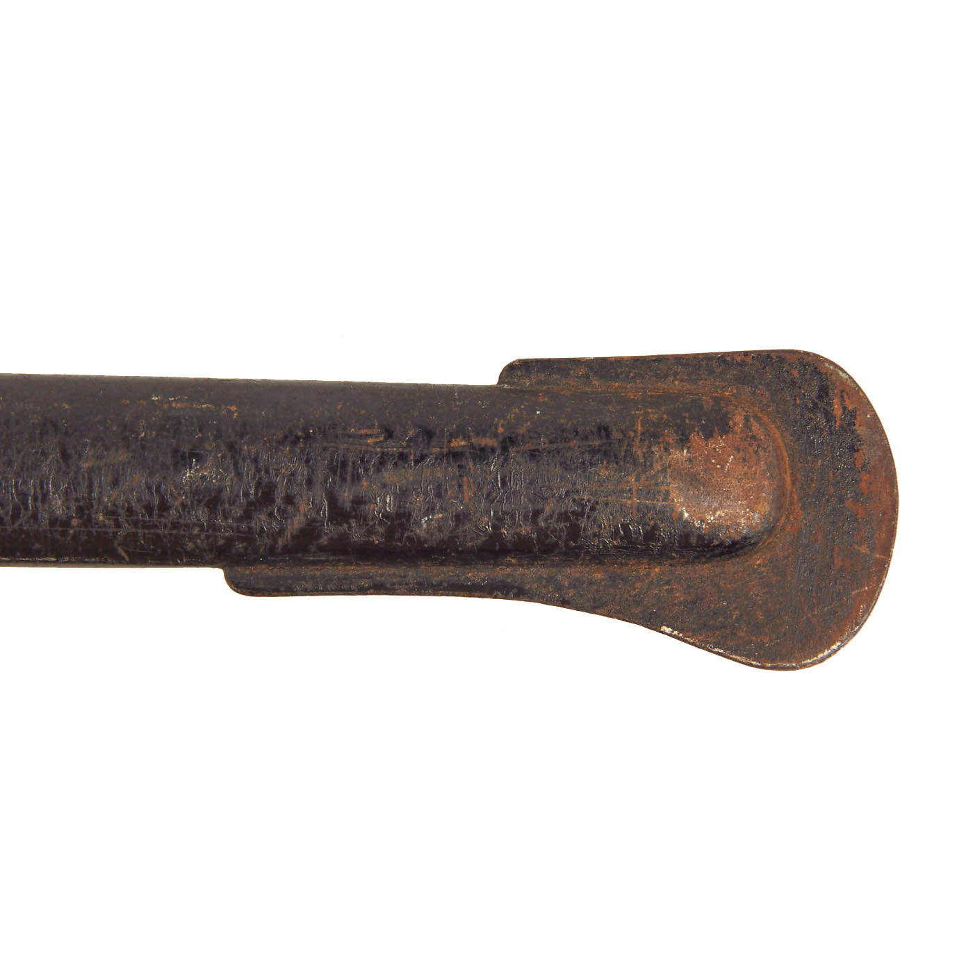 The scabbard of this example still has very good original factory black enamel, which is retained at over 90%. There is a lot of checking and crazing on the outside near the bottom, but no major flaking or oxidation. The scabbard body does have a minor bend about 8 inches from the bottom of the drag, but it does not interfere with sheathing the blade. The drag is missing a some of the paint, as is typical.