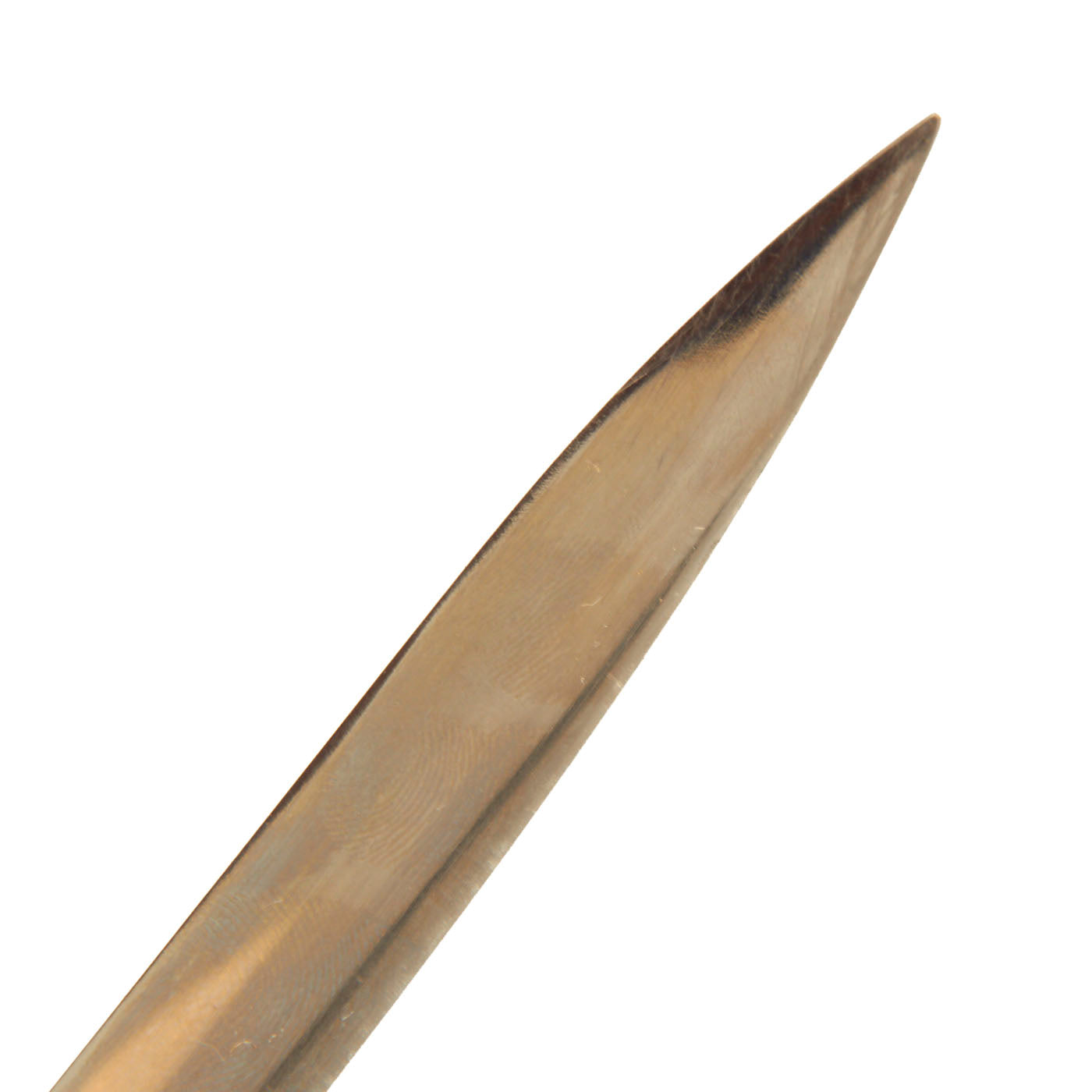 The 33 inch blade of this example is in excellent condition, with only some light scuffing in areas. It is fully nickel plated, which is retained quite almost completely. The edge is still fully blunt, as originally issued, though there are a few small dents on the edge and on the spine.