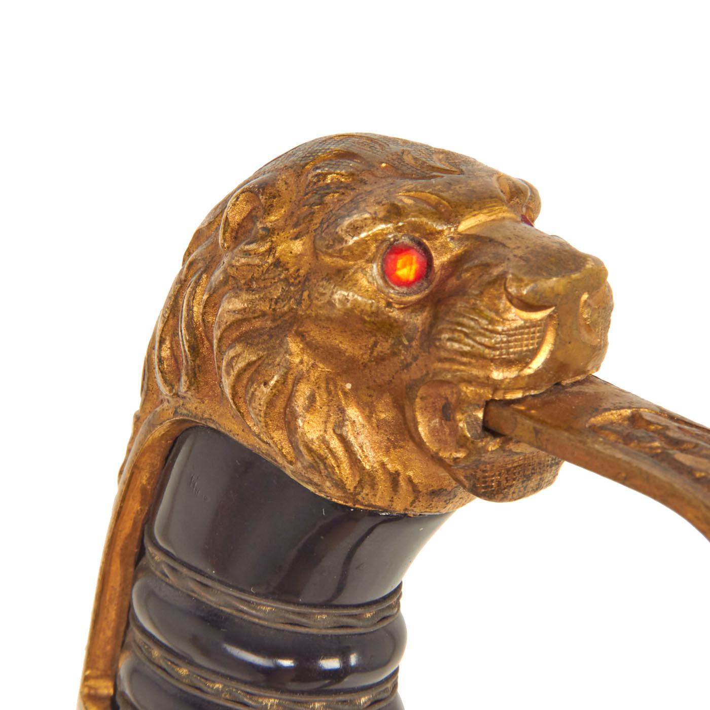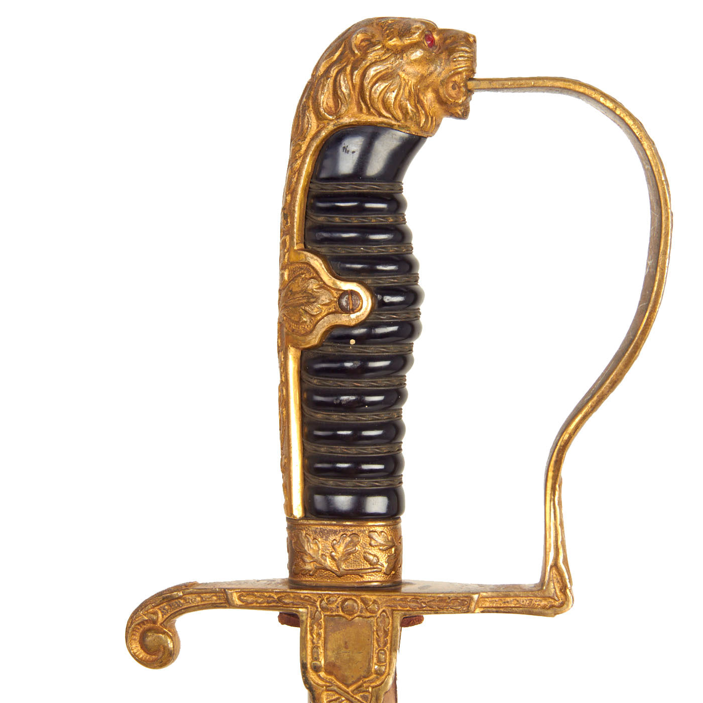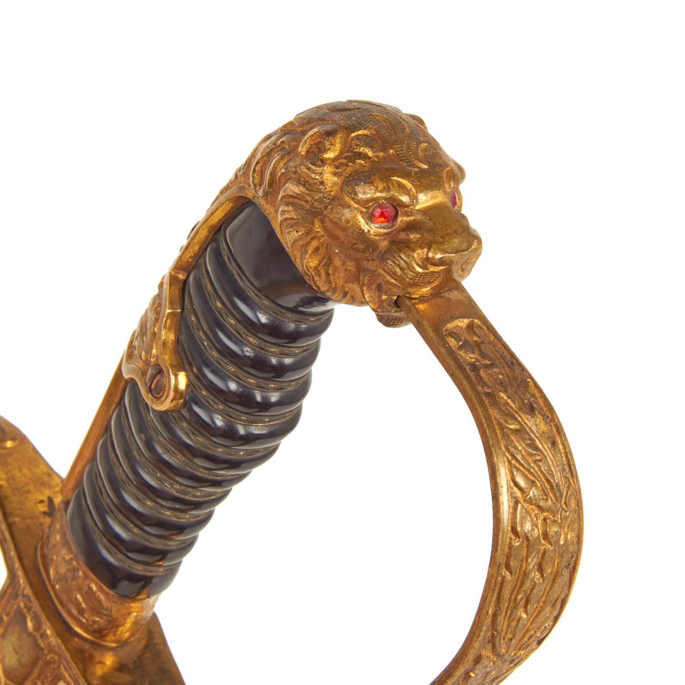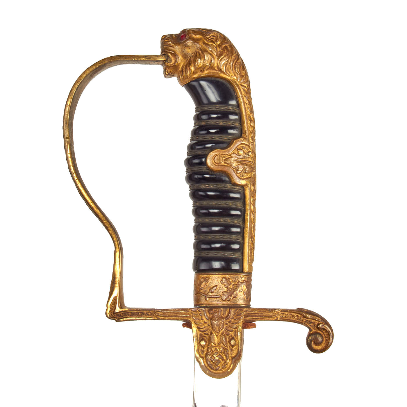 Original Item: Only One Available. This is a beautiful classic Lionhead German WWII Army Officers sword, made by the well known firm of F. W. Höller, Waffenfabrik, of Solingen, Germany, complete with its original scabbard. The all brass alloy hilt consists of a finely detailed lion head cat with engraved backstrap and "P" guard. The Lion is fitted with blood red faceted "jewel" eyes. There is nice detail throughout his whiskers, chin, and muzzle. The handwork is beautifully rendered throughout hilt. The backstrap and side tabs bear the iconic German "Oak Leaves & Acorns" motif, also found on the guard and the grip ferrule.