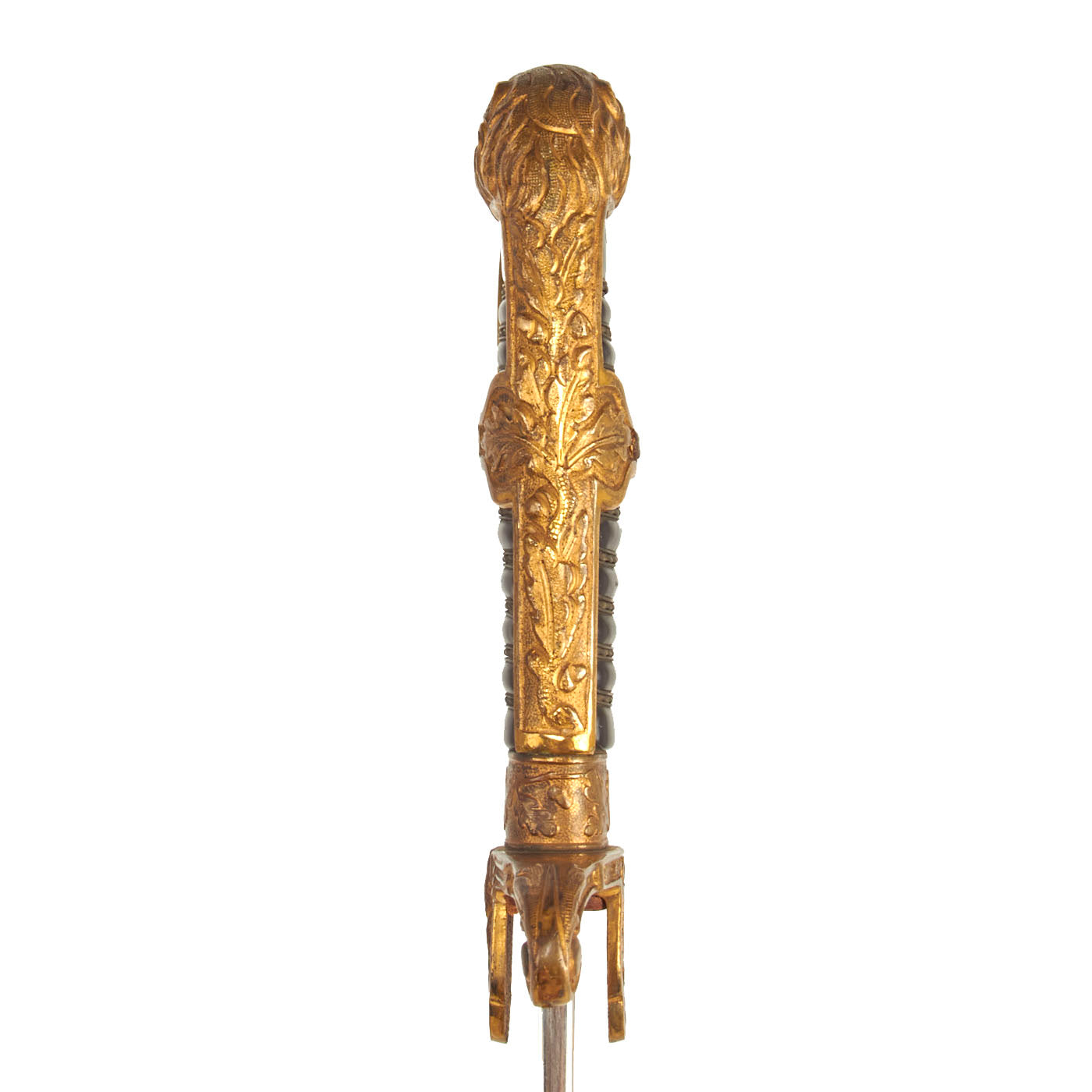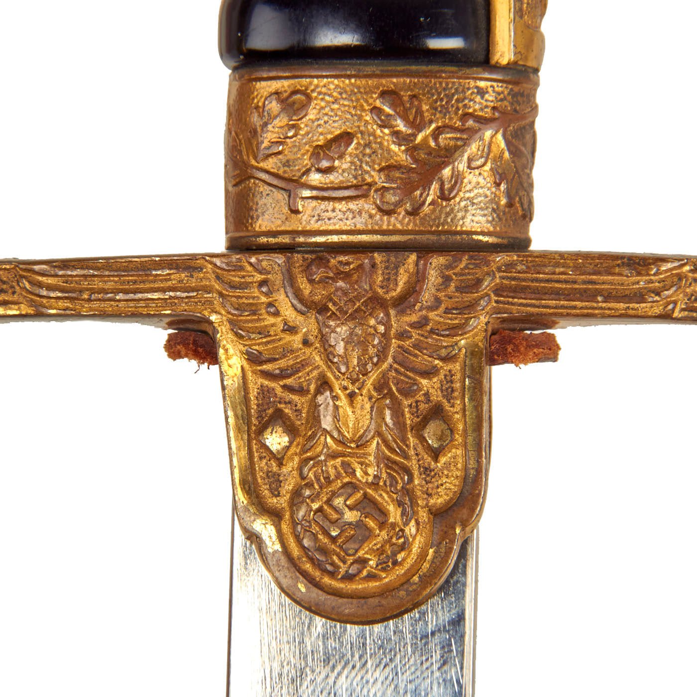 The crossguard has a open winged art deco style eagle which looks to the viewer's left. The breast area of this eagle, as well as the wings, have been hand-enhanced. The original gilding on the hilt is still present in many areas, particularly in the recesses of the design. The reverse has a small plate where a monogram might be added, however it is blank. The original leather blade buffer is still present, and in very good condition. Overall the hilt is still tight on the blade, with no wobble we can detect.