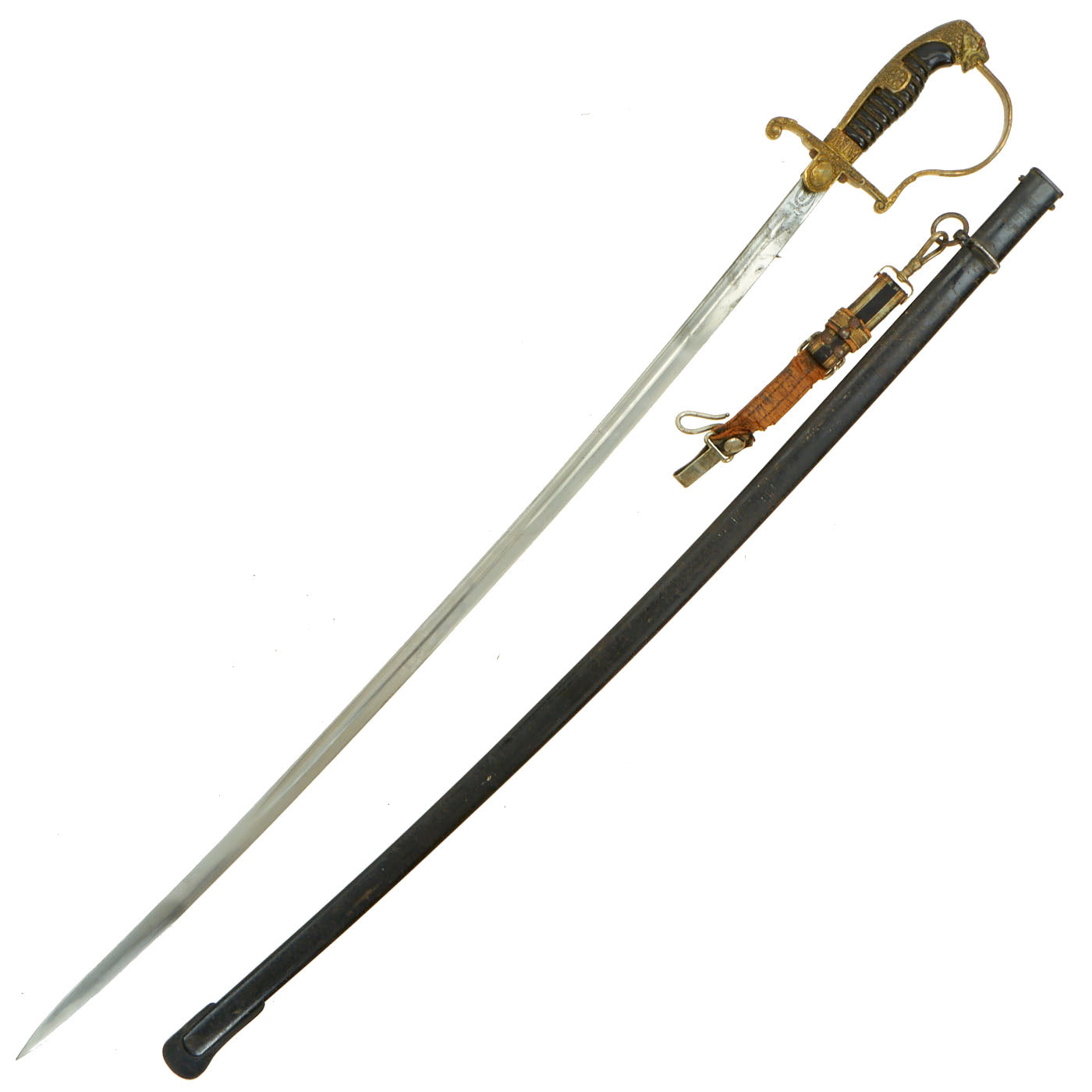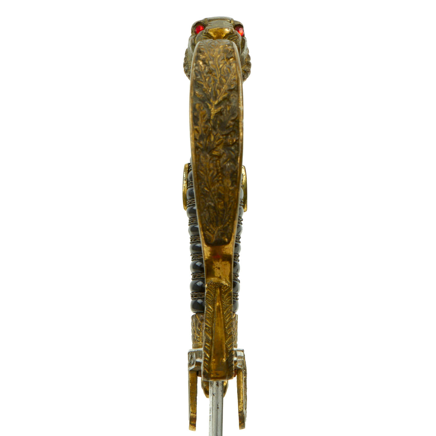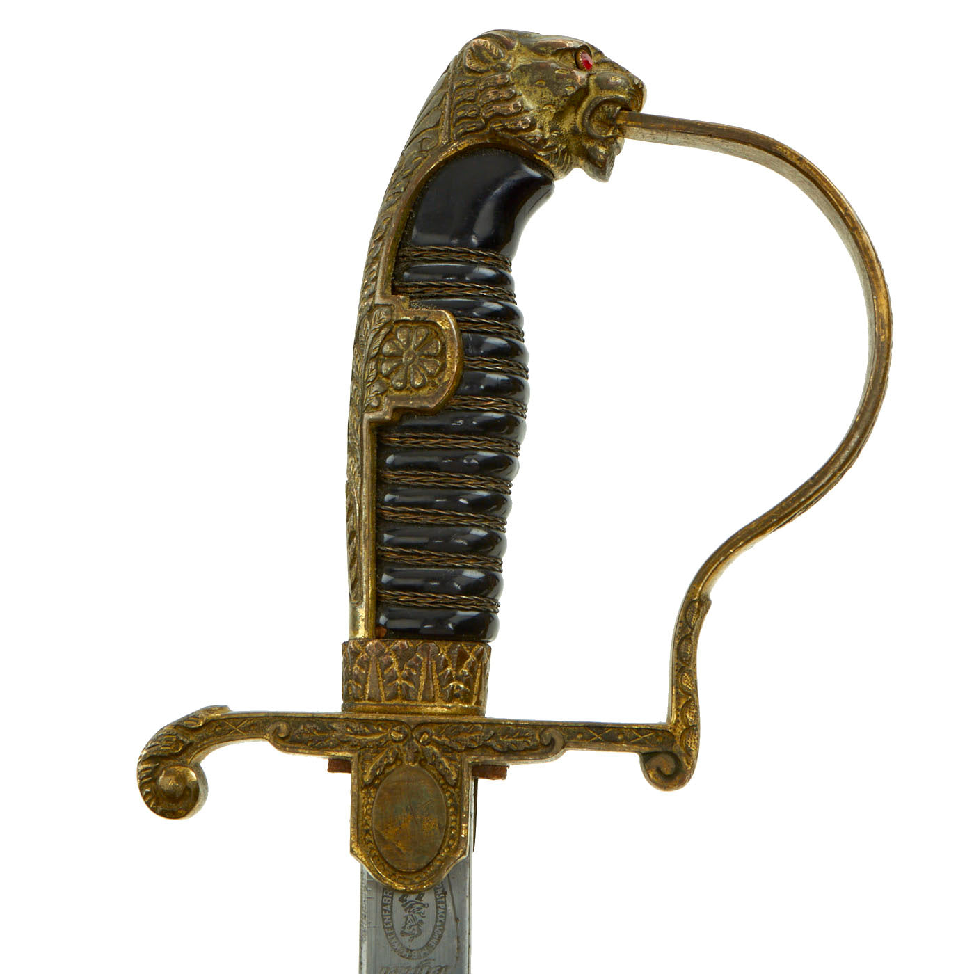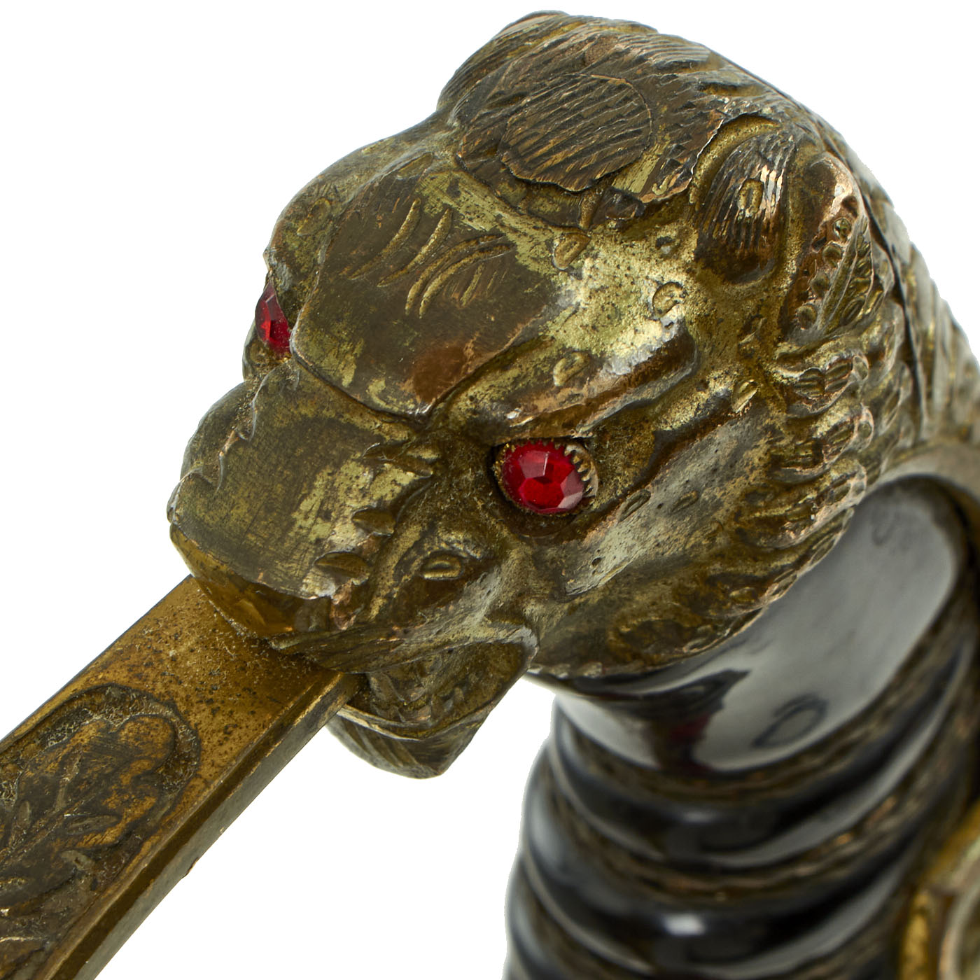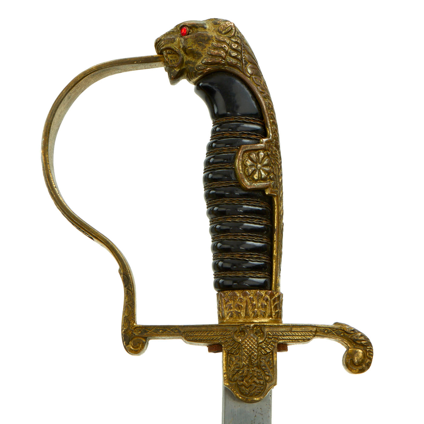 Original Item: Only One Available. This is a beautiful classic Lionhead German WWII Army Officers sword, made by the well known firm of Ernst Pack & Söhne of Solingen, Germany, complete with its original scabbard. The all brass alloy hilt consists of a finely detailed lion head cat with engraved backstrap and "P" guard. The Lion is fitted with blood red faceted "jewel" eyes. There is nice detail throughout his whiskers, chin, and muzzle. The handwork is beautifully rendered throughout hilt. The backstrap and side tabs bear lovely foliate designs, with an art deco style, showing what look to be acanthus leaves. This design is also found on the grip ferrule, while the guard has the iconic German "Oak Leaves & Acorns" motif on the bow.
