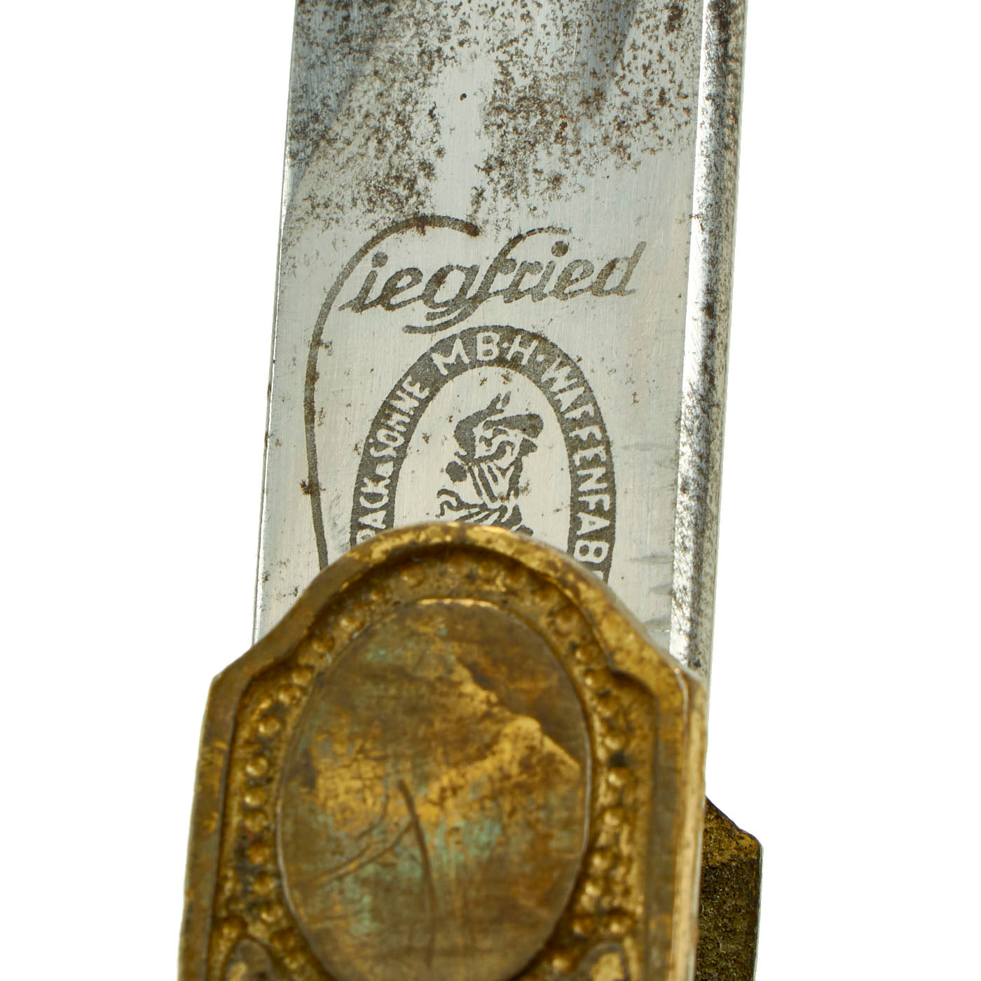 The rear ricasso of the blade is etched with the large "Siegfried" trademark logo of Ernst Pack & Söhne, which is in excellent condition. It is only partially under the chappe of the crossguard, so it can be seen in photogaphs. The mark shows their trademark "Young Siegfried wielding a hammer" Logo, surrounded by a stylized banner. The whole trademark reads: