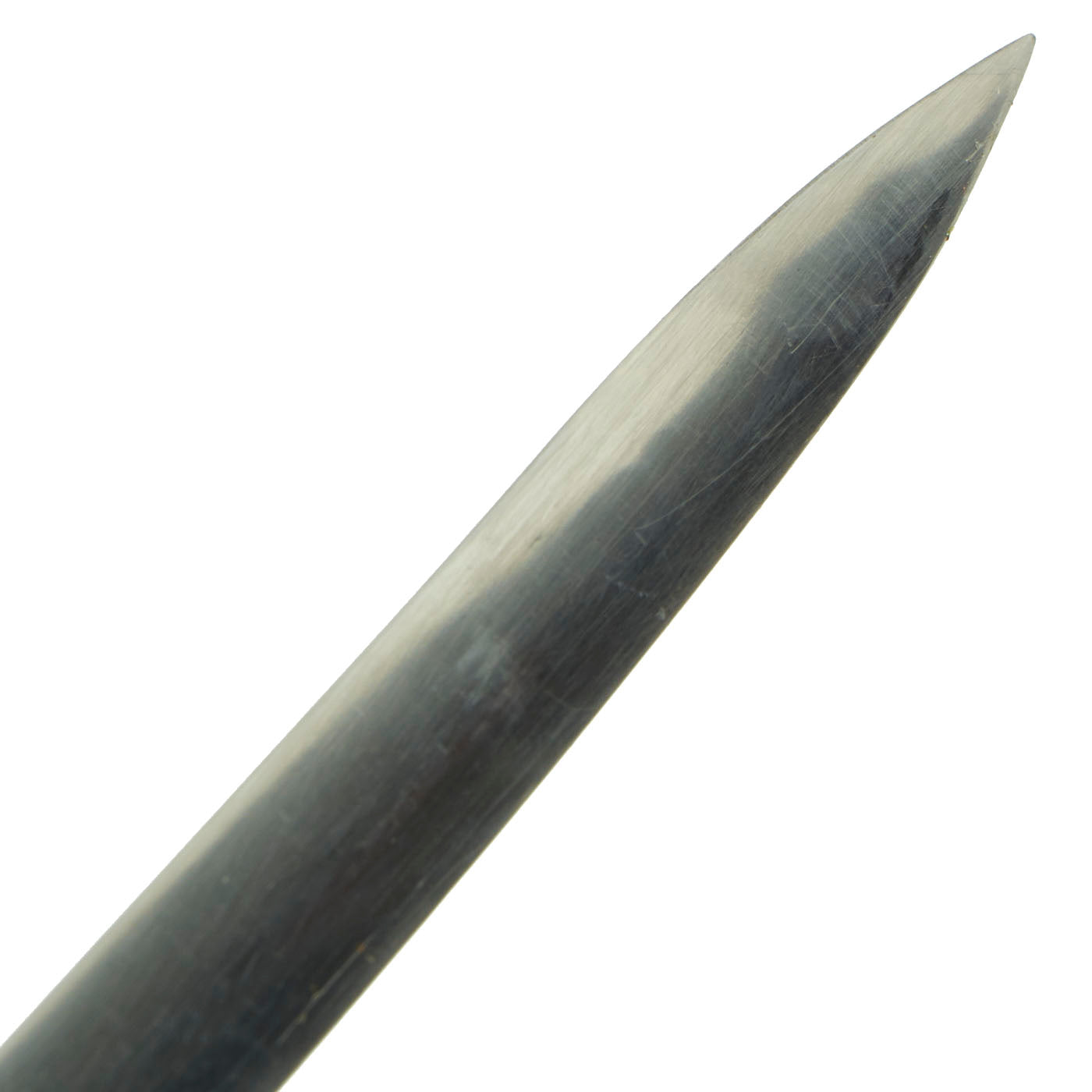 The 30 1/2 inch blade of this example is in very good condition, with some light scuffing in areas. Unlike almost most officer swords we see, this example has a bright polished steel blade, and not a nickel plated one. The factory final grind marks can still be seen over much of the blade, which has some minor staining from finger prints near the ricasso. The edge is still fully blunt, as originally issued, though there are a few dents on the edge, which are minor.