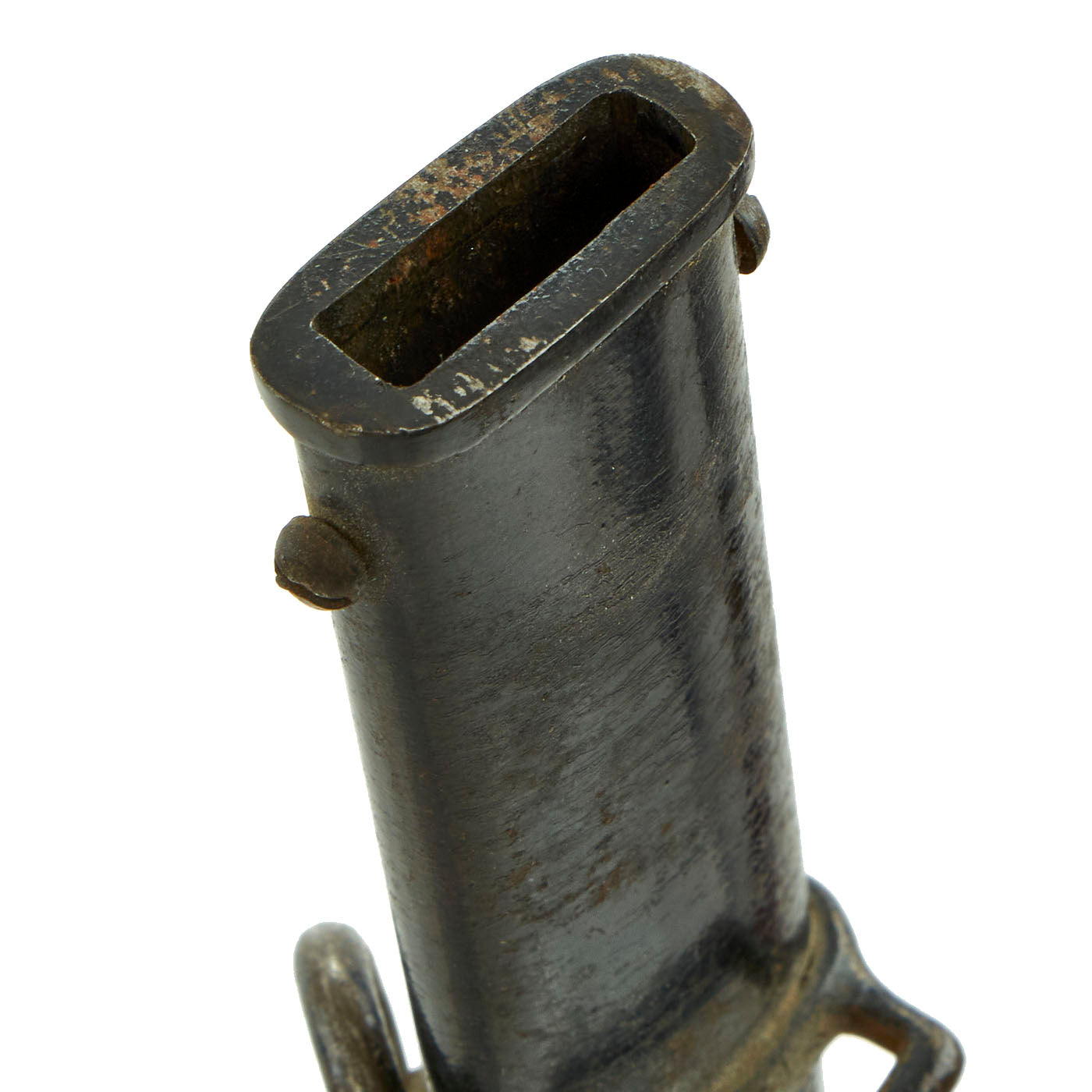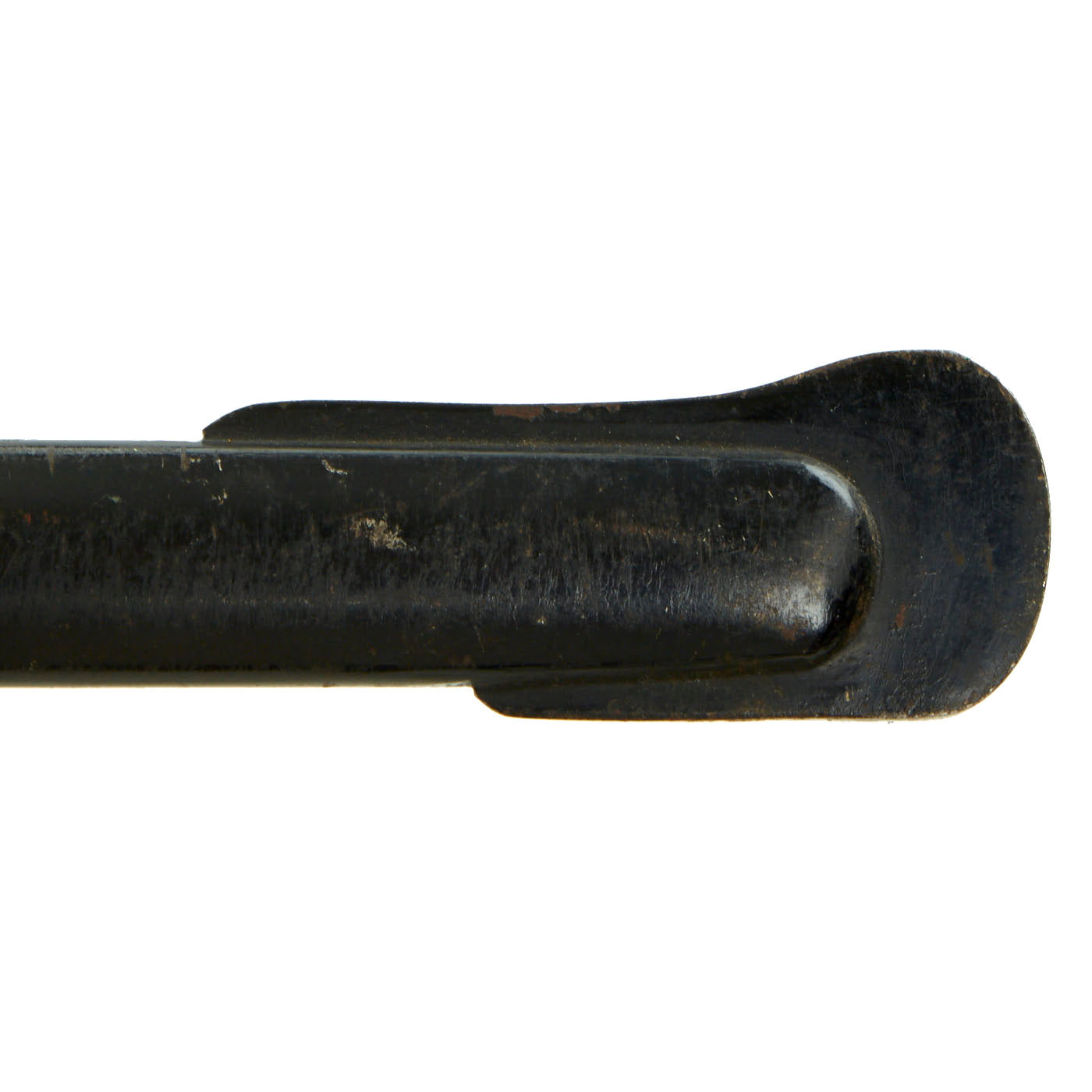The scabbard of this example still has good original factory black enamel, retained at over 75% with no dents that we can see or feel. There are some small areas of missing paint and the expected crazing and checking, however there is no major damage. The drag is missing a lot of the paint, as is typical. There is also a very nice fabric and leather sword hanger installed on the scabbard, which would be use to attach the scabbard to a dress belt. It shows age and deterioration, however these are extremely rare, so they are desirable even in this condition. It still has the hook so that the sword can be hitched up when in close quarters.