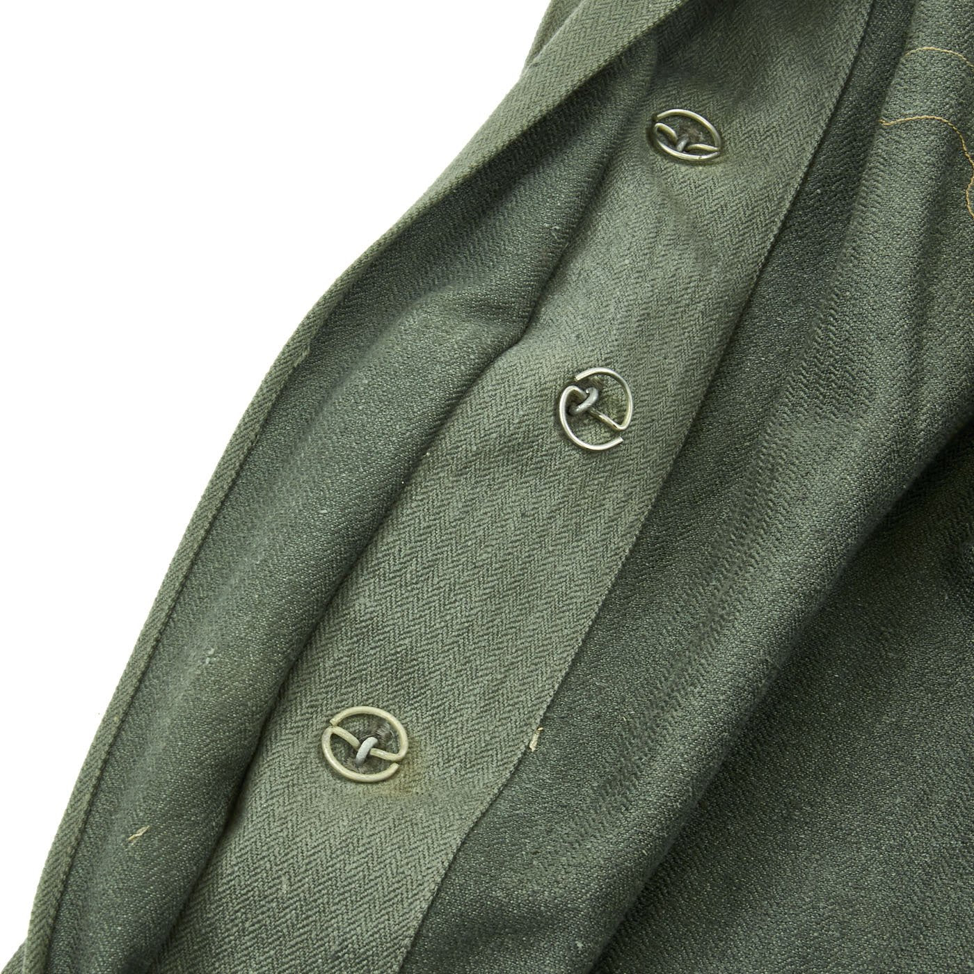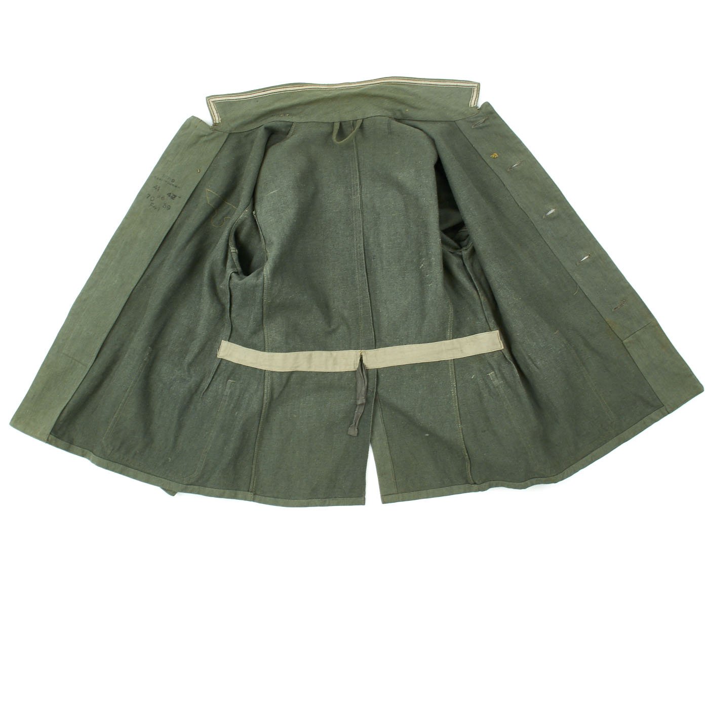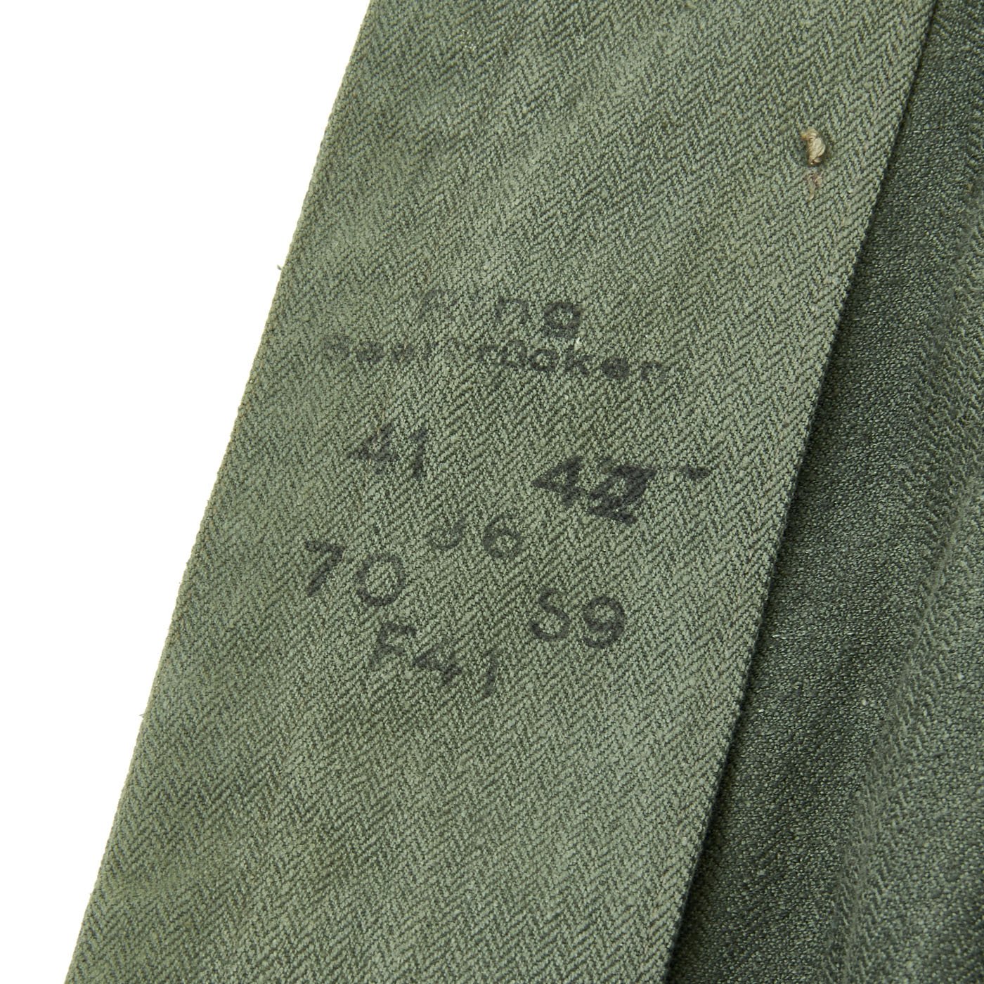 This near mint condition Drilljacke features five pebbled front buttons which are removable. The buttons are manufacturer marked with a letter A. The tunic bears ink maker markings, inspection markings, size markings and F41 which we believe stands for 1941 production date. It features a BeVo style embroidered breast eagle and Sergeant collar piping. Size is large and fits a man 5'10 and 180 lbs. We approximate the size to a US 40.