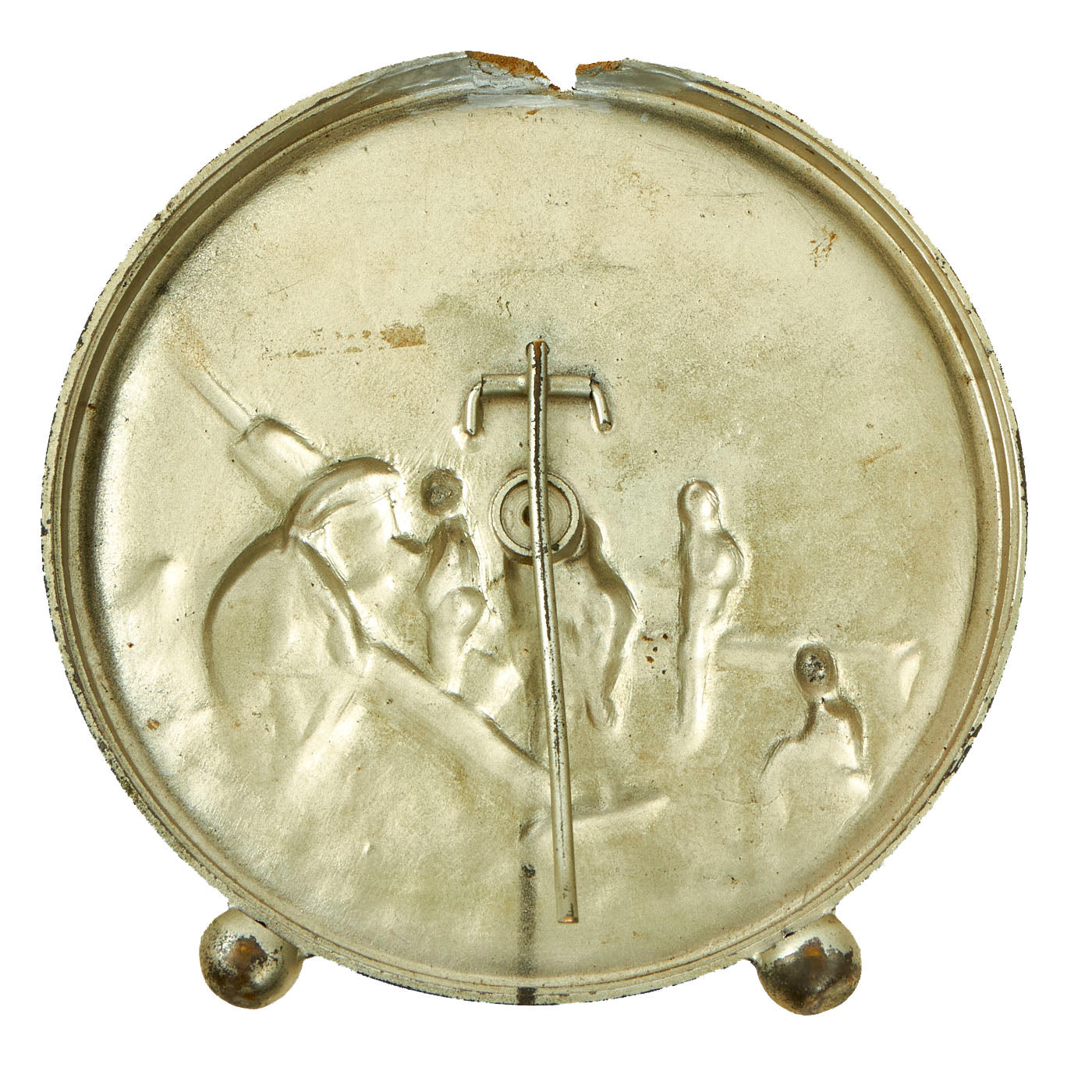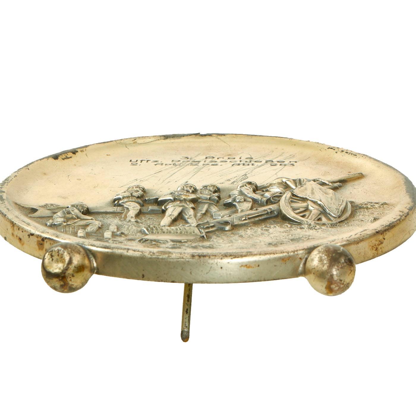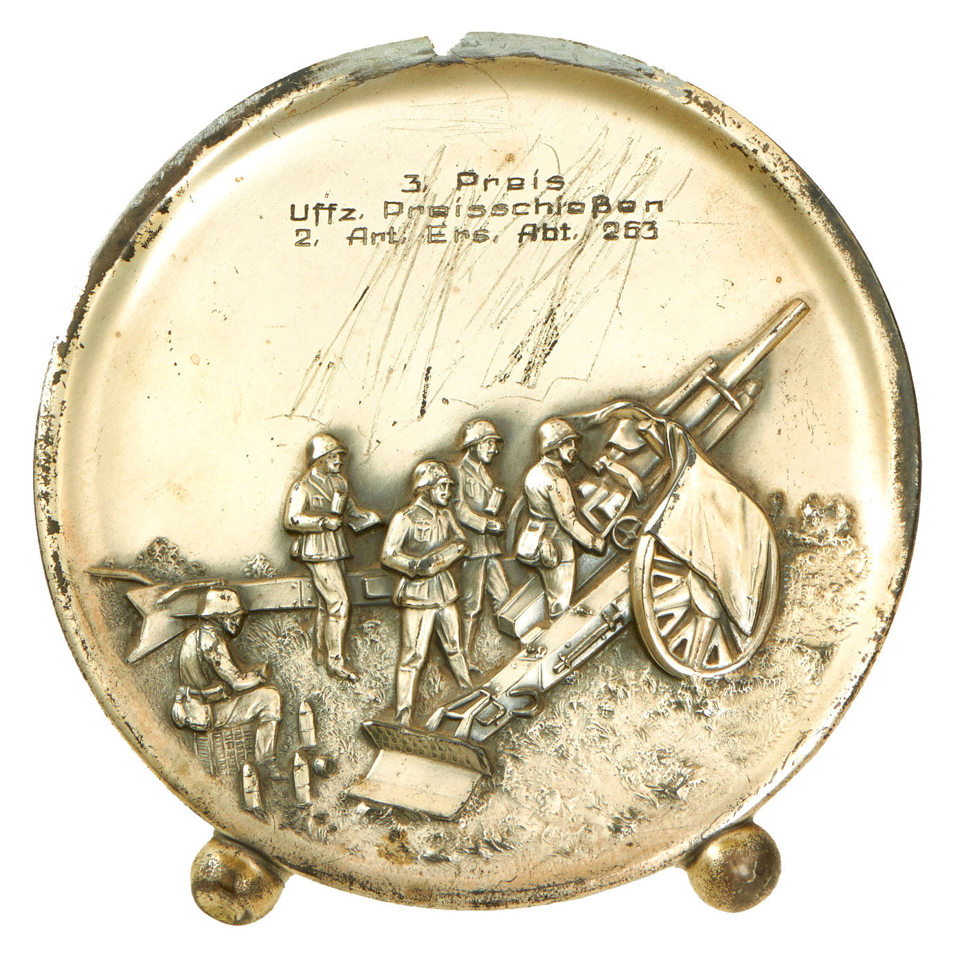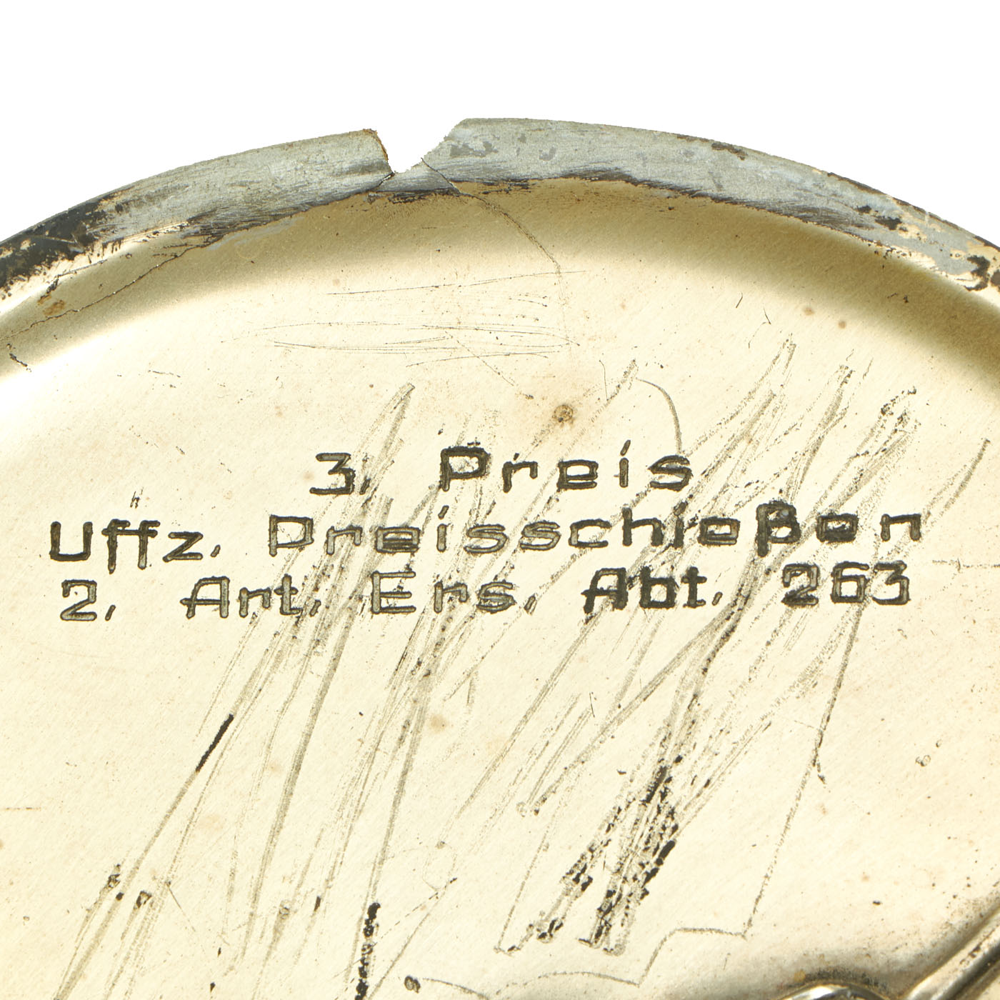 Original Item: Only One Available. This is a very interesting German WWII Shooting Prize plaque, measuring about 5 3/4" in diameter. Cast from non-magnetic metal, it has what looks to be an aluminized paint coating over most of the surface. It has two round "feet" on the bottom, and there is a wire stand on the back that allows it to stand up. The front is embossed with a German Artillery team manning an artillery piece. Above this is the following hand-engraved inscription: