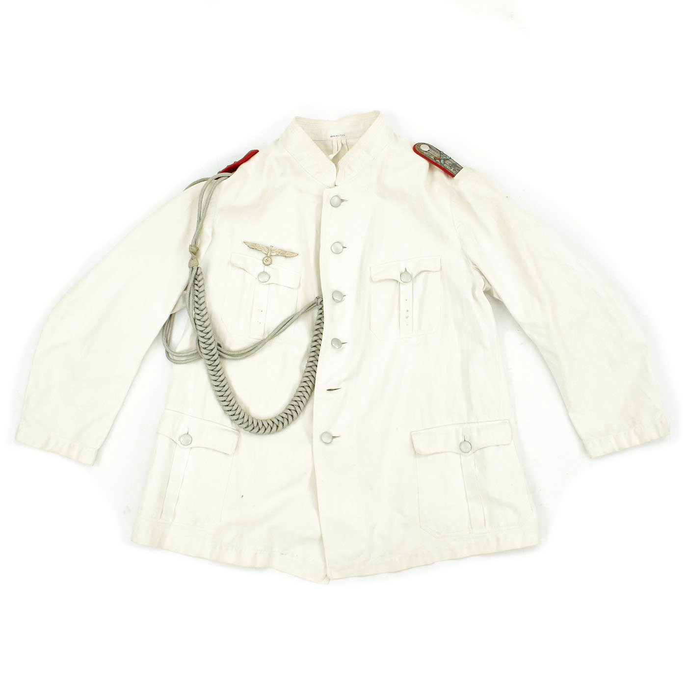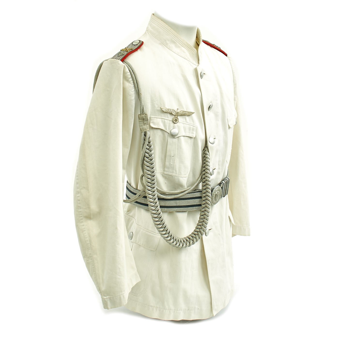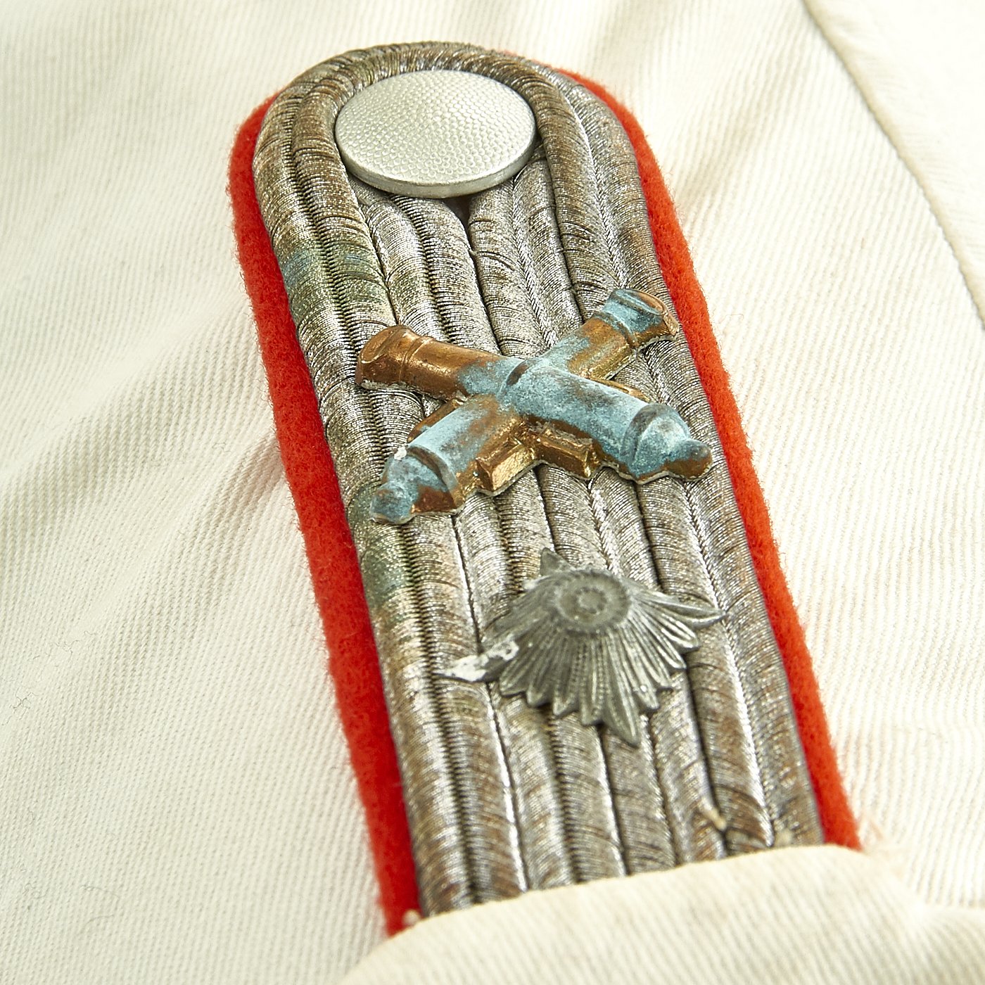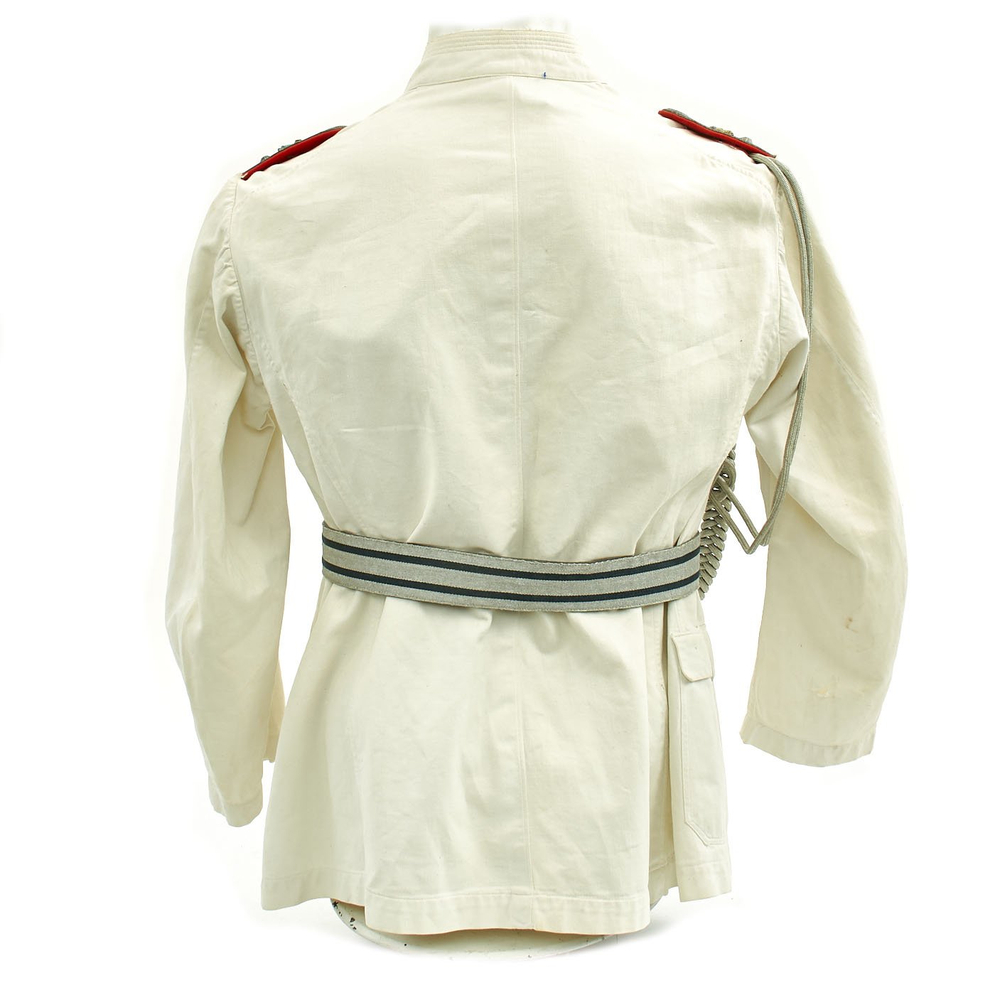 Original Item: Only One Available. This wonderful condition summer tunic is fabricated from a white cotton. The shoulders are adorned with Artillery leutnant shoulder boards incorporating rows of silvered aluminum wire, the end creating a button hole for a pebbled aluminum button, the sides and underside are in red wool, secured in place by a red wool strap. The shoulder boards also bear brass crossed cannon pins.