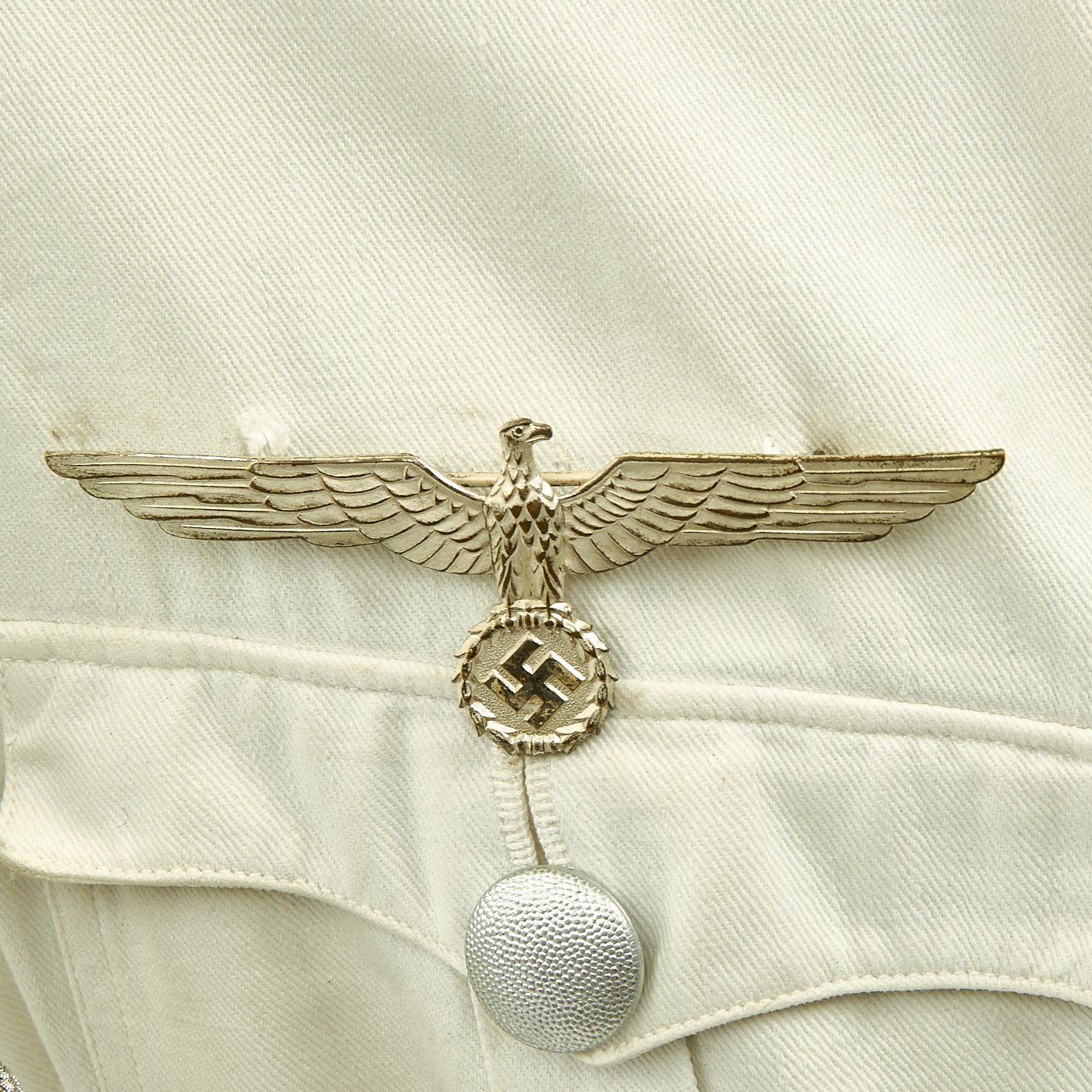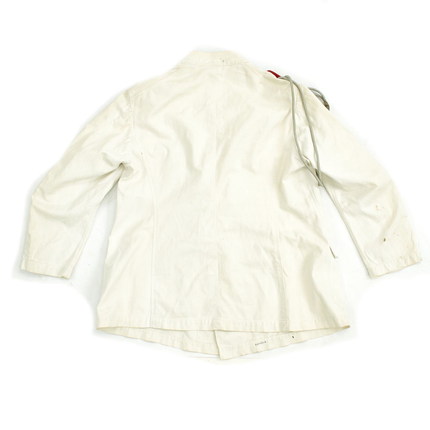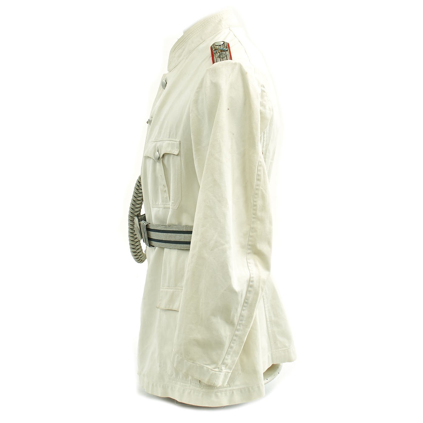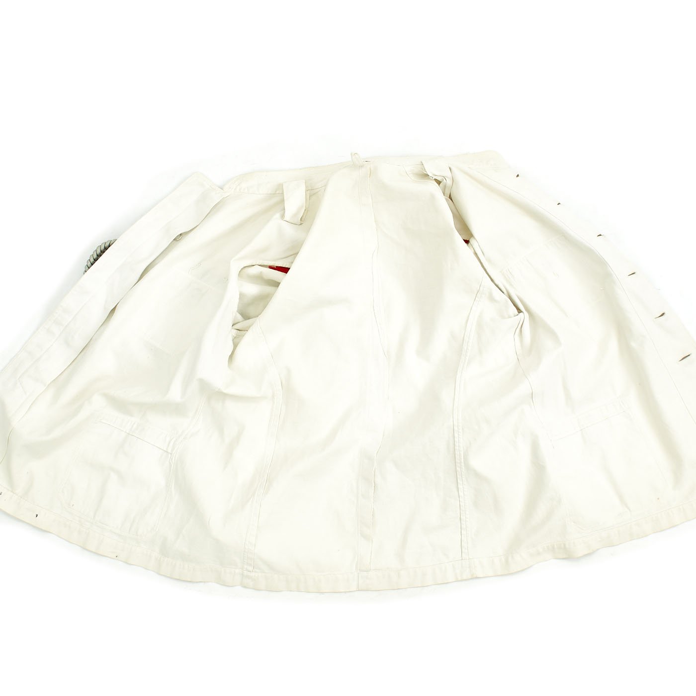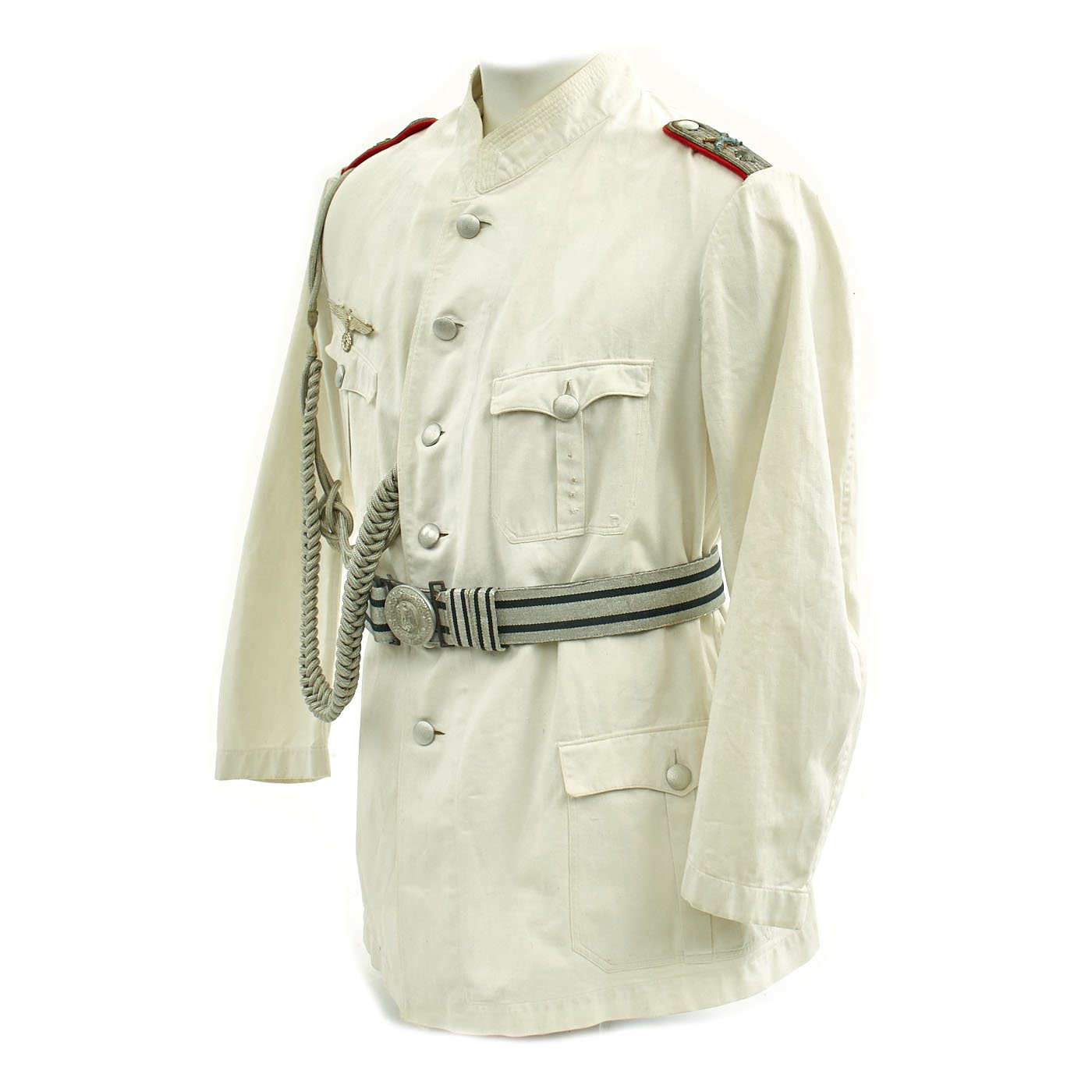 Original Item: Only One Available. This wonderful condition summer tunic is fabricated from a white cotton. The shoulders are adorned with Artillery leutnant shoulder boards incorporating rows of silvered aluminum wire, the end creating a button hole for a pebbled aluminum button, the sides and underside are in red wool, secured in place by a red wool strap. The shoulder boards also bear brass crossed cannon pins.