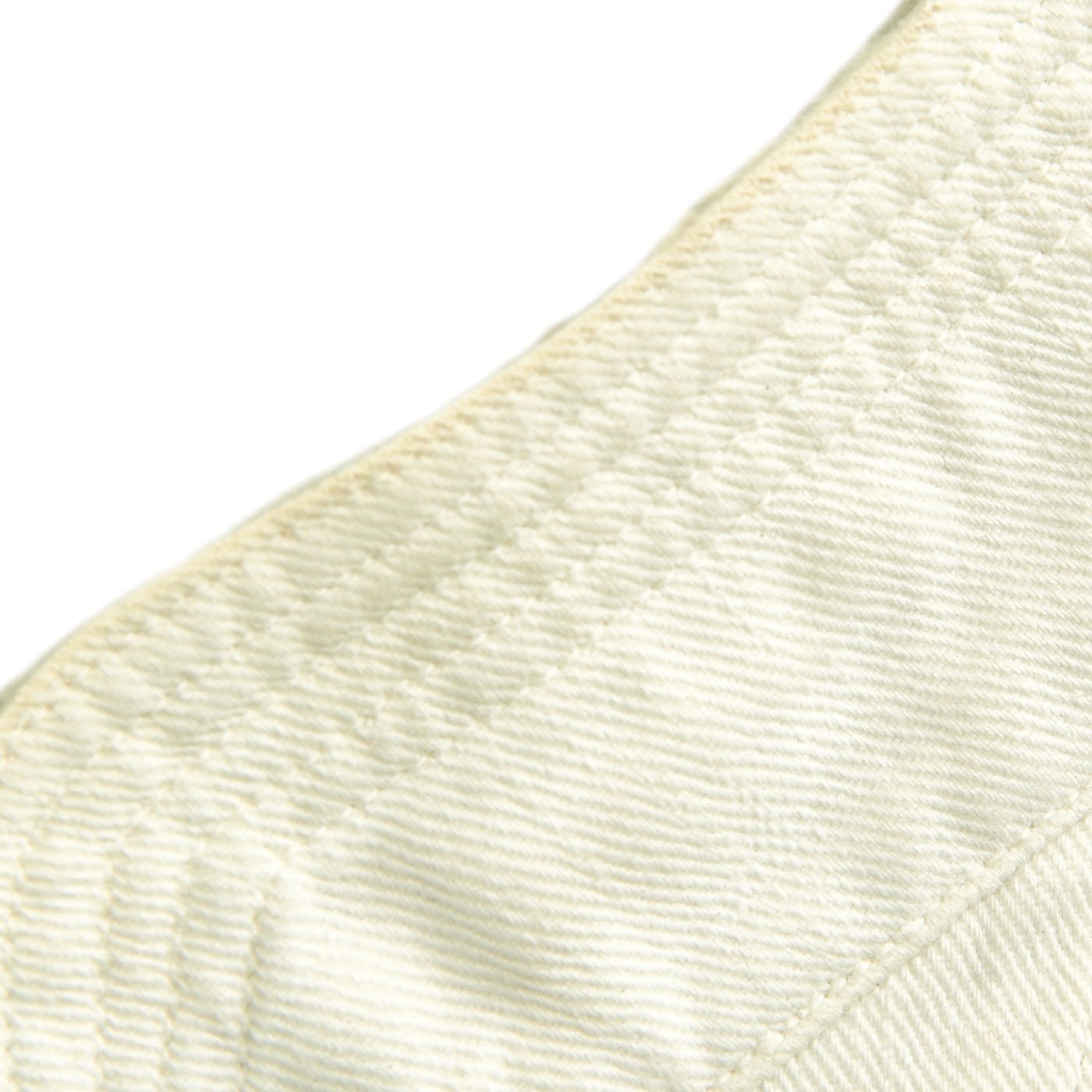 There are four pockets on the front, one on each breast and larger ones at the waist on both sides, each designed with a decorative pleat and pebbled buttons, each of which is maker marked and are held in place by rings on the underside and embedded in the pleat.