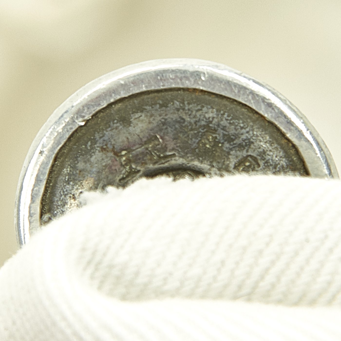 The right breast above the pocket is enriched with a Summer Army breast eagle insignia pin held in place via two horizontally-aligned vertical loops in white threading. Silver braided shooting award cord, and embroidered name tag to inside neck. The front has a vertical row of four metal buttons with pebbled uppers, also maker marked held in place by rings on the underside and visible on the inside of the tunic.