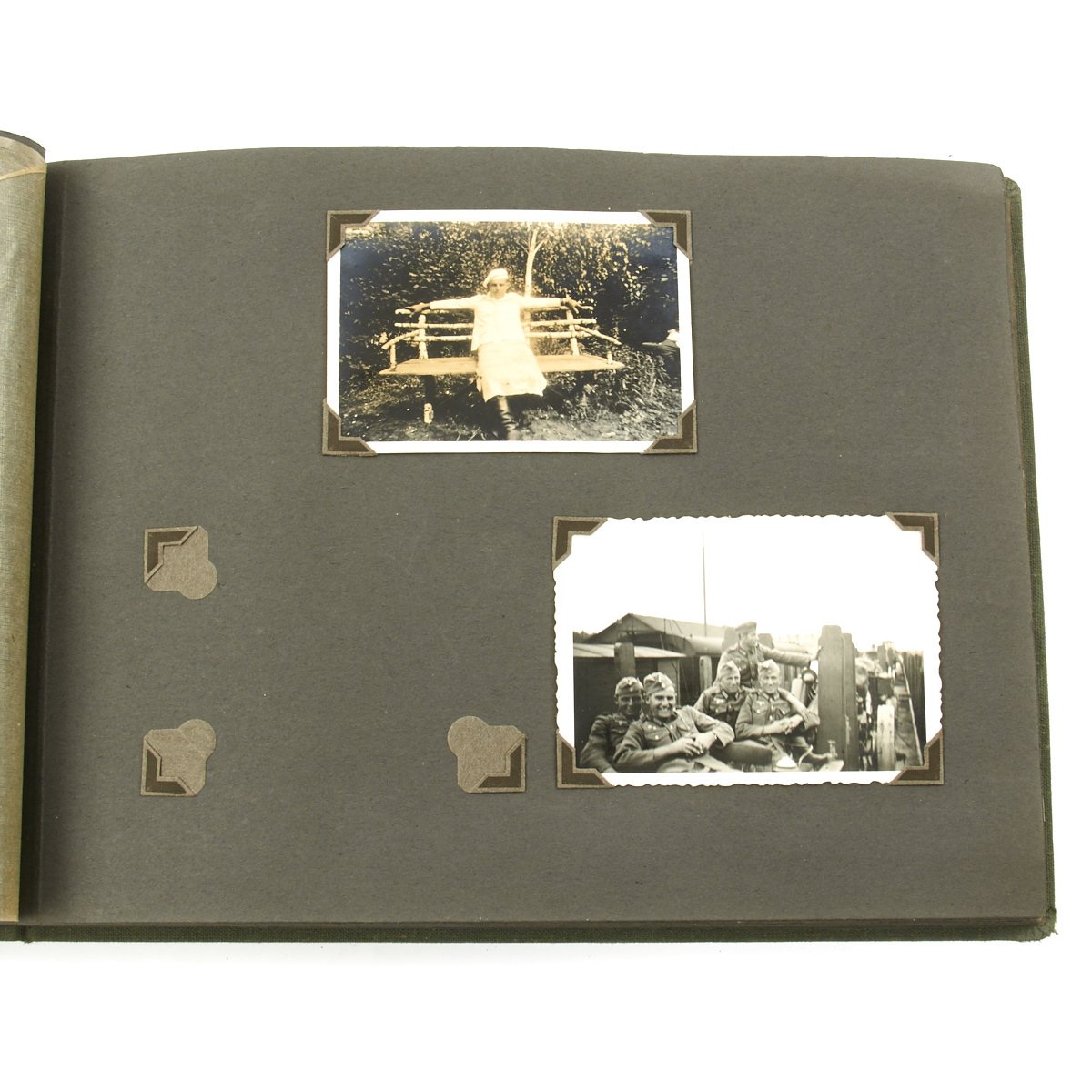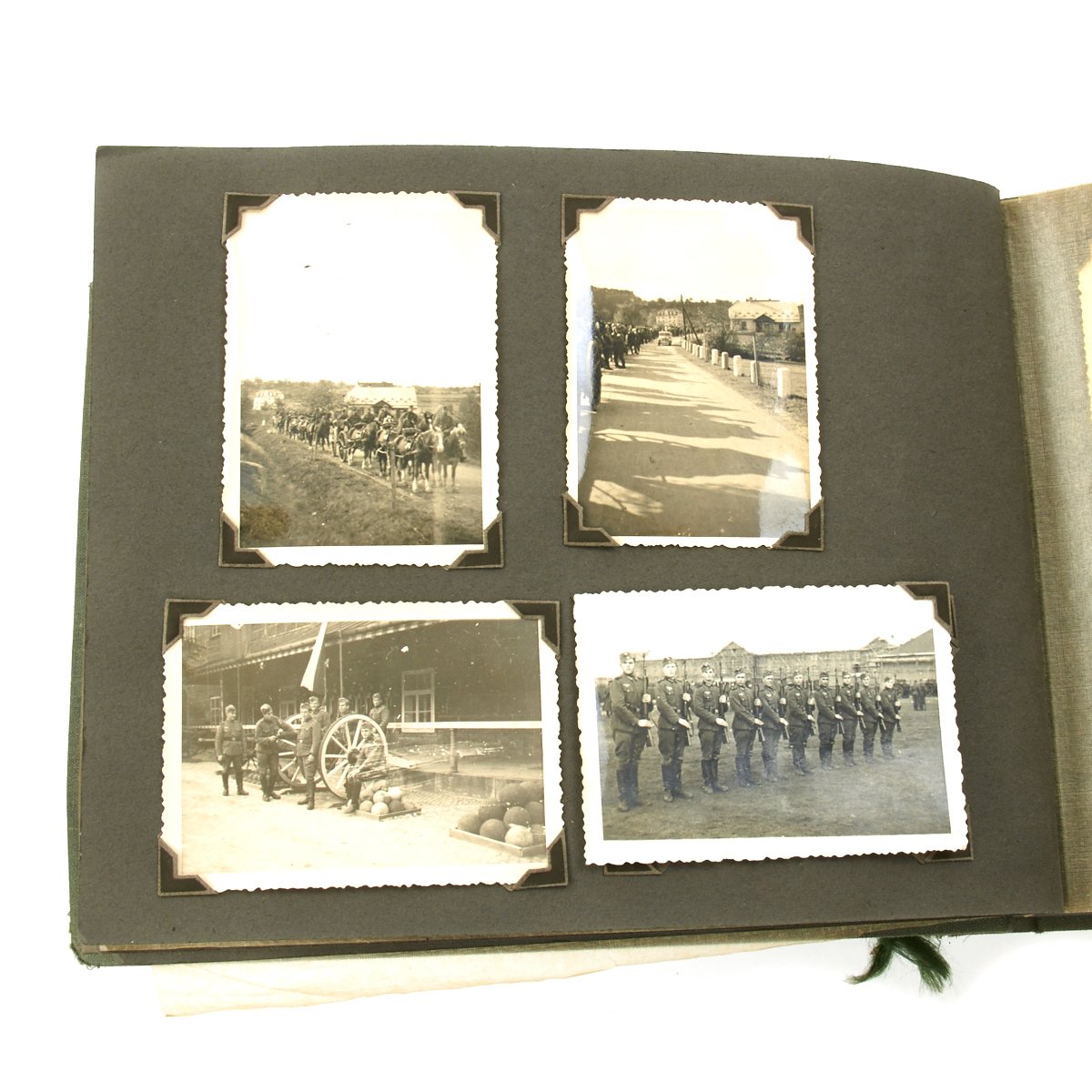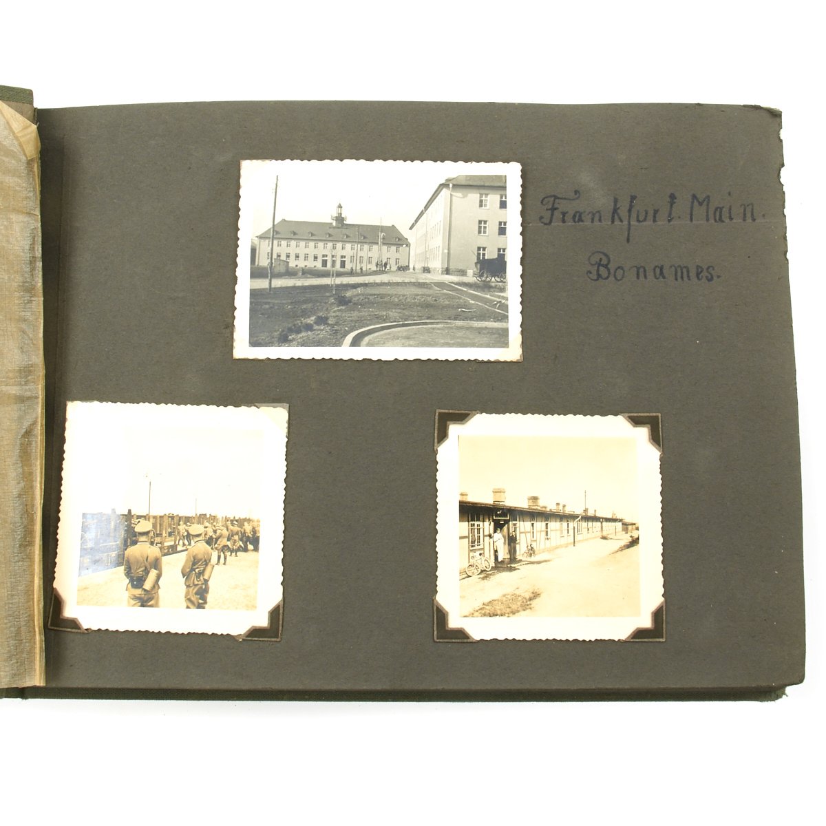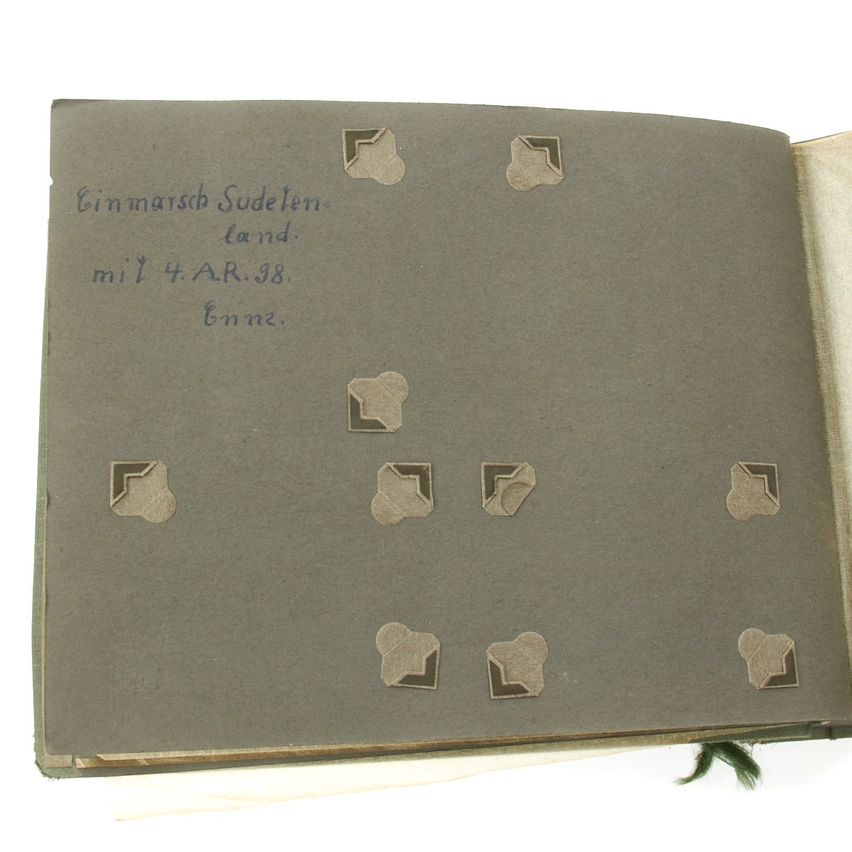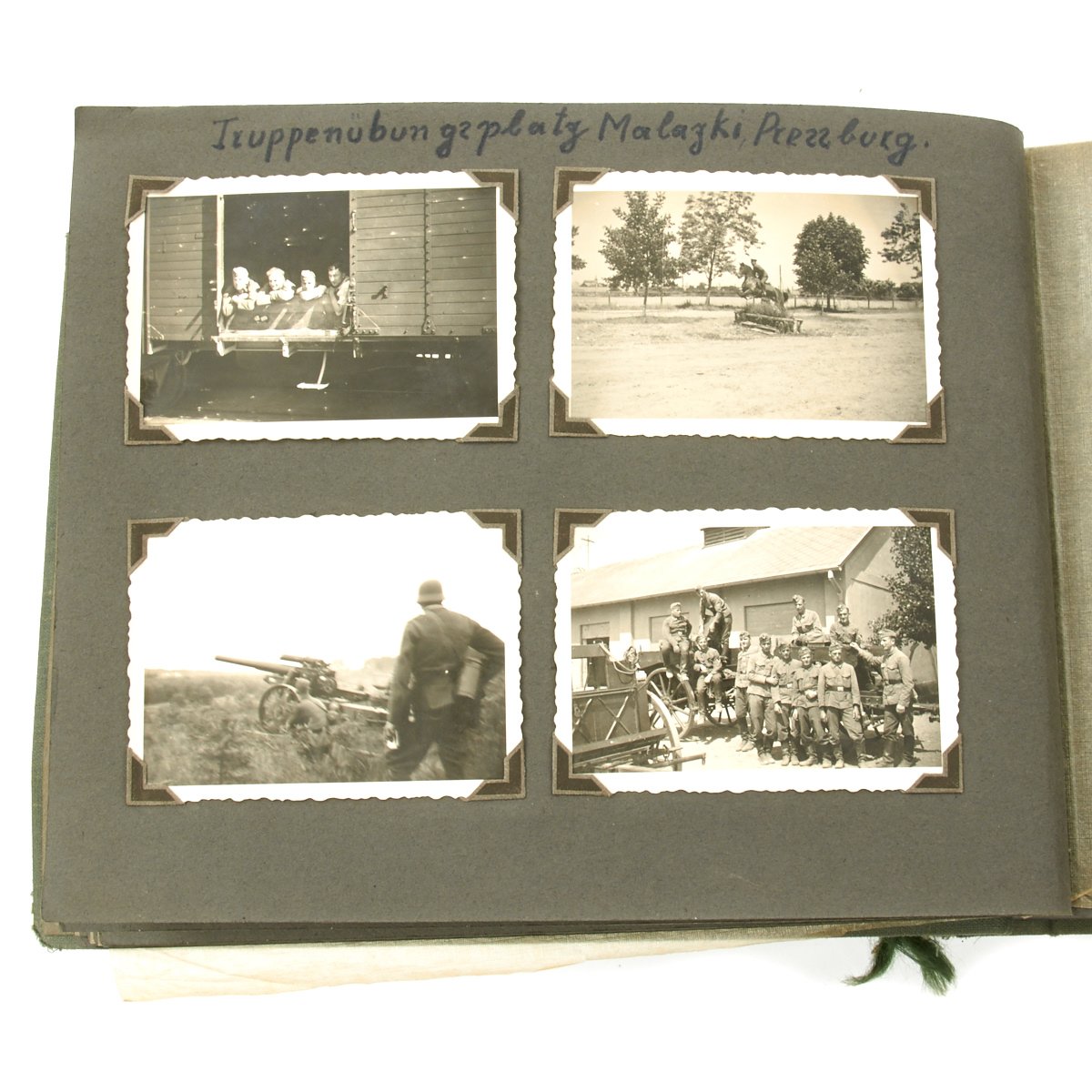 Original Item: One-of-a-kind-set. A wonderful personal photo album that measures approximately 10" x 7". Contains approximately 125 photos on 50 pages with onion skin partitions. Some pages have handwritten locations and other information such as FRANKFURT MAIN BONAMES and EINMARSCH SUDETENLAND Mit 4. A.R. 98. ENNZ, EINMARCH POLEN, KLEINER FEDLZUG FRANKREICH and many others. Front cover features silver embossed helmet and 7. Battr. An. Regt. 15 over Meine Dienstzeit (My Military Service). All photos are on period paper, have corner stays and appear to be totally original to the album. Some pages are missing photos. Overall a really nice hard to find photo album from the a German Artilley soldier during World War Two.