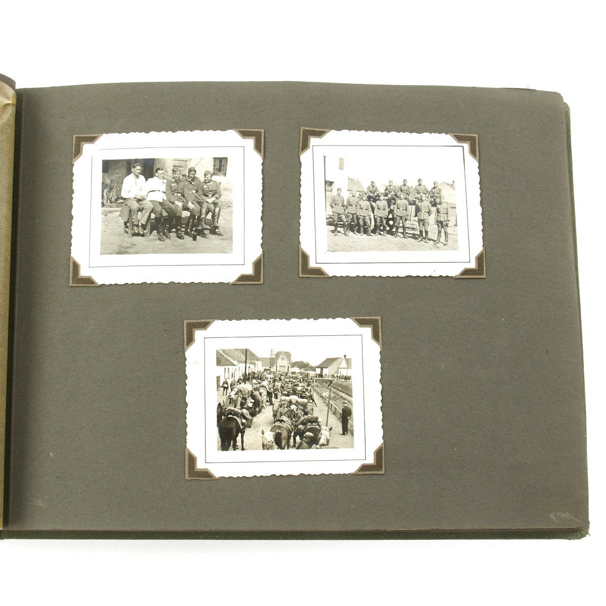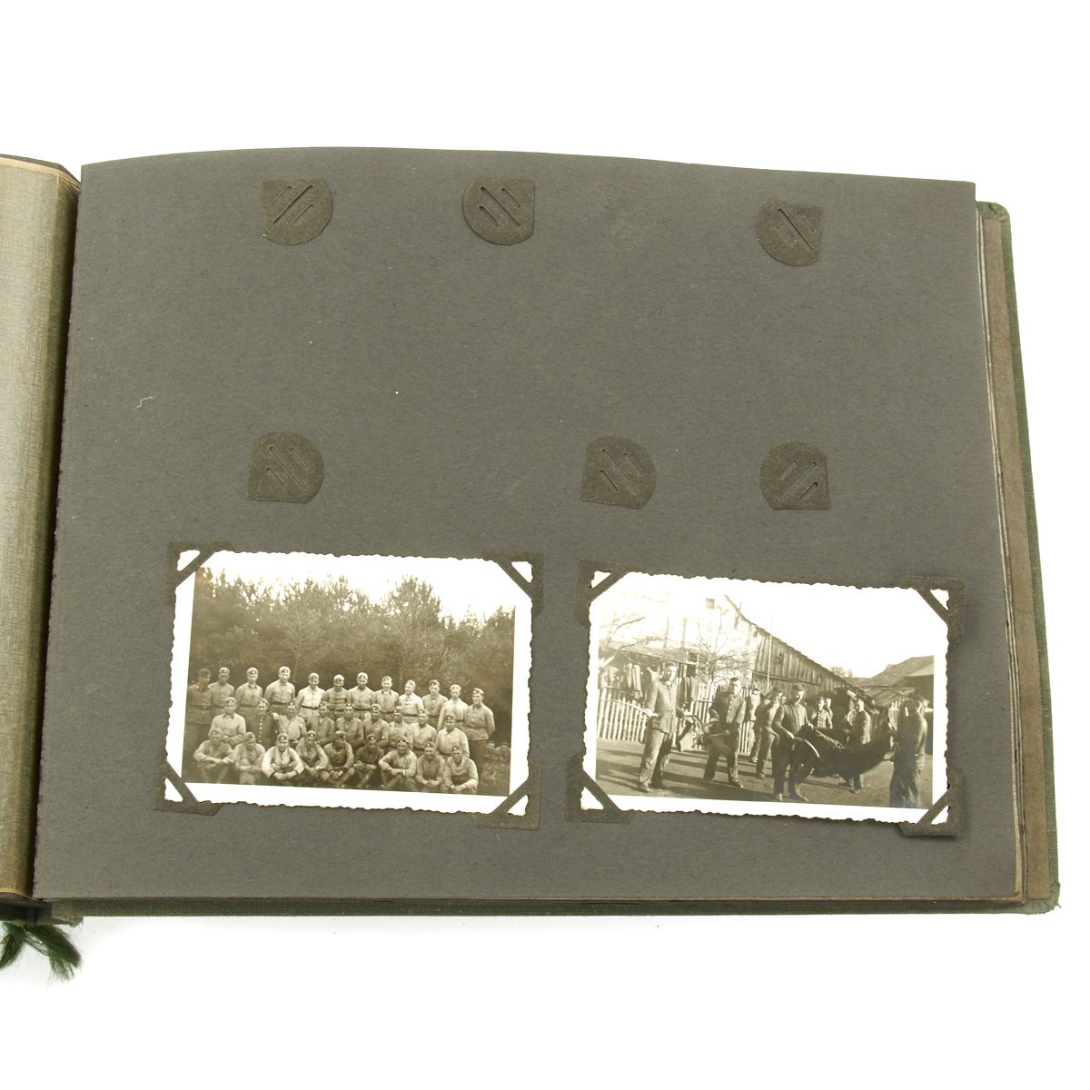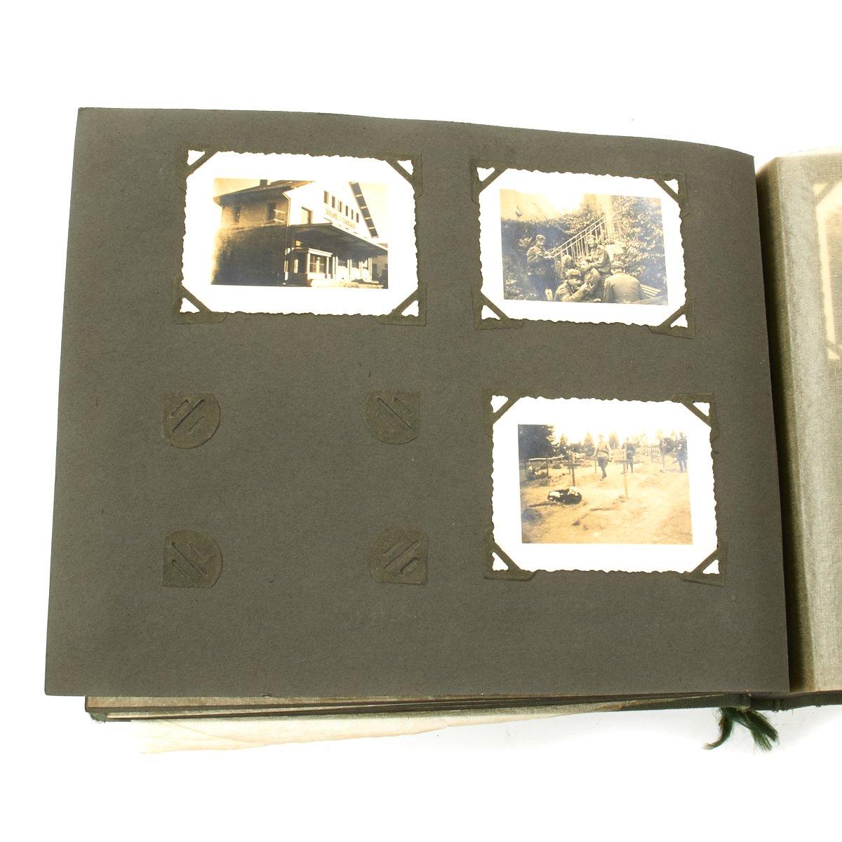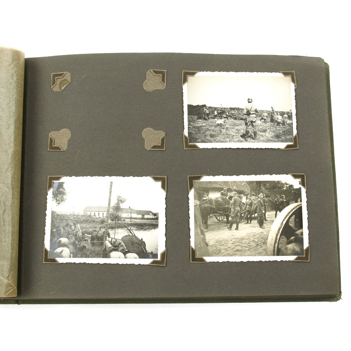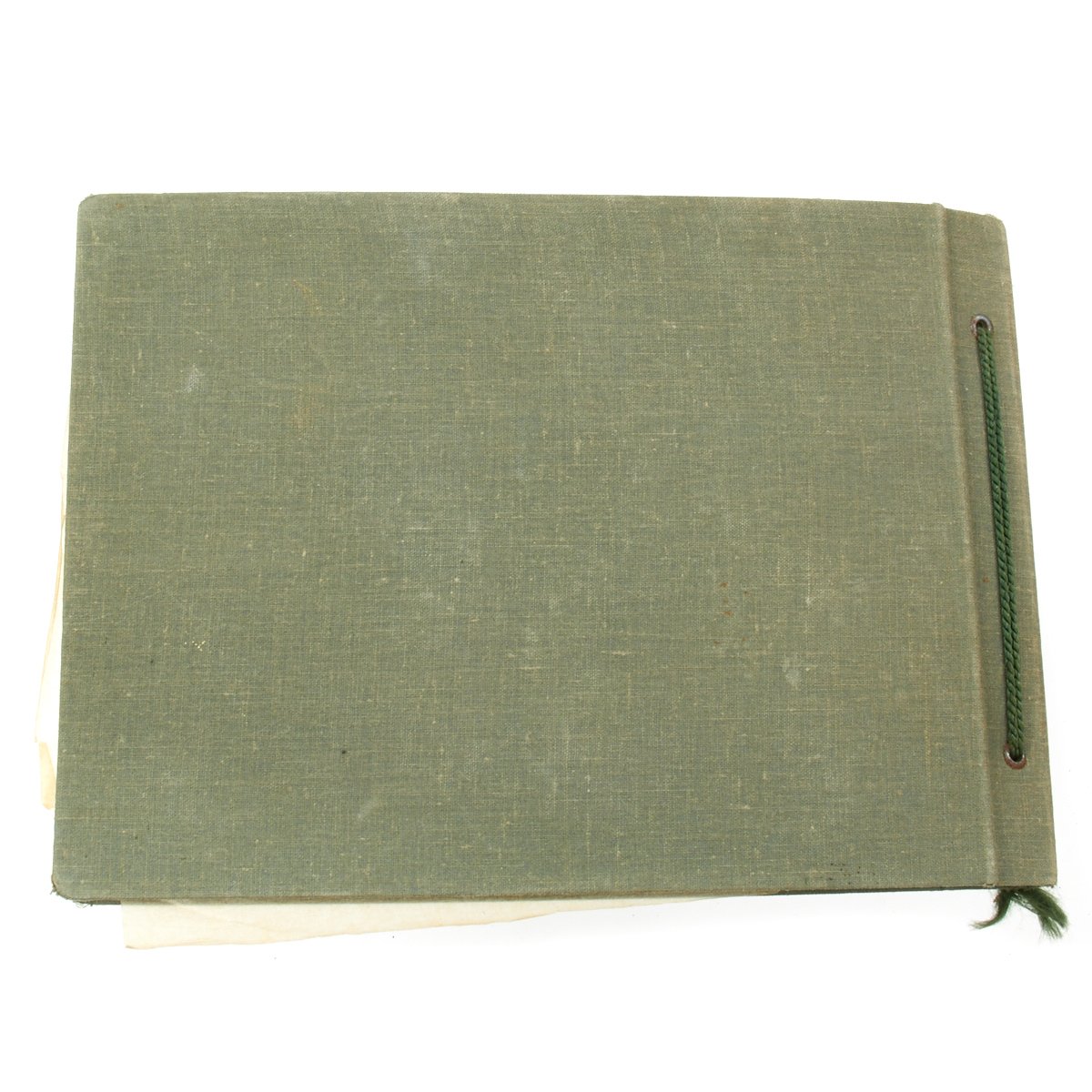 Original Item: One-of-a-kind-set. A wonderful personal photo album that measures approximately 10" x 7". Contains approximately 125 photos on 50 pages with onion skin partitions. Some pages have handwritten locations and other information such as FRANKFURT MAIN BONAMES and EINMARSCH SUDETENLAND Mit 4. A.R. 98. ENNZ, EINMARCH POLEN, KLEINER FEDLZUG FRANKREICH and many others. Front cover features silver embossed helmet and 7. Battr. An. Regt. 15 over Meine Dienstzeit (My Military Service). All photos are on period paper, have corner stays and appear to be totally original to the album. Some pages are missing photos. Overall a really nice hard to find photo album from the a German Artilley soldier during World War Two.