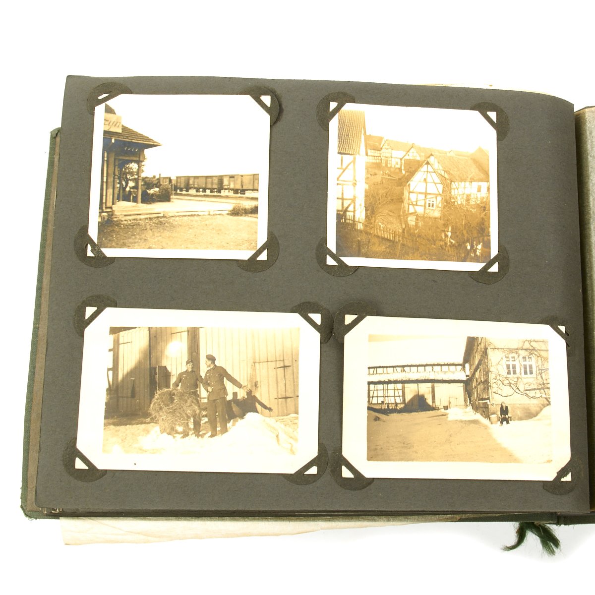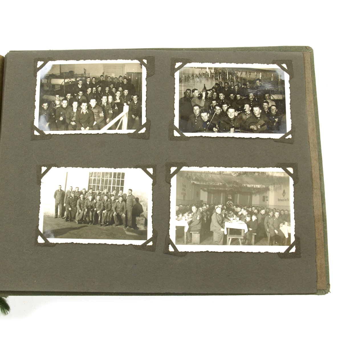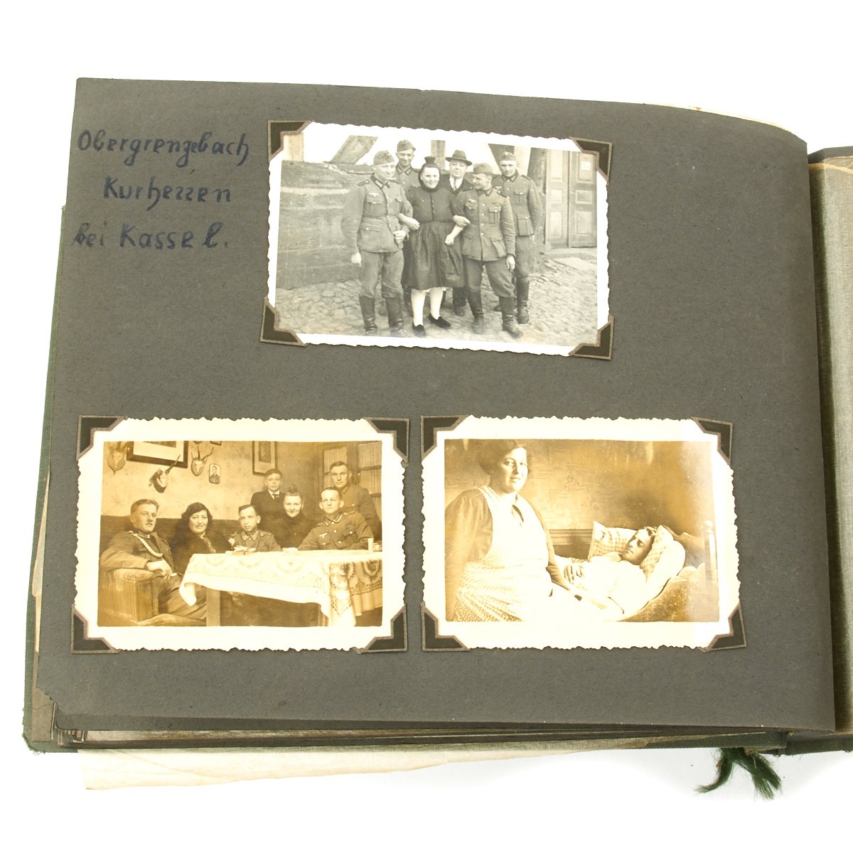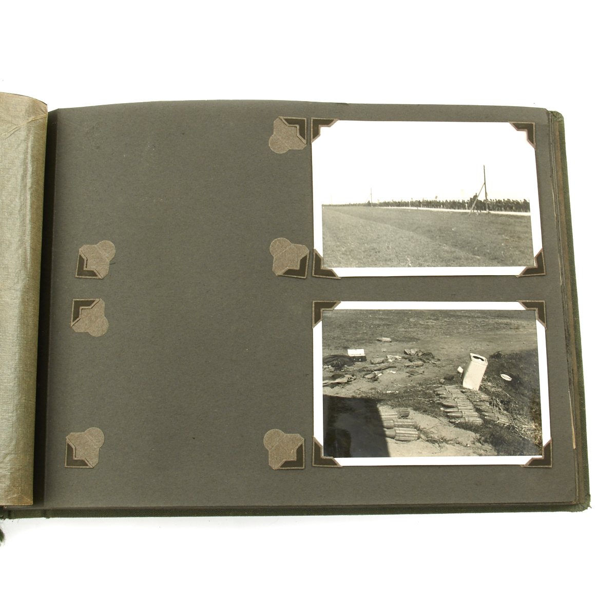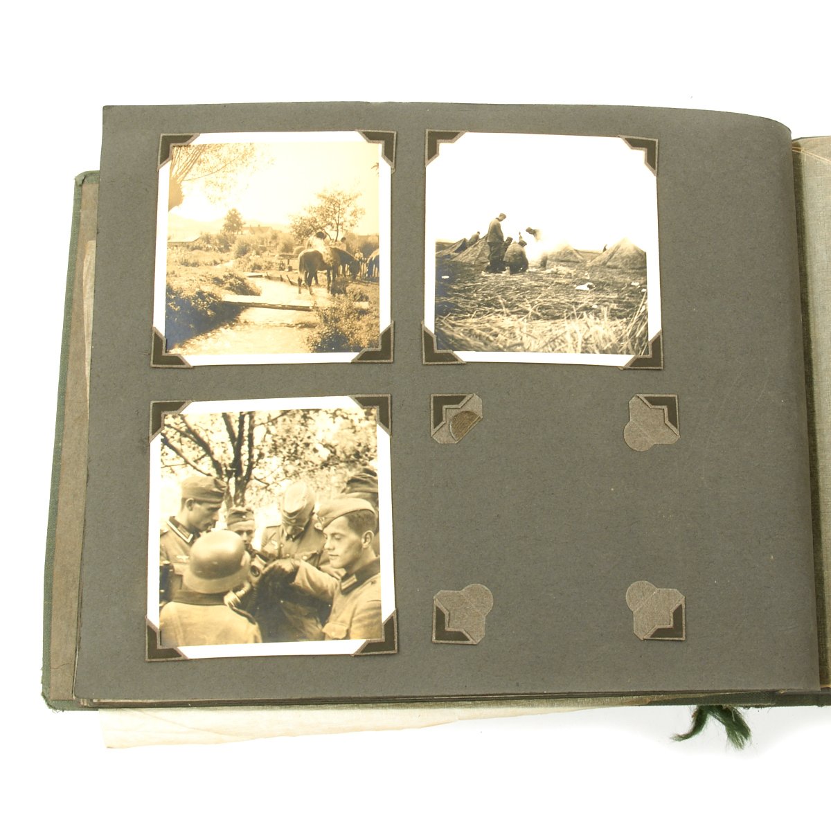 Original Item: One-of-a-kind-set. A wonderful personal photo album that measures approximately 10" x 7". Contains approximately 125 photos on 50 pages with onion skin partitions. Some pages have handwritten locations and other information such as FRANKFURT MAIN BONAMES and EINMARSCH SUDETENLAND Mit 4. A.R. 98. ENNZ, EINMARCH POLEN, KLEINER FEDLZUG FRANKREICH and many others. Front cover features silver embossed helmet and 7. Battr. An. Regt. 15 over Meine Dienstzeit (My Military Service). All photos are on period paper, have corner stays and appear to be totally original to the album. Some pages are missing photos. Overall a really nice hard to find photo album from the a German Artilley soldier during World War Two.