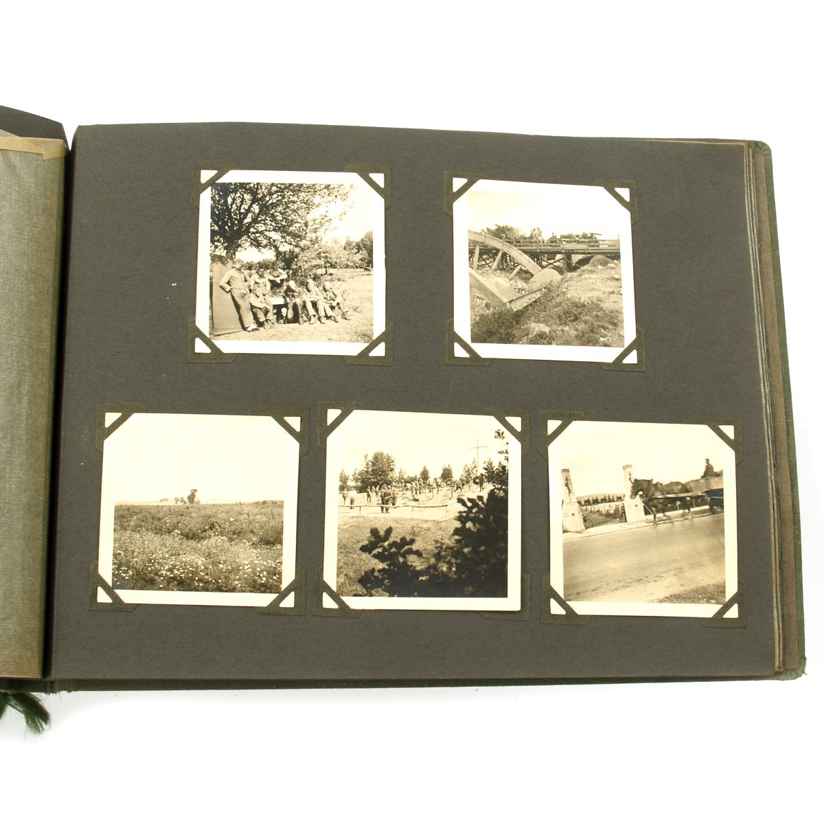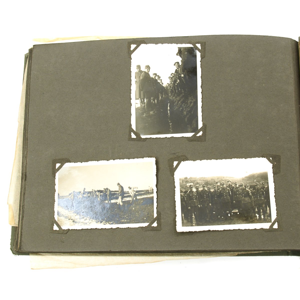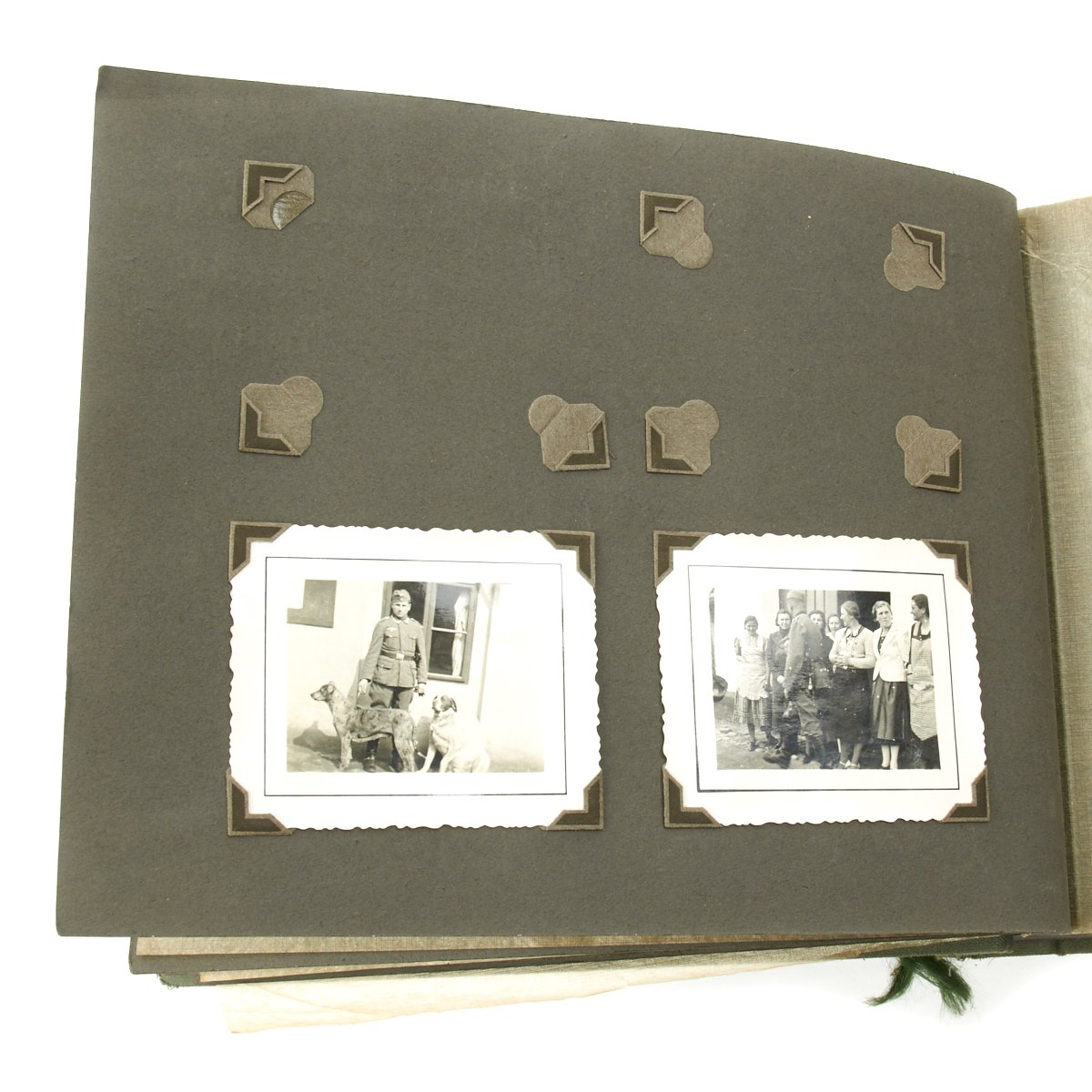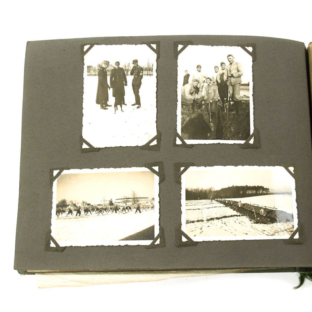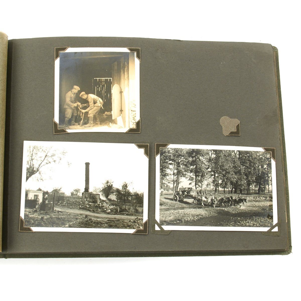 Original Item: One-of-a-kind-set. A wonderful personal photo album that measures approximately 10" x 7". Contains approximately 125 photos on 50 pages with onion skin partitions. Some pages have handwritten locations and other information such as FRANKFURT MAIN BONAMES and EINMARSCH SUDETENLAND Mit 4. A.R. 98. ENNZ, EINMARCH POLEN, KLEINER FEDLZUG FRANKREICH and many others. Front cover features silver embossed helmet and 7. Battr. An. Regt. 15 over Meine Dienstzeit (My Military Service). All photos are on period paper, have corner stays and appear to be totally original to the album. Some pages are missing photos. Overall a really nice hard to find photo album from the a German Artilley soldier during World War Two.