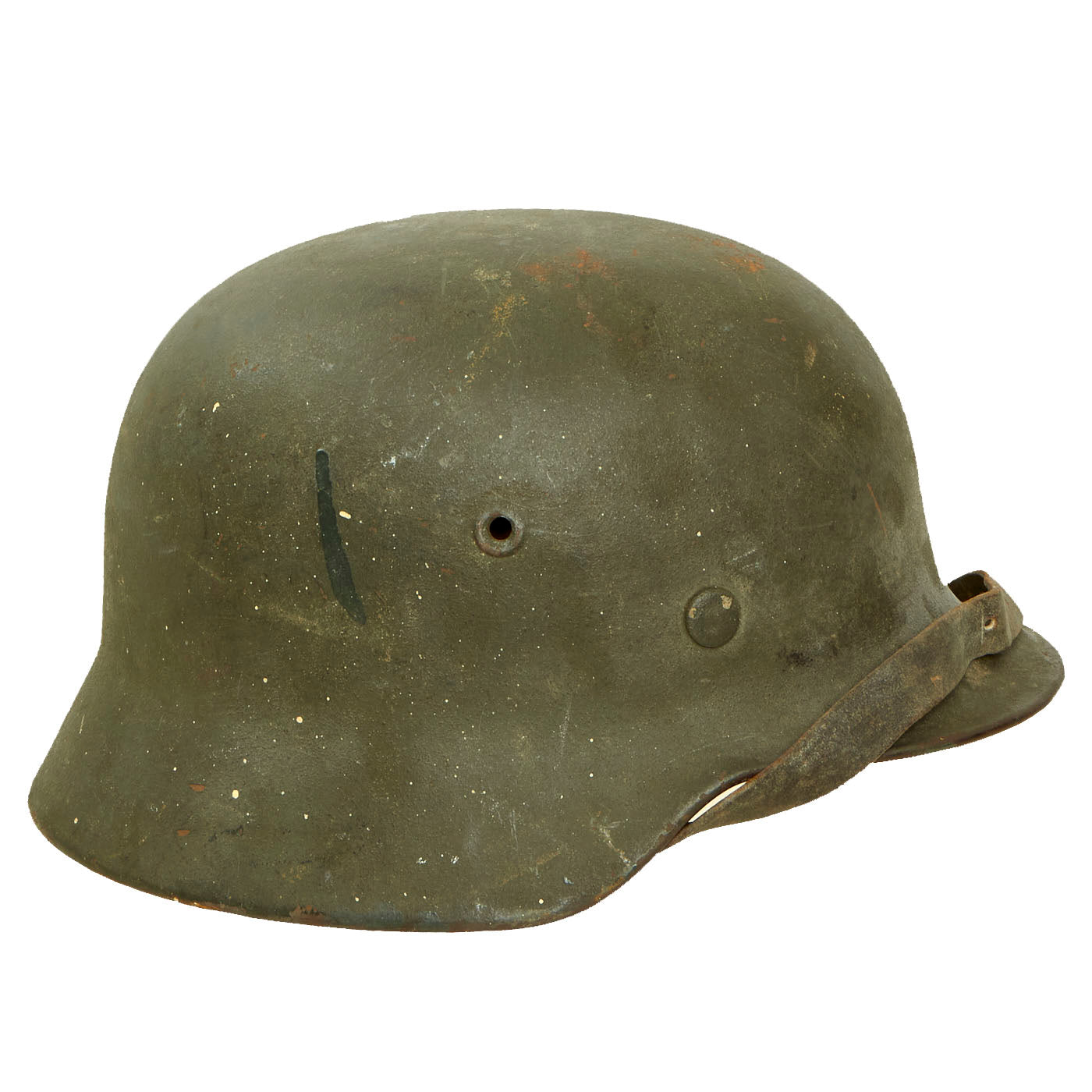 Original Item: Only One Available. This is a great all original example of a German Model 40 Steel helmet, as issued to the Wehrmacht Heer (army), straight out of an attic where it lay untouched for decades! It shows lovely period service wear in the form of chipped paint and oxidation on the shell of the helmet. There also is some flaking, probably due long term attic storage. However it still retains over 90% of it's original lightly textured panzergrau (armor gray) finish, with a bit of a whitish tinge from dust and attic exposure. The left side of the helmet features a worn Heer eagle decal, which is retained about 40%. This is a very nice example of the M40 helmet, with a great lightly worn look that is impossible to duplicate.