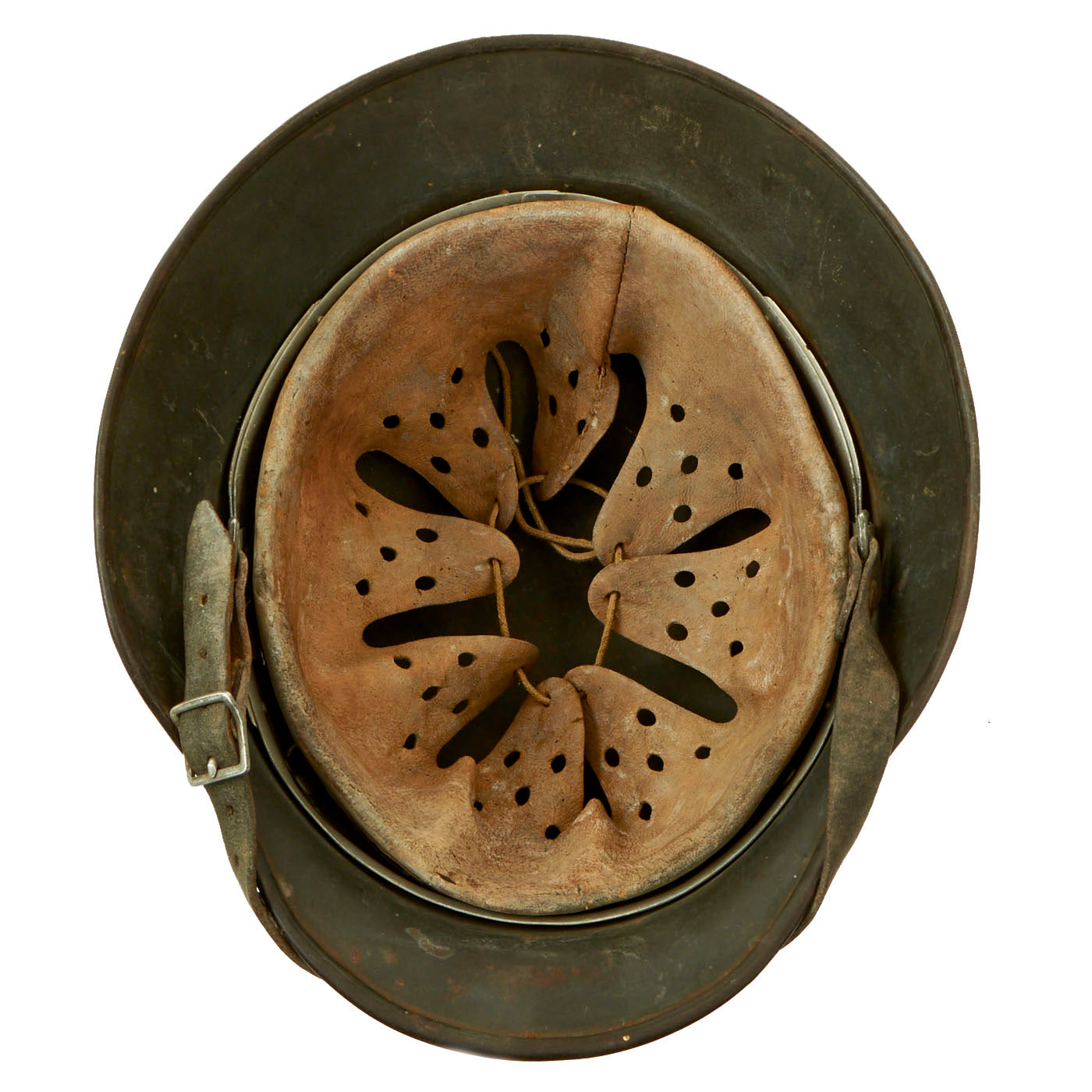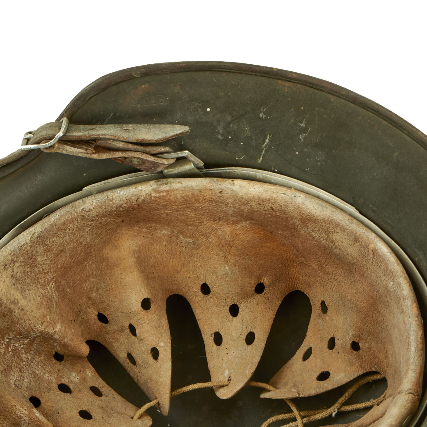 This indicates production by the metal and leather working company Werner Zahn, based in Berlin - Charlottenburg, in the year 1940, which fits right into the early war period. The chinstrap is fully intact, though a bit stiff, and has an early pattern aluminum buckle, while the securing studs are galvanized steel, correct for the transitional period. The leather is also has a bit of white appearance due to dust and exposure.