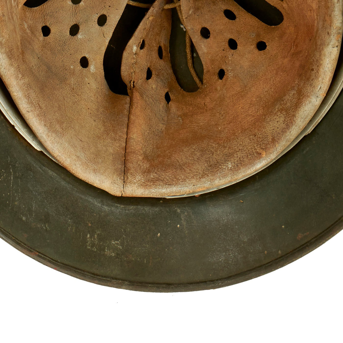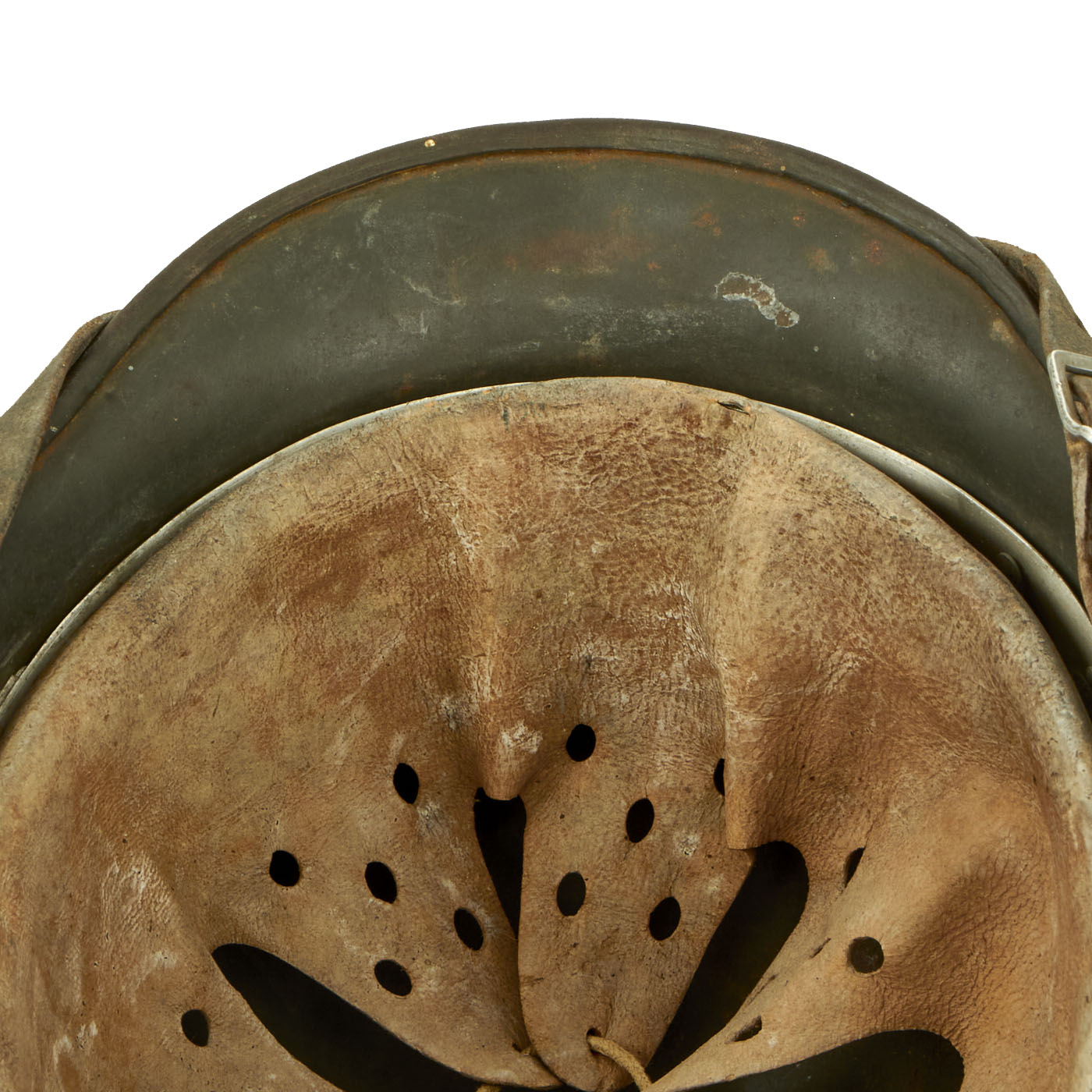 All three original liner retaining pins are present, with two out of three retaining virtually all of the lightly textured paint, while the the front left pin is missing about 50%. The interior of the helmet still has an original M31 leather liner with all eight fingers still present and fully intact, as well as an original top tie. The leather is supple, however it has a whitish tinge from years of attic storage. The liner band is aluminum, with square aluminum chin strap loops attached to reinforced sides. This is the last pattern before the move to galvanized steel bands. The left exterior of the liner band is marked 64 n. A. / 56, indicating that it is a size 56 liner for a size 64 shell. The right side has the full maker information clearly stamped: