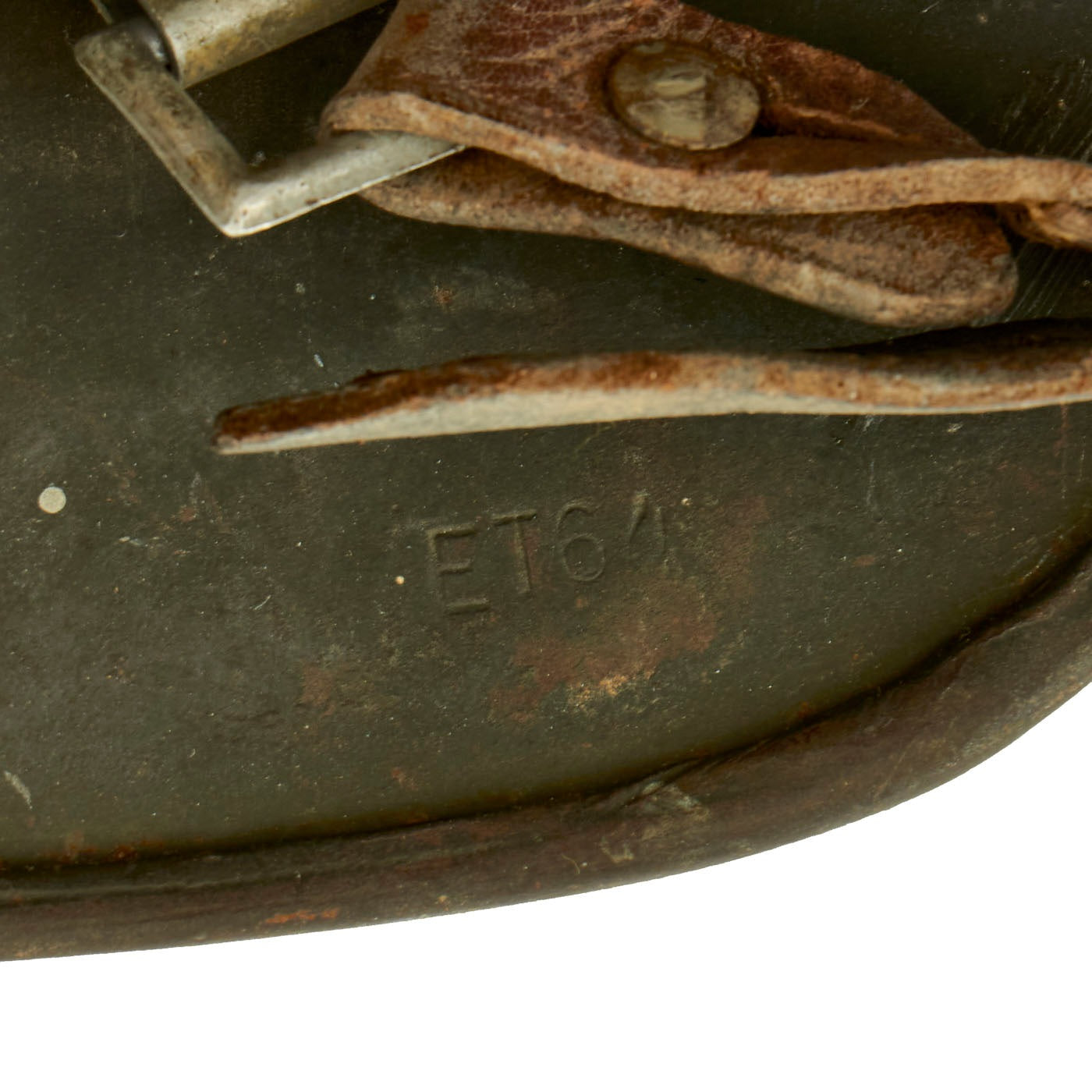 The reverse, interior, neck guard apron is heat lot number stamped 4984 and the interior, left side, apron has the stamped manufacturer's code and size, ET64 indicating that it was manufactured by Eisenhüttenwerk AG of Thale, located in the Harz district in Saxony, Germany. Size 64 is a nice medium size that can accommodate liners from 56cm to 57cm or US 7 to 7 1/8. Size 64 shells are harder to find and are therefore more valuable to a collector.