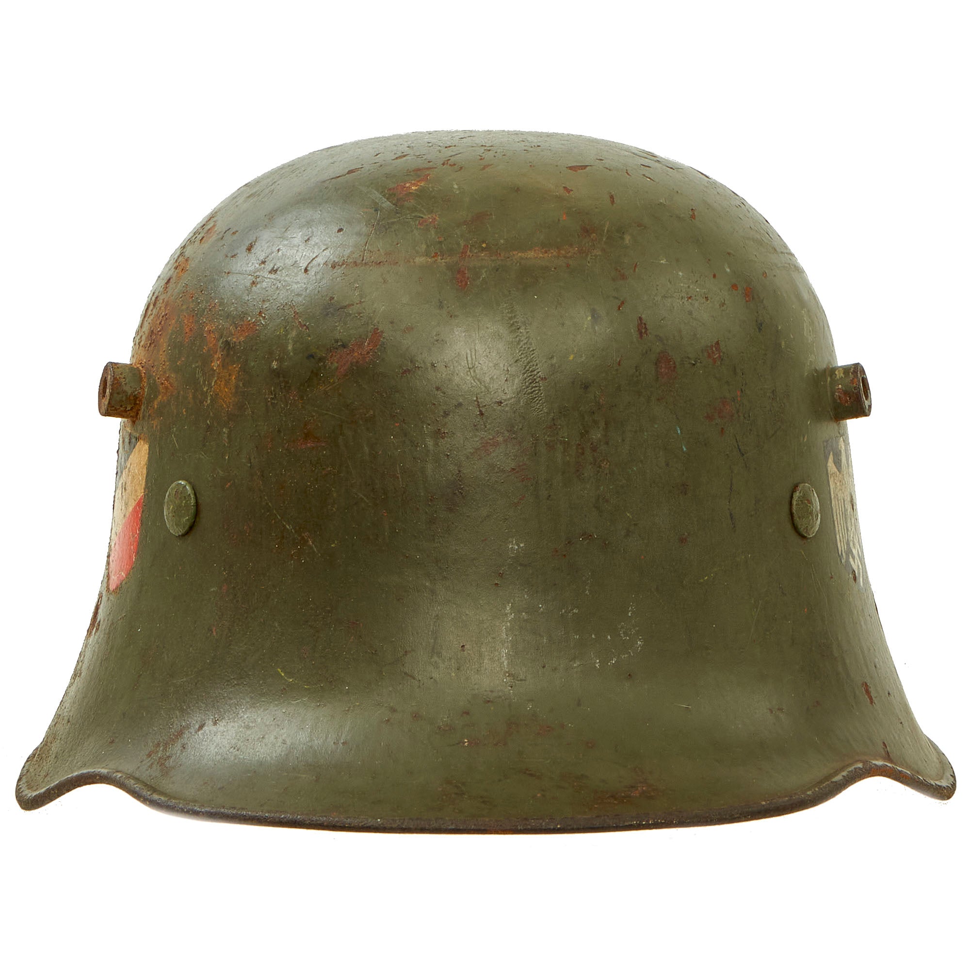 Original Item: Only One Available. Austria-Hungary purchased about 416,000 German helmets from November 1916 until the end of the war, and also began its own licensed production starting in May 1917. Around a million Stahlhelm of all variants were issued until the end of the war. The Austrian M17 helmet was similar to the German M16 but was colored golden-brown (known as Isonzo-braun), had a cloth chinstrap and had the chinstrap rivet located higher up on the steel shell. From May 1917 till the end of World War I 534,013 were produced, many of which were manufactured at the Krupp plant in Berndorf, Lower Austria.