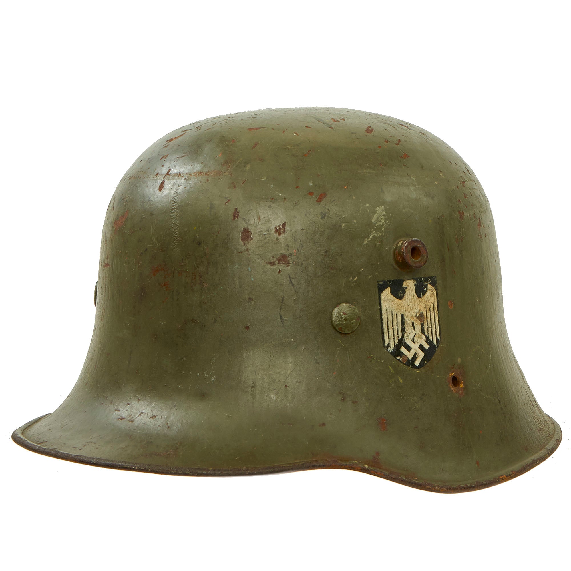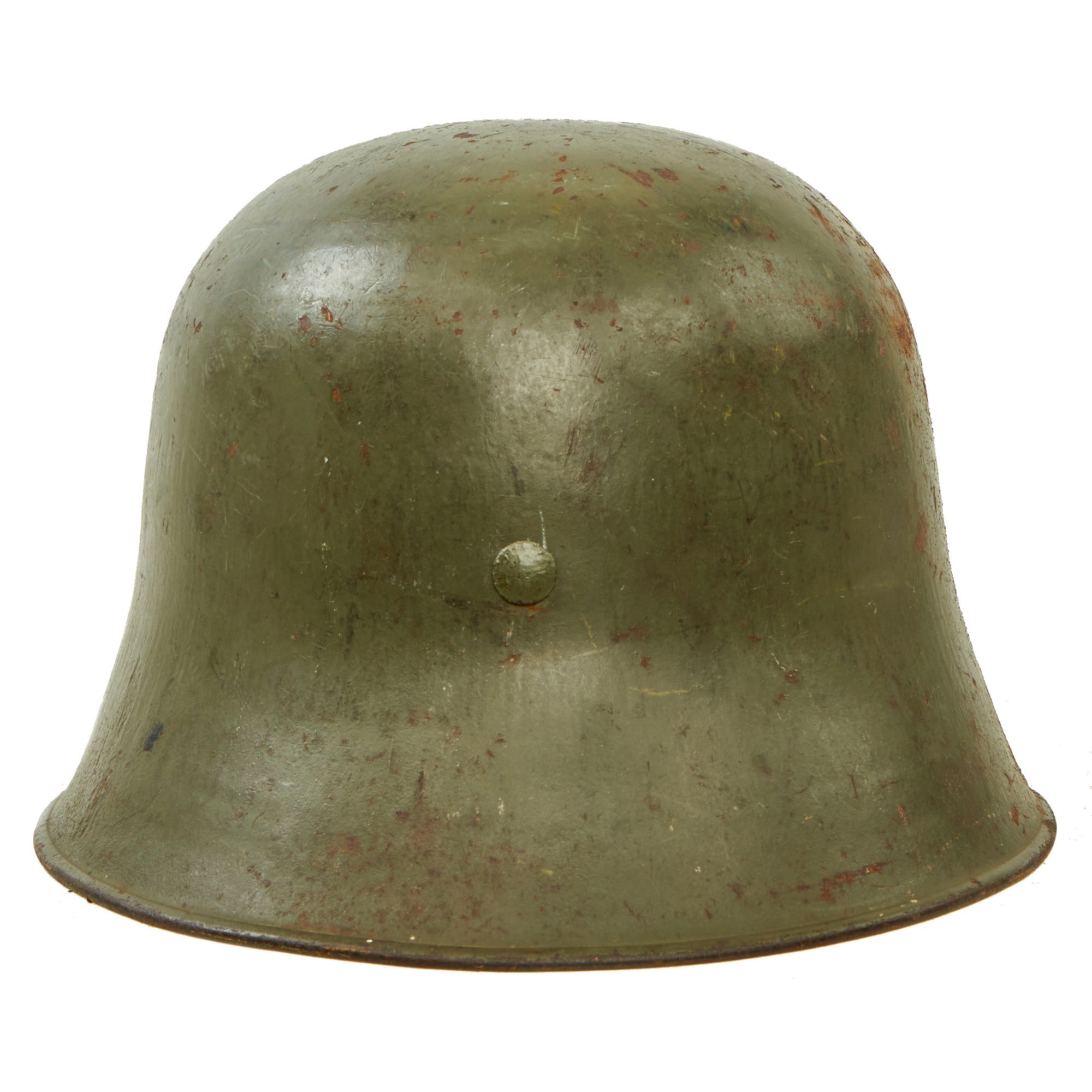 This is a very nice service used example of a WWI M17 Austro-Hungarian Helmet that was converted for use by the Third Reich in the 1930s before the issue of the M1935 helmet. The original "Isonzo braun" paint was removed, and then WWII early war "Apfel-grün" (Apple Green) paint was applied, which is still present, retained at about 80%. There is some chipping and oxidation, but it really looks quite nice. The original chin strap attachment bales were removed, as was often done when the Austrian helmets were being reconfigured by the Germans.