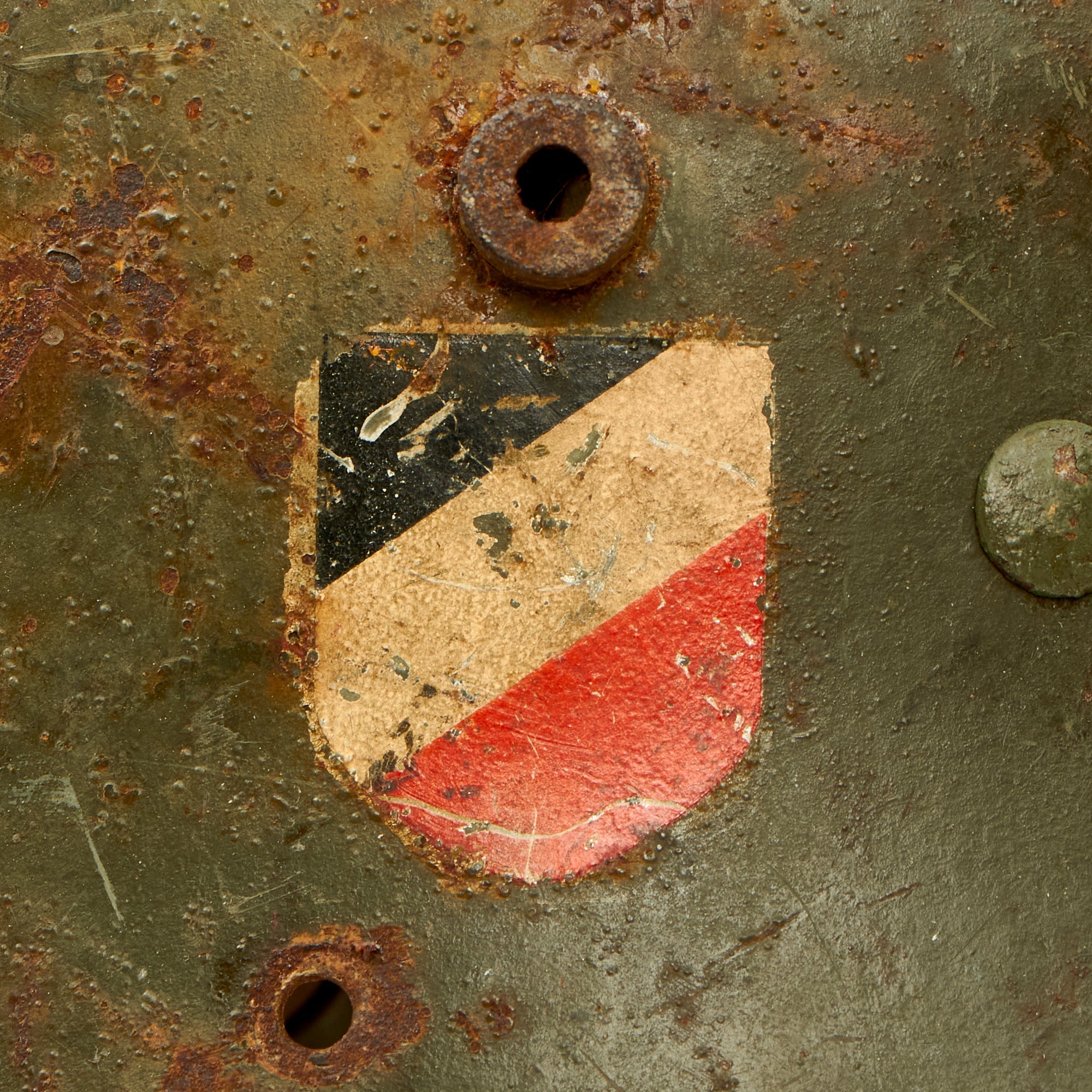 The shell was the outfit with the "National Colors" and "Heer Eagle" decals, which are still both fully intact and were not painted over! The use of the second decal was discontinued in 1940, and in 1943 it was ordered that helmets with the national colors have them removed, so finding a helmet with both still intact is a real treat! Both decals show some age, with the Eagle retained at over 90% and still shiny, while the national colors shows more wear and some bubbling, as the right side of the helmet looks to have been exposed to more wear over the years, possibly from contact with the ground.