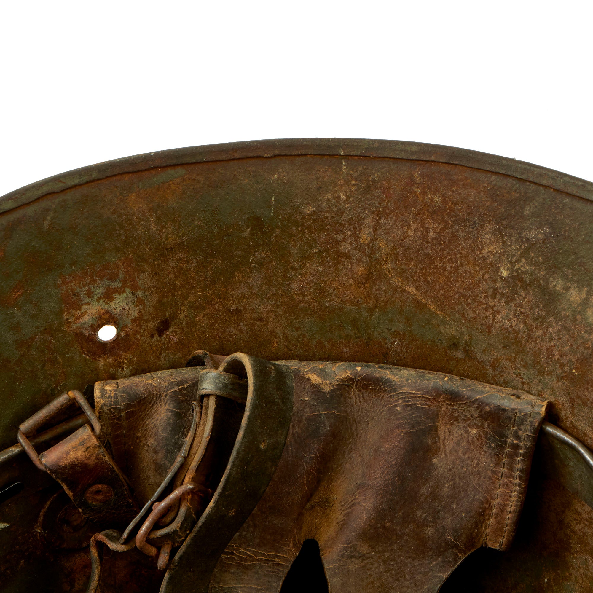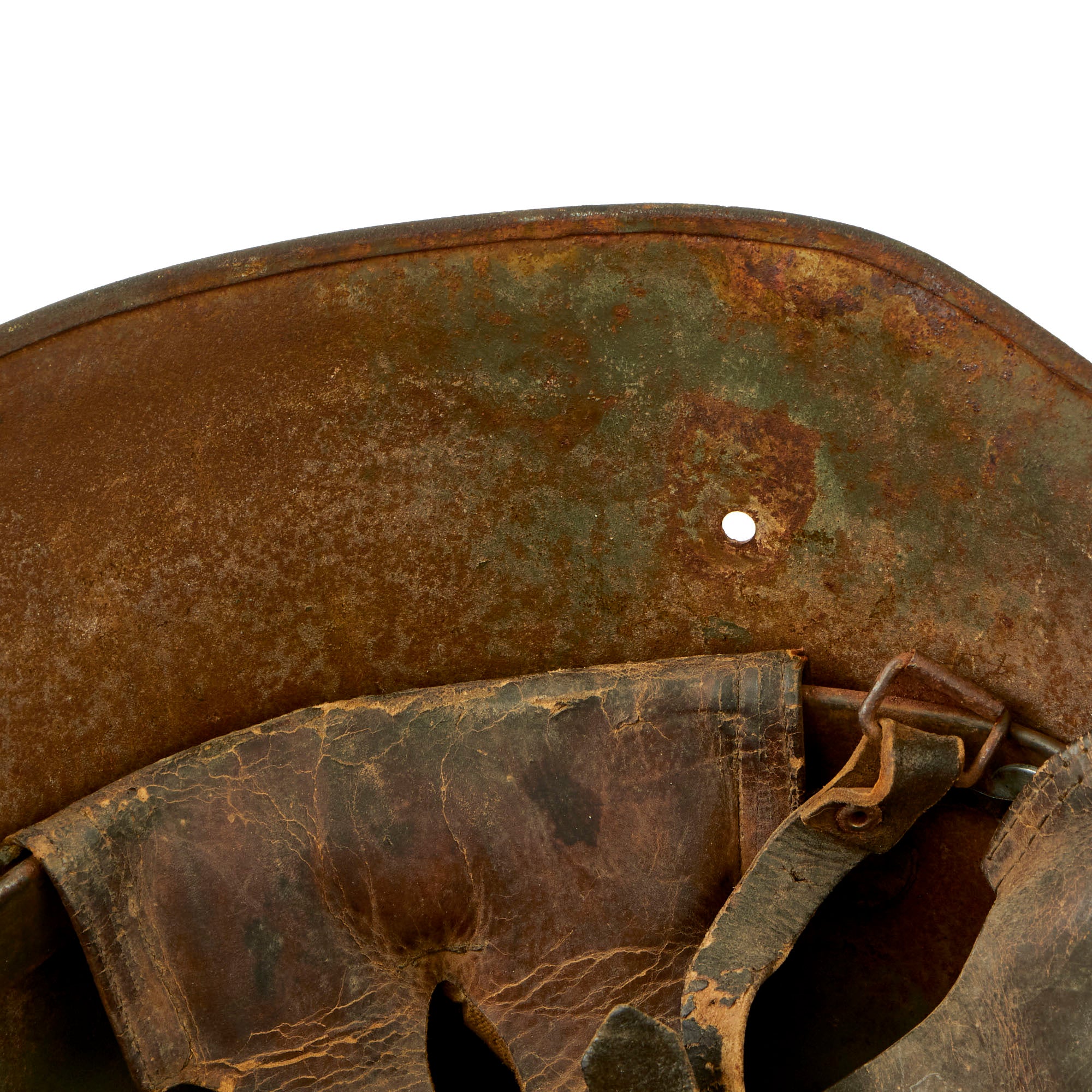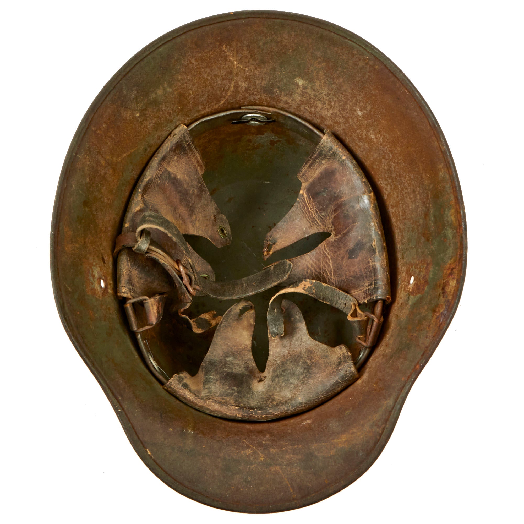 There is no maker or size marking stamped on the shell, however this is typical for Austro-Hungarian M17 helmets, as many of the makers used only ink stamps, easily painted over. It does however have a clear 9 1 0 2 rolling mill lot number stamped onto the inside of the dome. We measured the outside of this helmet, and we are fairly certain that it is in size 66cm. This is a nice large size that would usually accommodate size 58 to 59 hat sizes, which is 7 1/4 to 7 3/8 in U.S. sizes. The helmet still has the correct short vent hole lugs without steps, for attachment of a "stirnpanzer" helmet plate. Smaller sized helmets would have a step, but this does not, confirming its larger size.