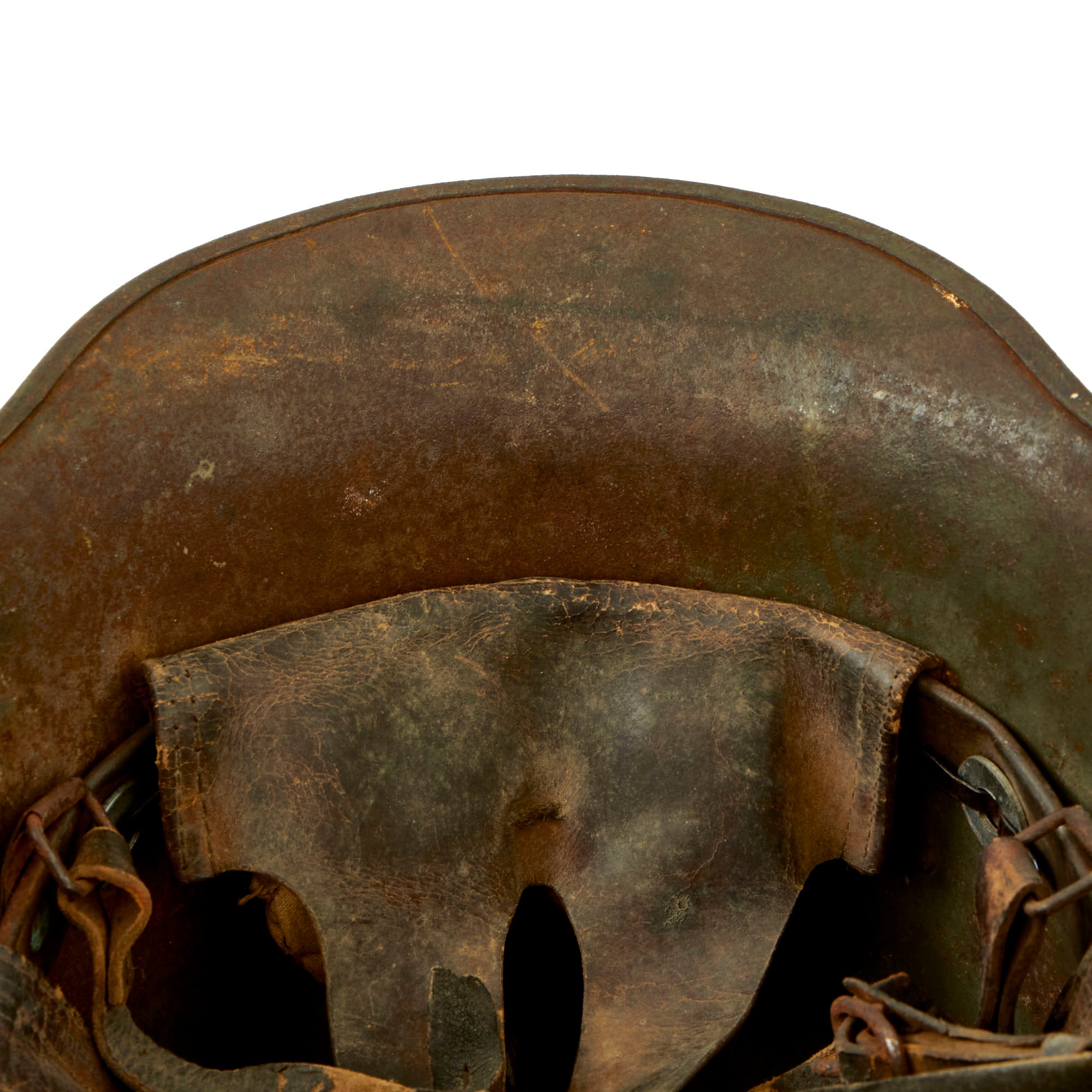 The liner on this helmet is a German M18 style liner, and definitely was fit at some later time, probably post war, as the split pins and galvanized washers used are definitely not period. It does look to be an original WWI Issue liner with the correct three panels, and has a steel liner band with the chin strap attached directly to it, as is correct for the M18 style liner. The leather of the liner is present, but very dark from age and use, and there is no top tie string. the padding behind the liners seems to be intact, however the chin strap is deteriorated, and stretched and snapped long ago.