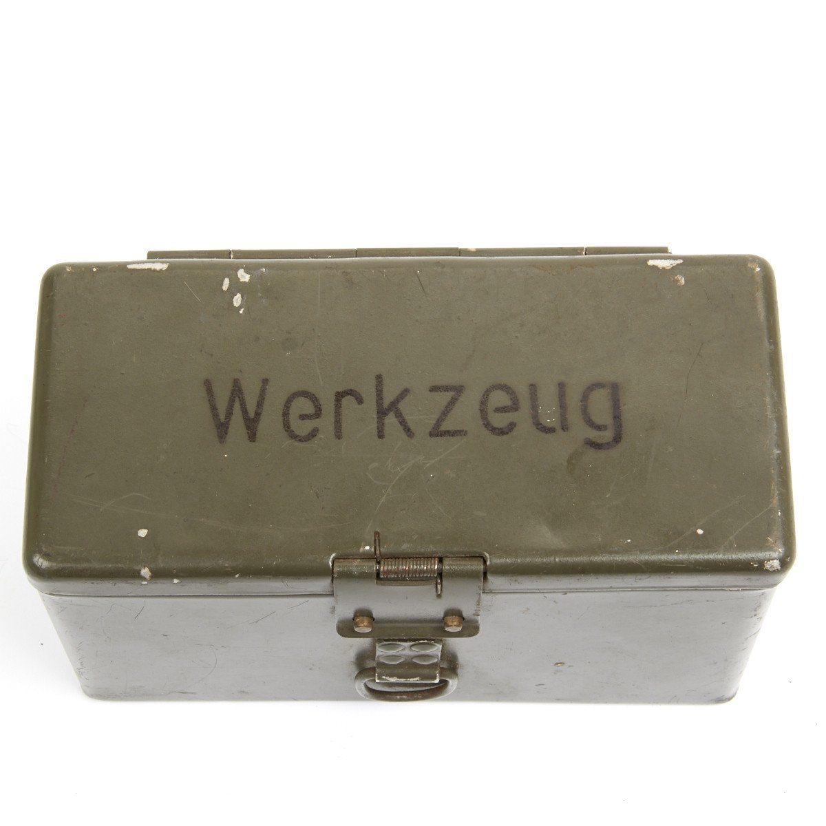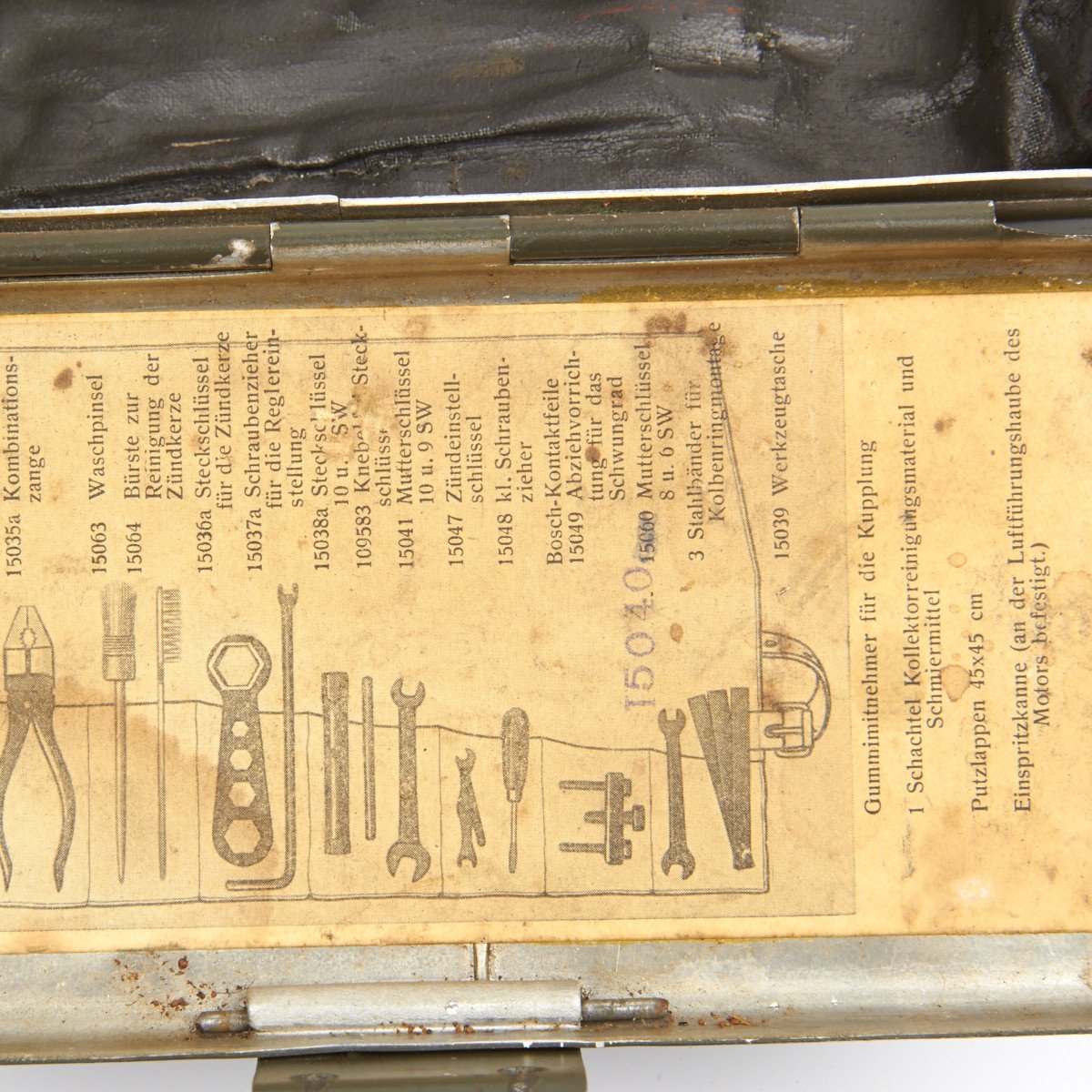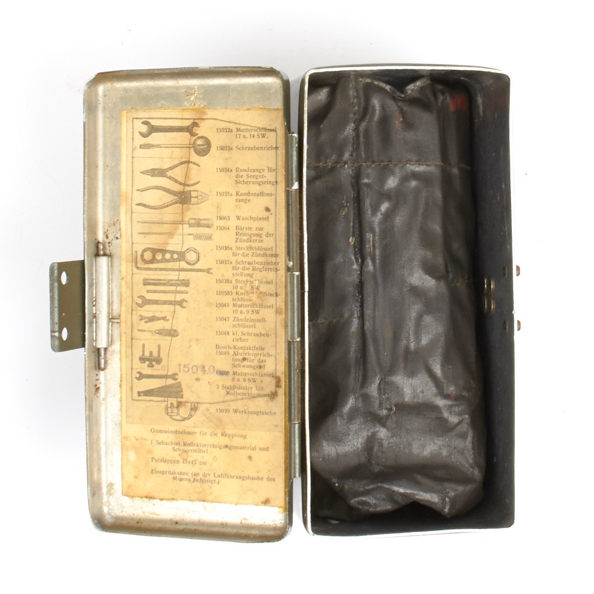 Original Item: This is a fantastic find. Totally original tool kit manufactured by DKW Auto Union (later renamed Audi), aluminum case still bears the original contents label with very clear waffenamt impressed to the interior.
