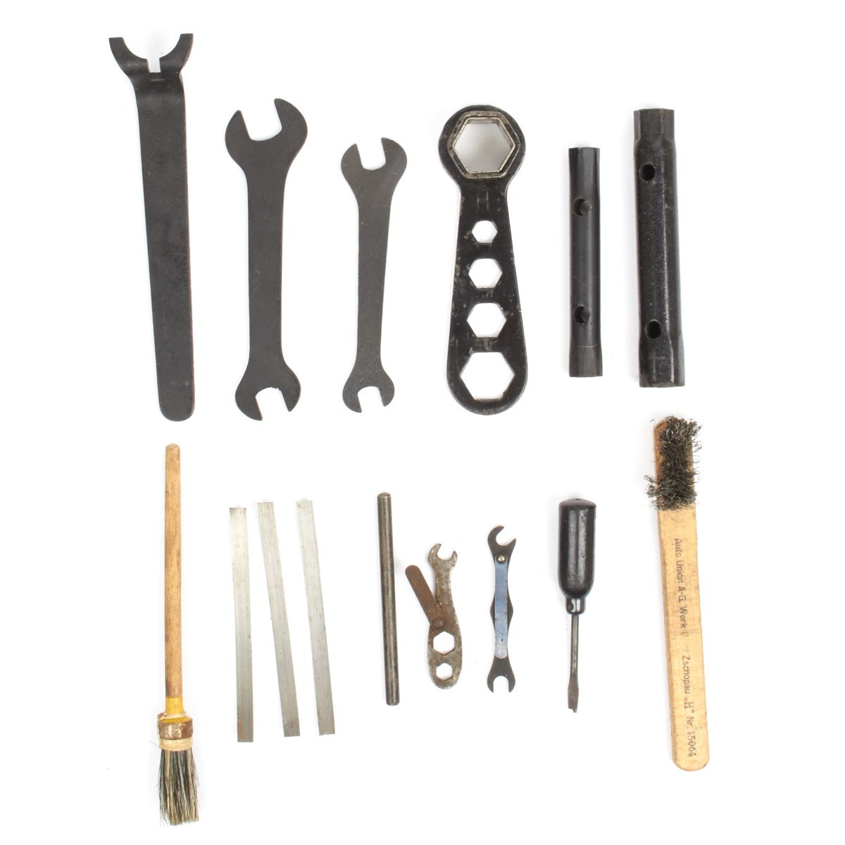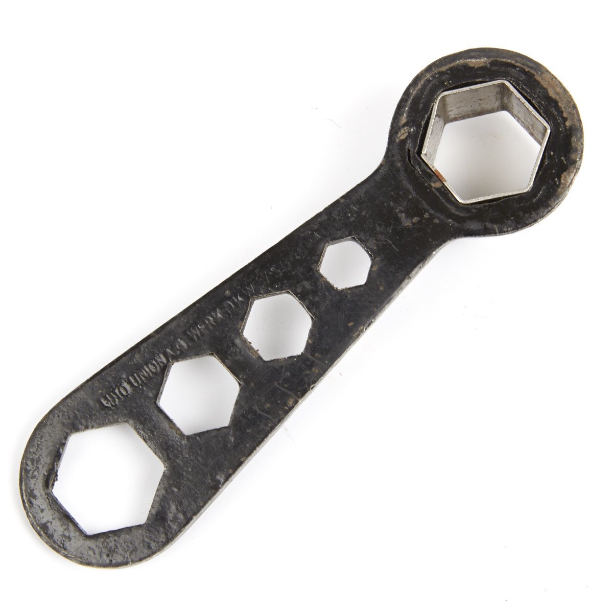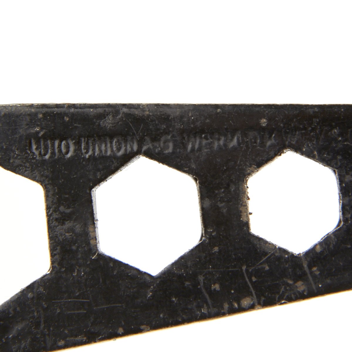 Various wrenches, socket wrenches, brushes and tools are included, 15 pieces in total. Also, included is the coated canvas roll, with 6 integral pockets. The majority of the tools bear numbers markings and four rings the AUTO UNION logo.