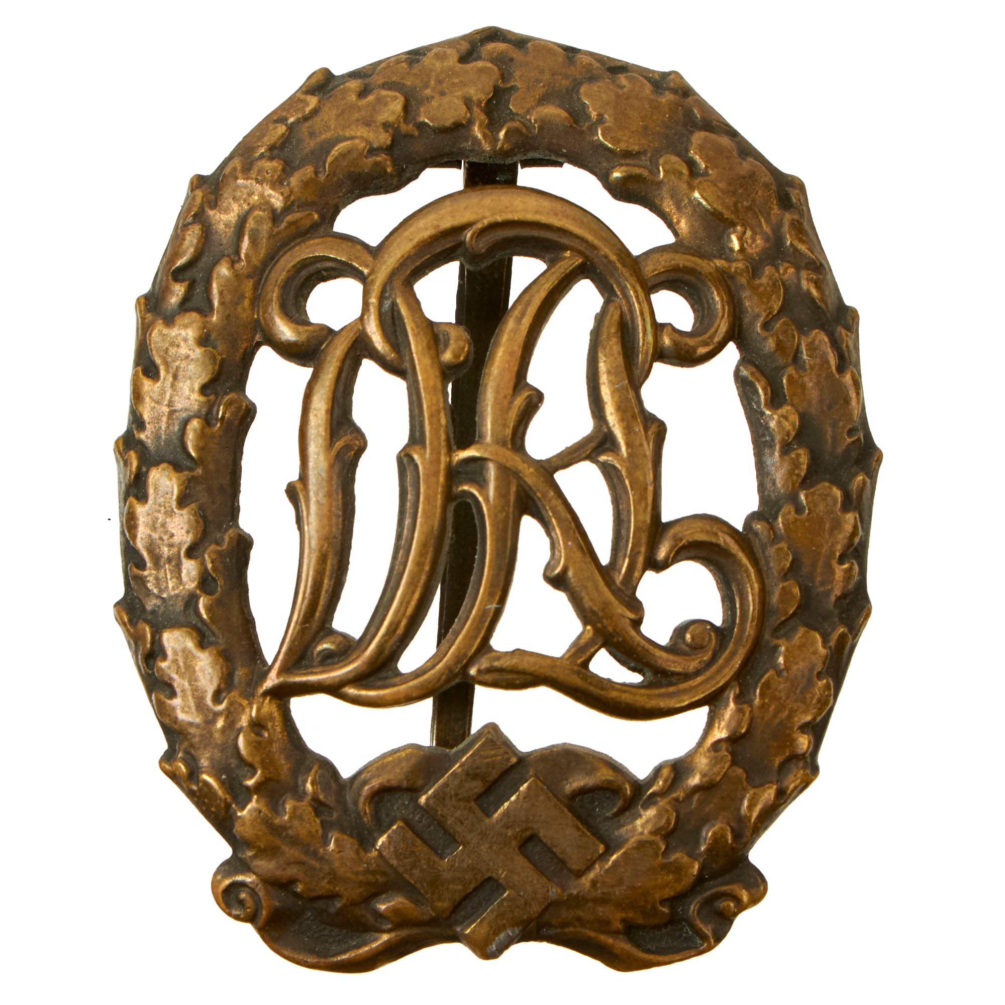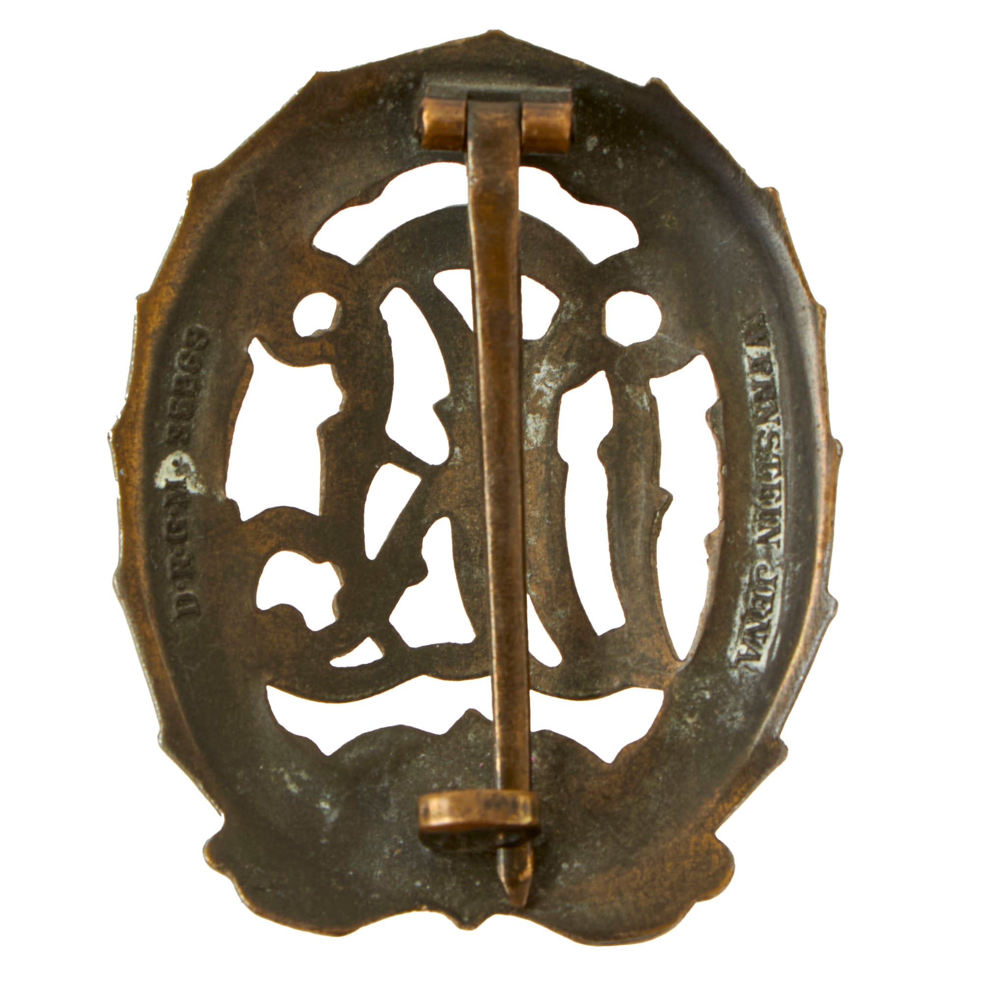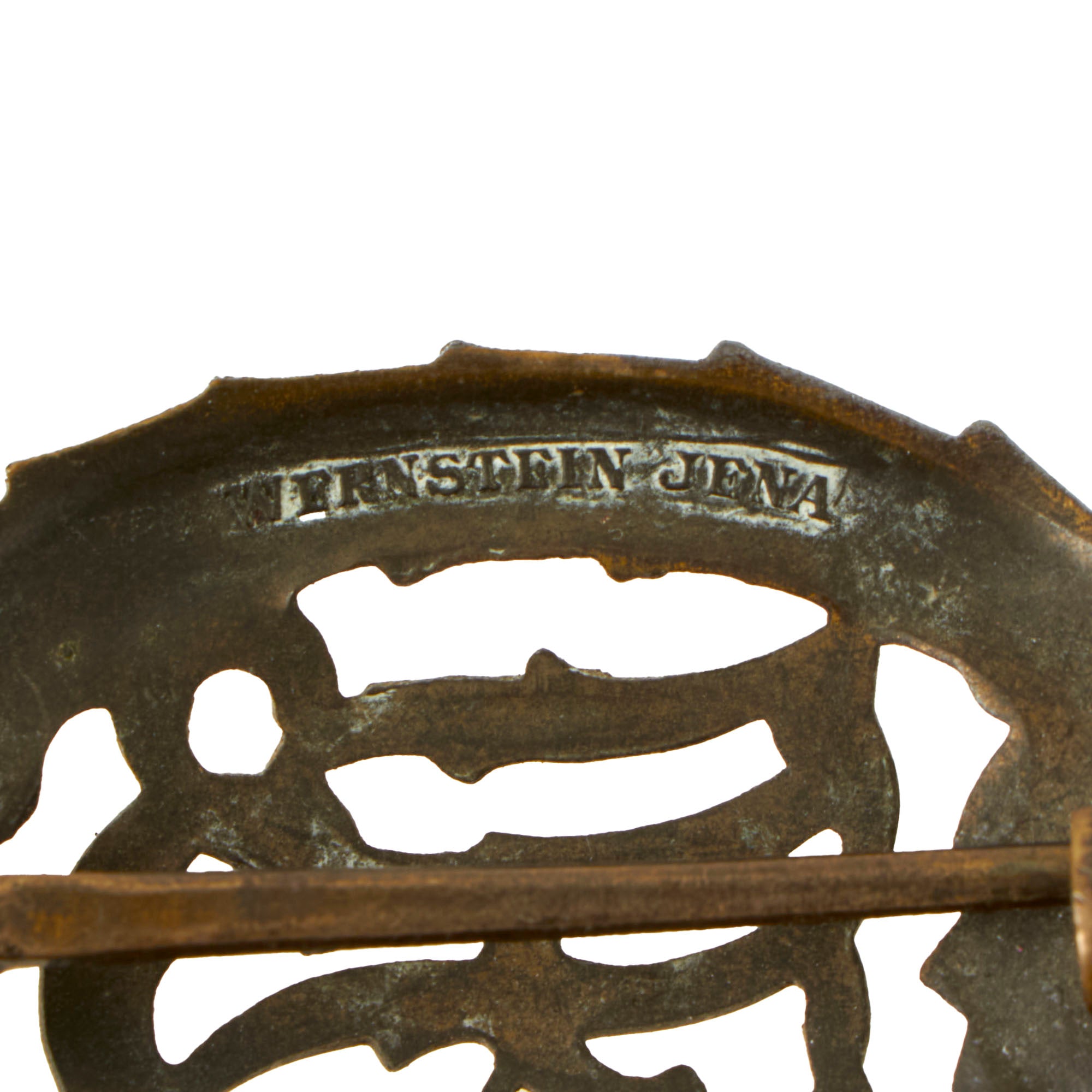 - One German WWII DRL Sports Badge. In very good condition with a functional pinback. It is marked on the back with WERNSTEIN JENA for Hermann Wernstein of Jena-Lobstadt, a known maker of this badge. It has a lovely patina on the brass, showing wear from age and use.