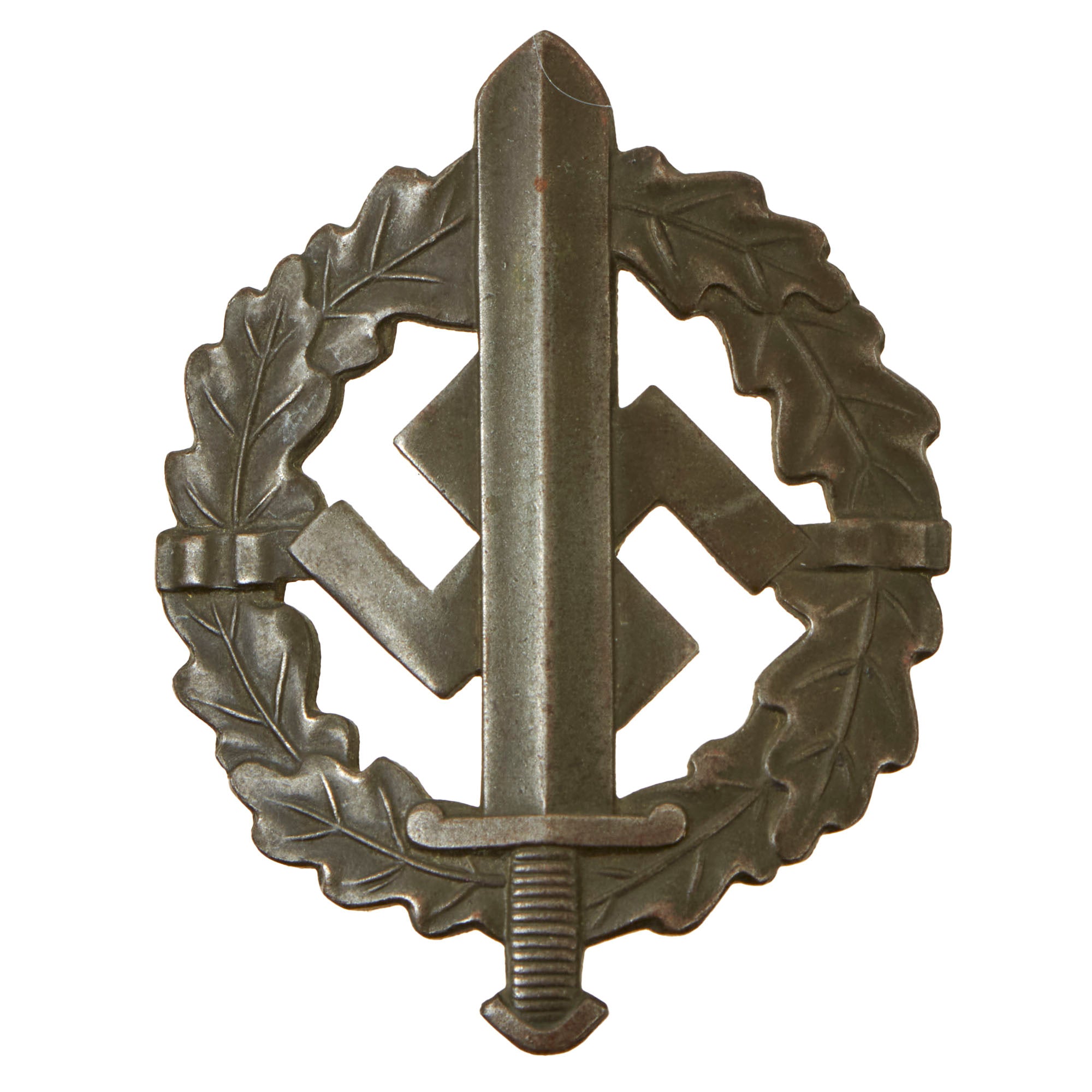 The SA Sports Badge was a decoration of NSDAP Germany that was issued between the years 1933 and 1945. It was a political version of the much more generic German Sports Badge, which was also issued in great numbers by the NSDAPs. At its center was a 57mm high Roman broad sword, superimposed over a NSDAP swas. It was encircled by an wreath of oak leaves. It was a pin-back badge. There was a cloth version, as well.