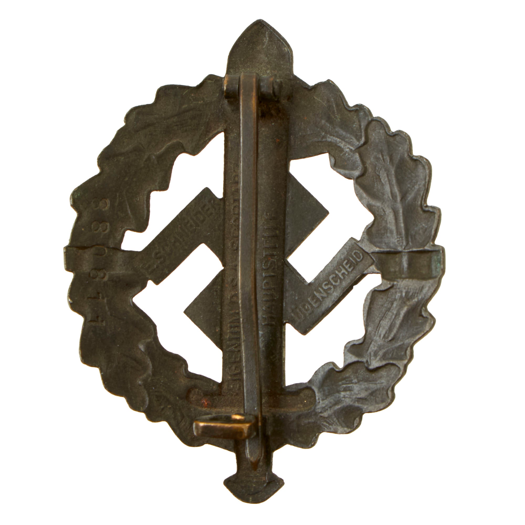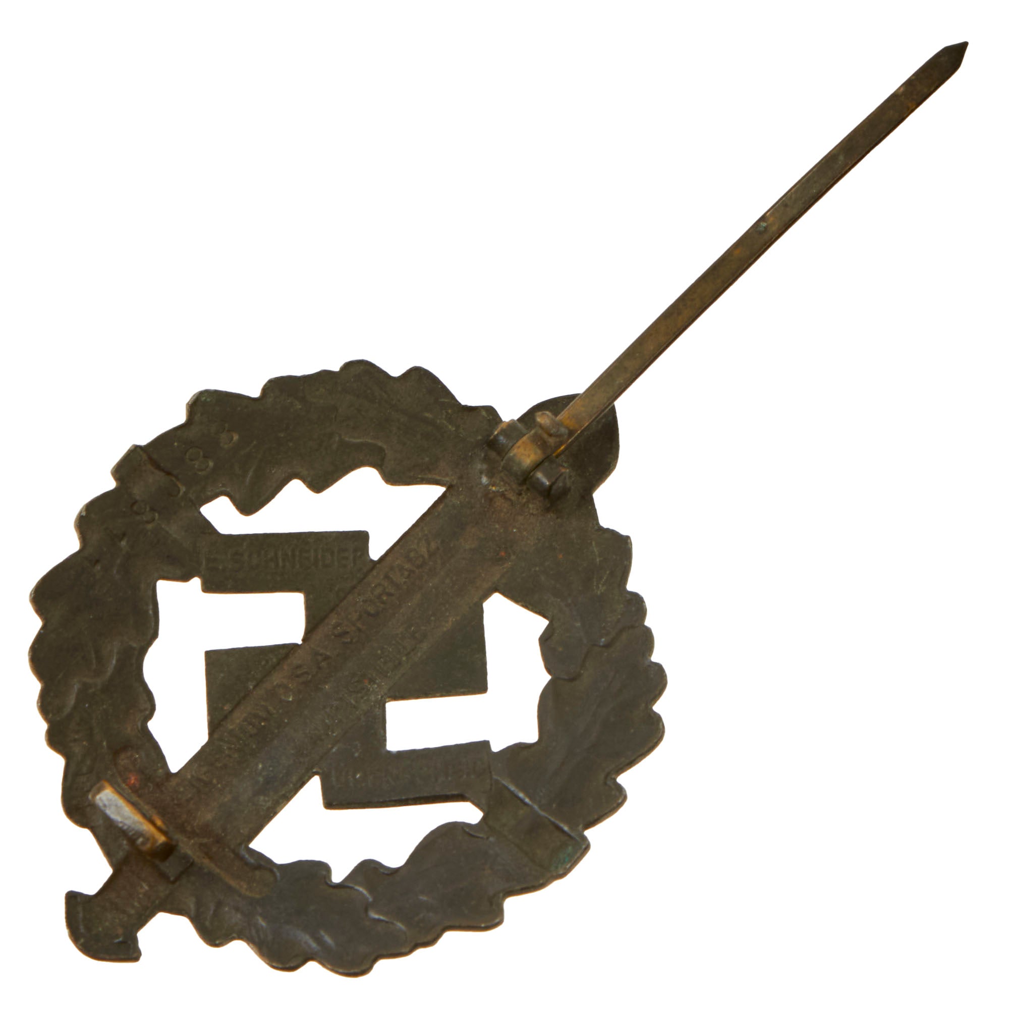 - One German WWII SA Sports Badge. These were available in three grades, Bronze, Silver, and Gold, and we believe this to be the Silver Type, however it is quite worn, and could possibly be another type, as they all were made from plated steel, as this example is. It is marked on the back with E. SCHNEIDER / LÜDENSCHEID on the arms of the swas, for maker Ernst Schneider of Lüdenscheid, a city with a large garment accessories industry.