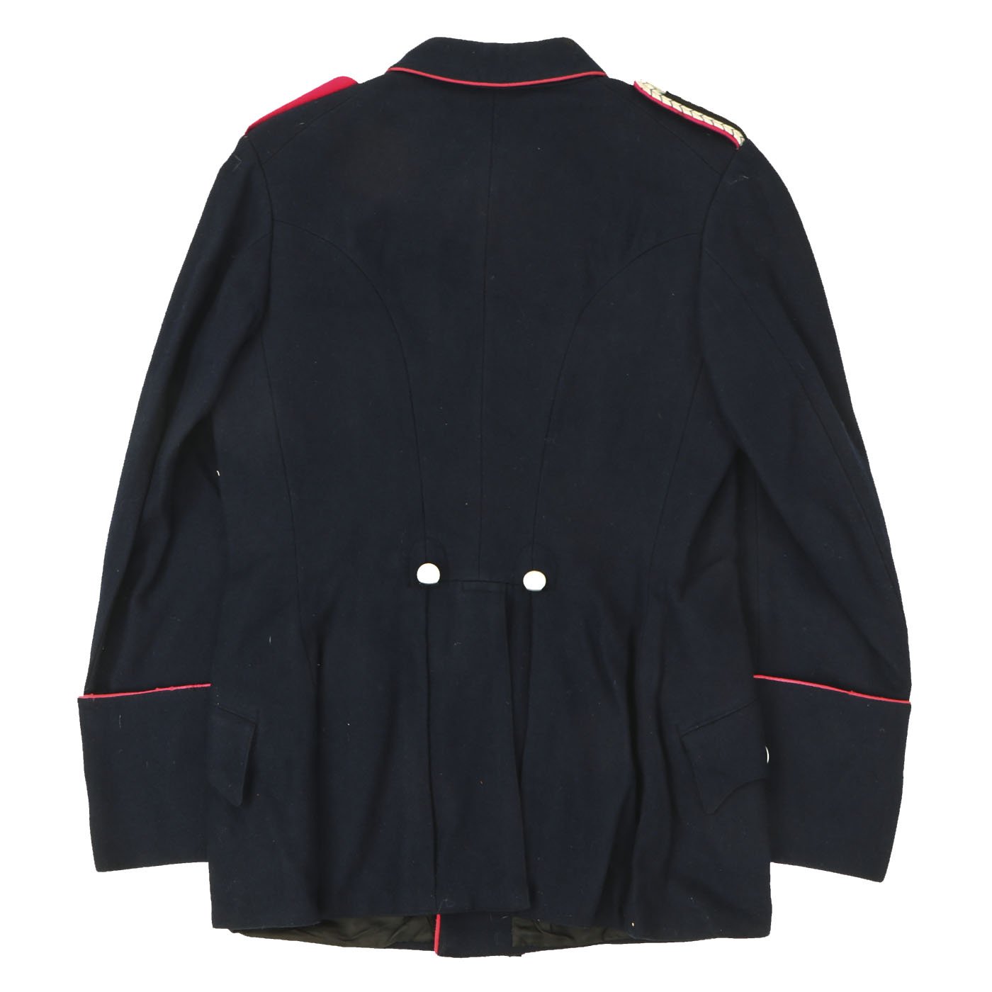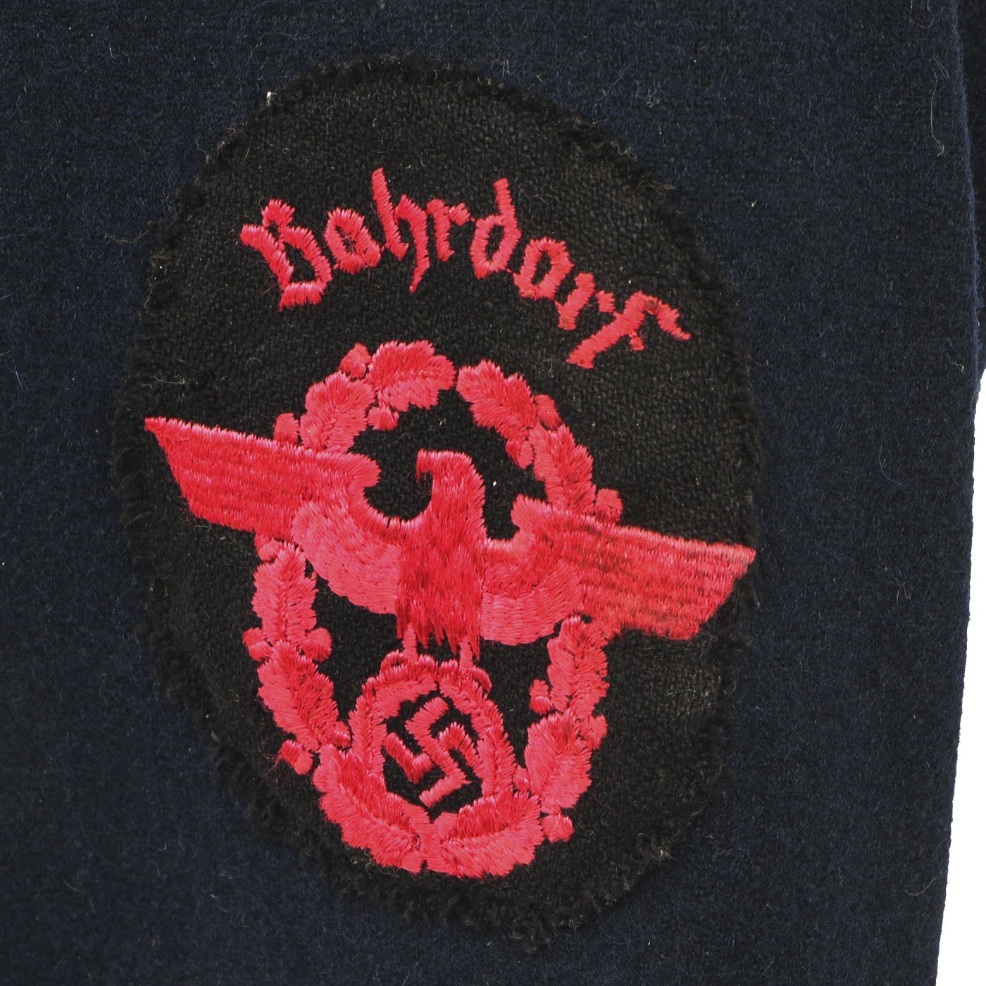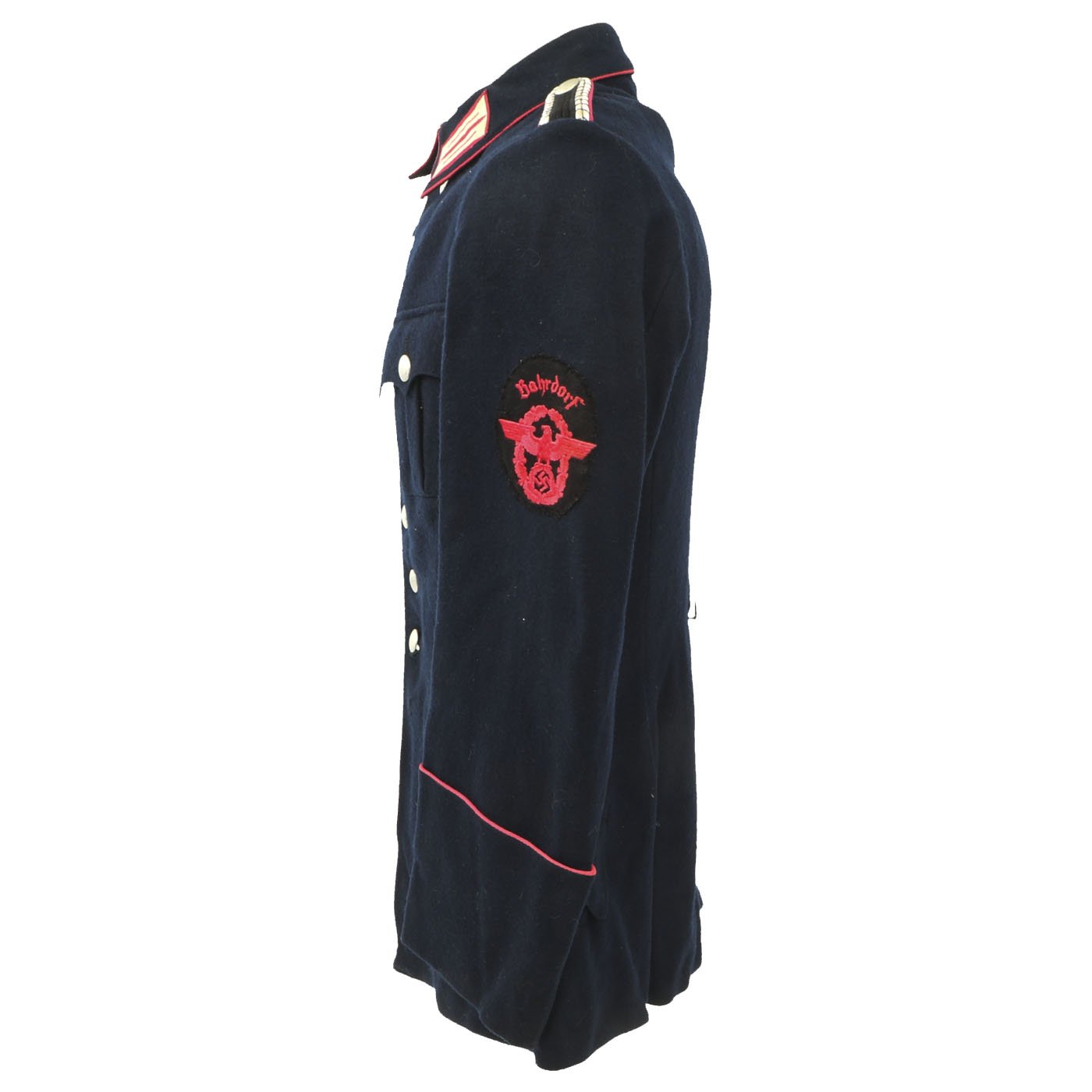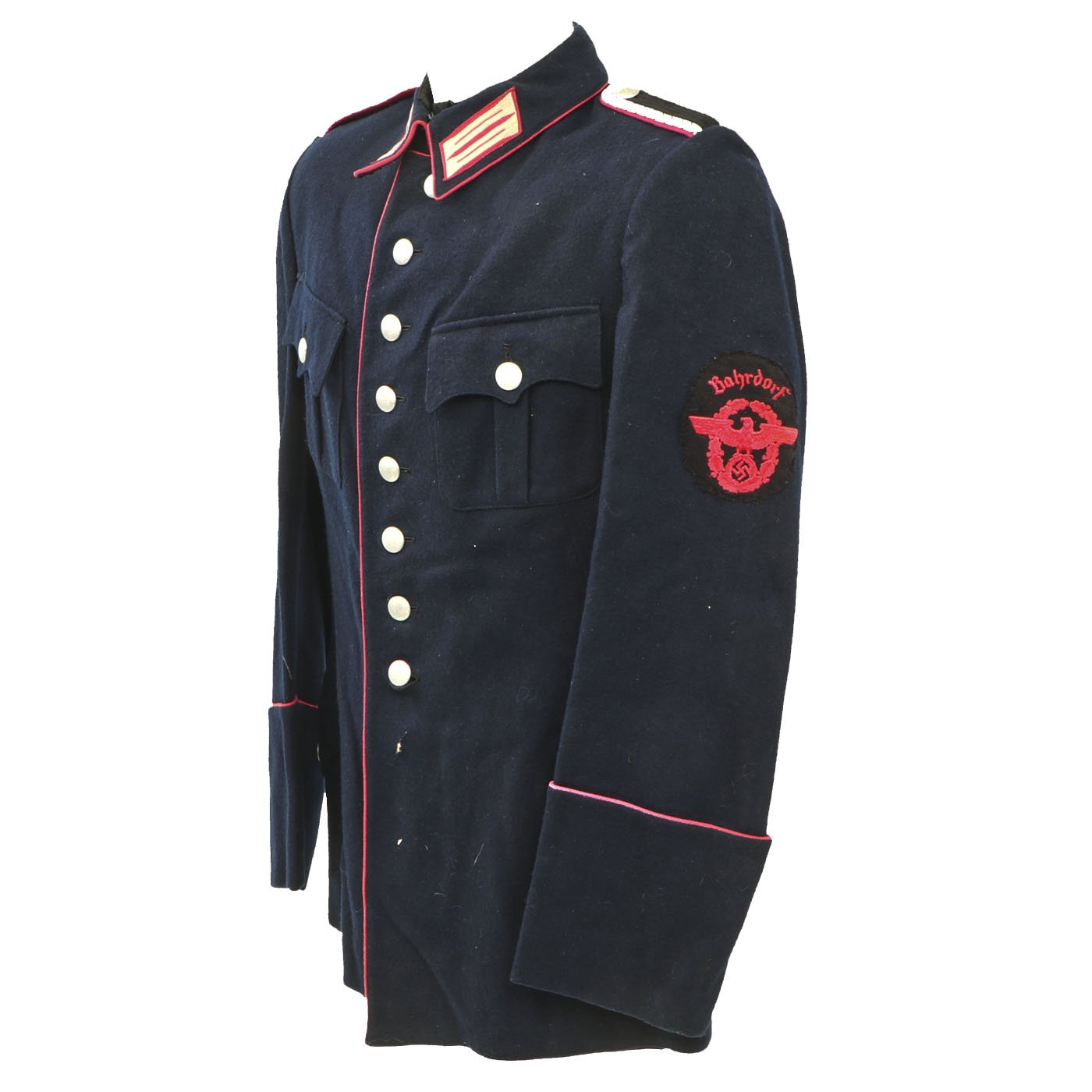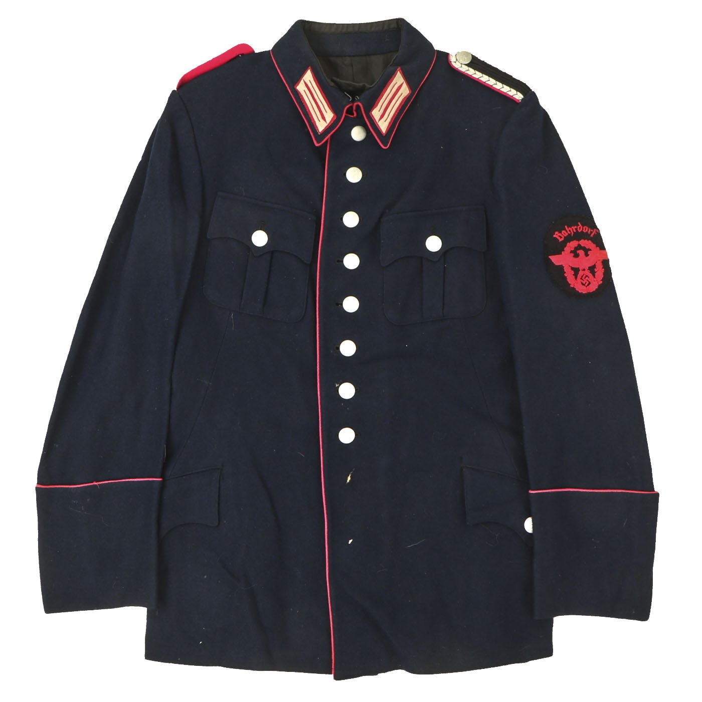 Original Item: Only One Available. This Fire Police Dress Tunic is a beautiful, tailor made piece, in outstanding condition. It’s made from a dark blue wool fabric, with attractive, bright pink piping, indicating Fire Police. The sleeve eagle is machine embroidered in pink thread on a dark blue wool backing, and is pristine. It’s emblazoned with the word “Bahrdorf” in Fraktur lettering, indicating Bahrdorf which is a municipality in the district of Helmstedt, in Lower Saxony, Germany. The collar tabs on this handsome tunic are Bevo machine woven, and are perfect. They are neatly machine sewn to the collar. The Fire Police shoulder boards are intact with bullion silver wire and birth pink piping. All of the original, silver pebbled buttons and belt ramps are intact and factory sewn. The interior of this Fire Police dress tunic is fully lined. There are no size markings, which is not at all unusual on these tailor made examples. Original Tailor label reading Feurwehr - Bedorf on inner pocket. This tunic displays extremely well, and has great visual appeal.
