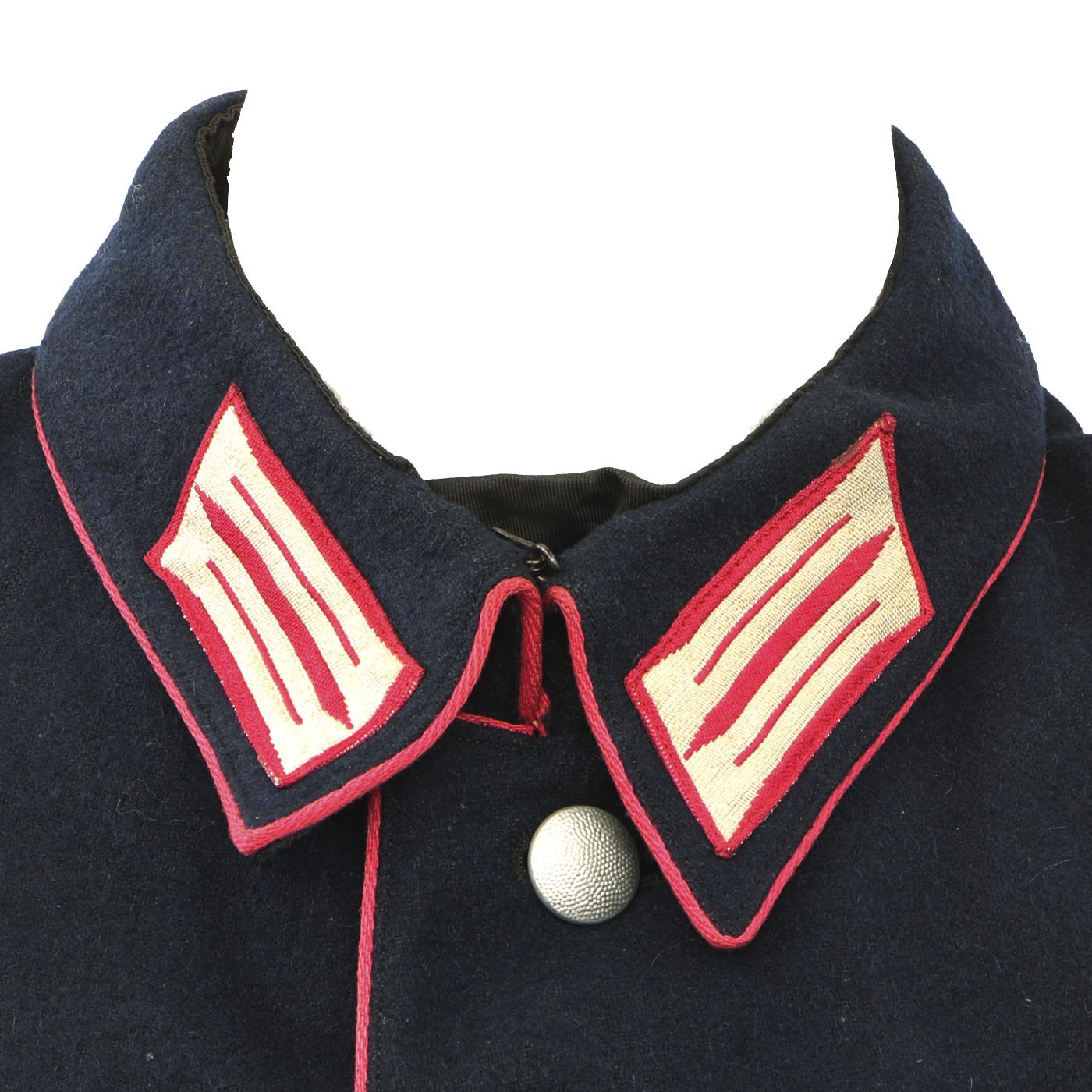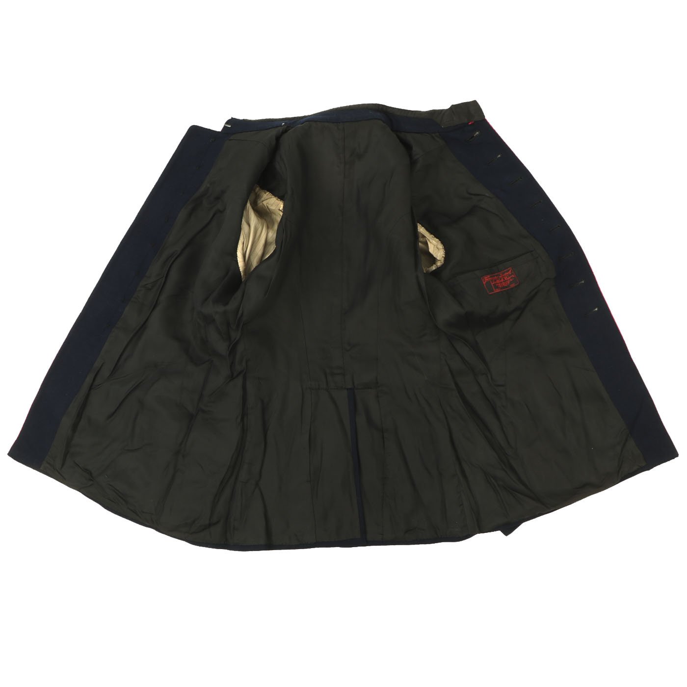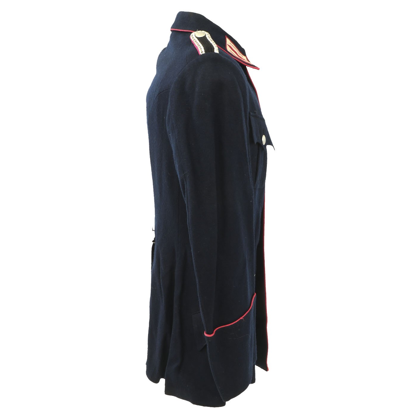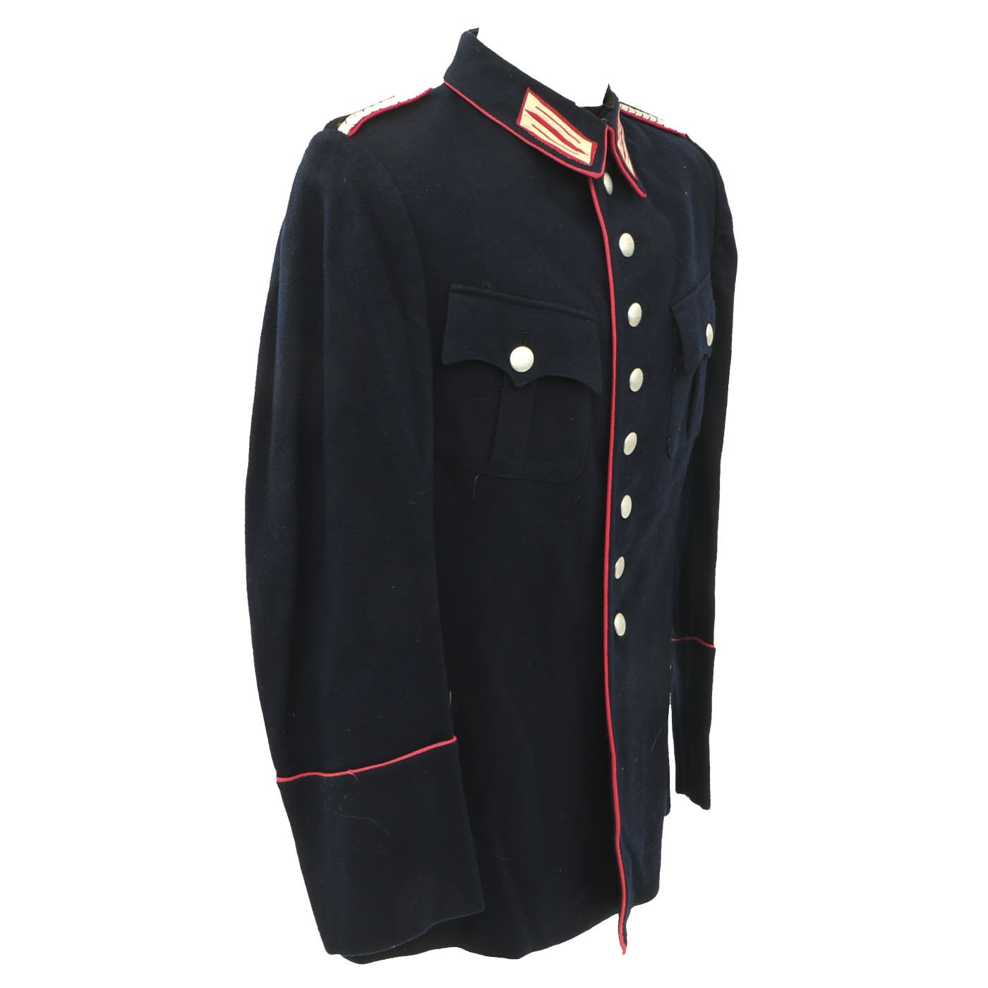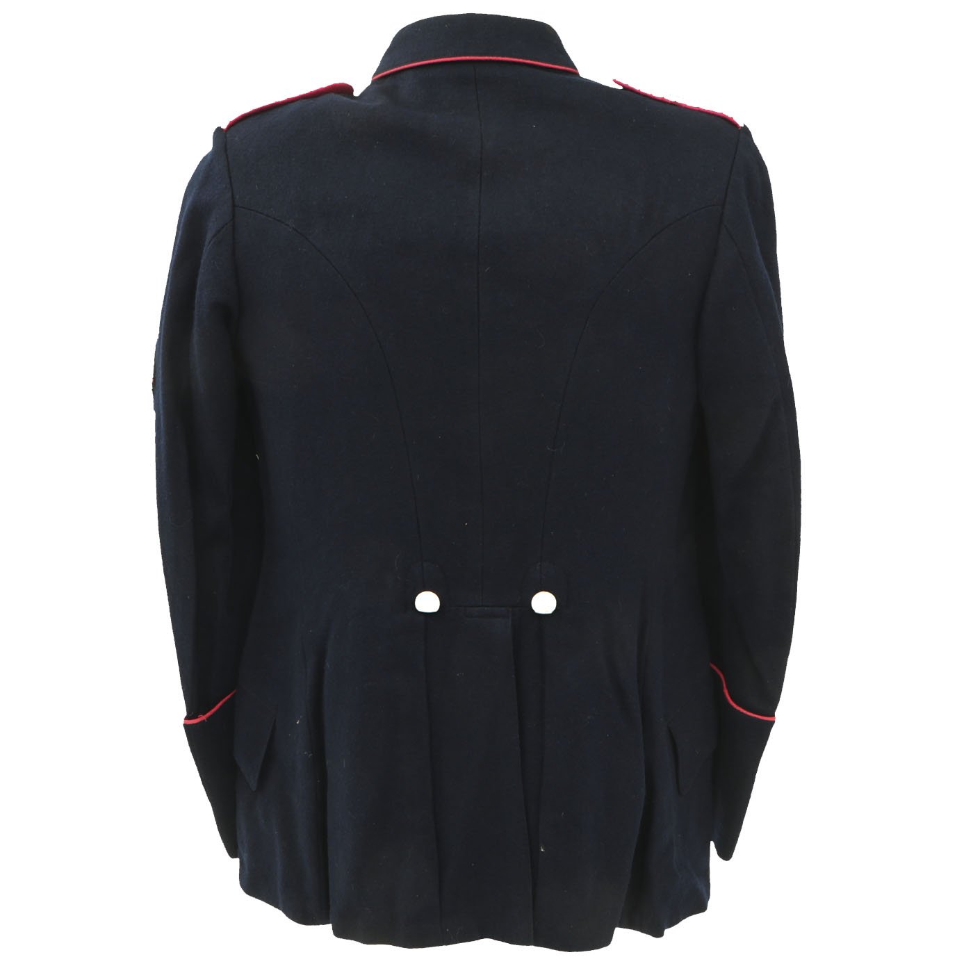 Original Item: Only One Available. This Fire Police Dress Tunic is a beautiful, tailor made piece, in outstanding condition. It’s made from a dark blue wool fabric, with attractive, bright pink piping, indicating Fire Police. The sleeve eagle is machine embroidered in pink thread on a dark blue wool backing, and is pristine. It’s emblazoned with the word “Bahrdorf” in Fraktur lettering, indicating Bahrdorf which is a municipality in the district of Helmstedt, in Lower Saxony, Germany. The collar tabs on this handsome tunic are Bevo machine woven, and are perfect. They are neatly machine sewn to the collar. The Fire Police shoulder boards are intact with bullion silver wire and birth pink piping. All of the original, silver pebbled buttons and belt ramps are intact and factory sewn. The interior of this Fire Police dress tunic is fully lined. There are no size markings, which is not at all unusual on these tailor made examples. Original Tailor label reading Feurwehr - Bedorf on inner pocket. This tunic displays extremely well, and has great visual appeal.