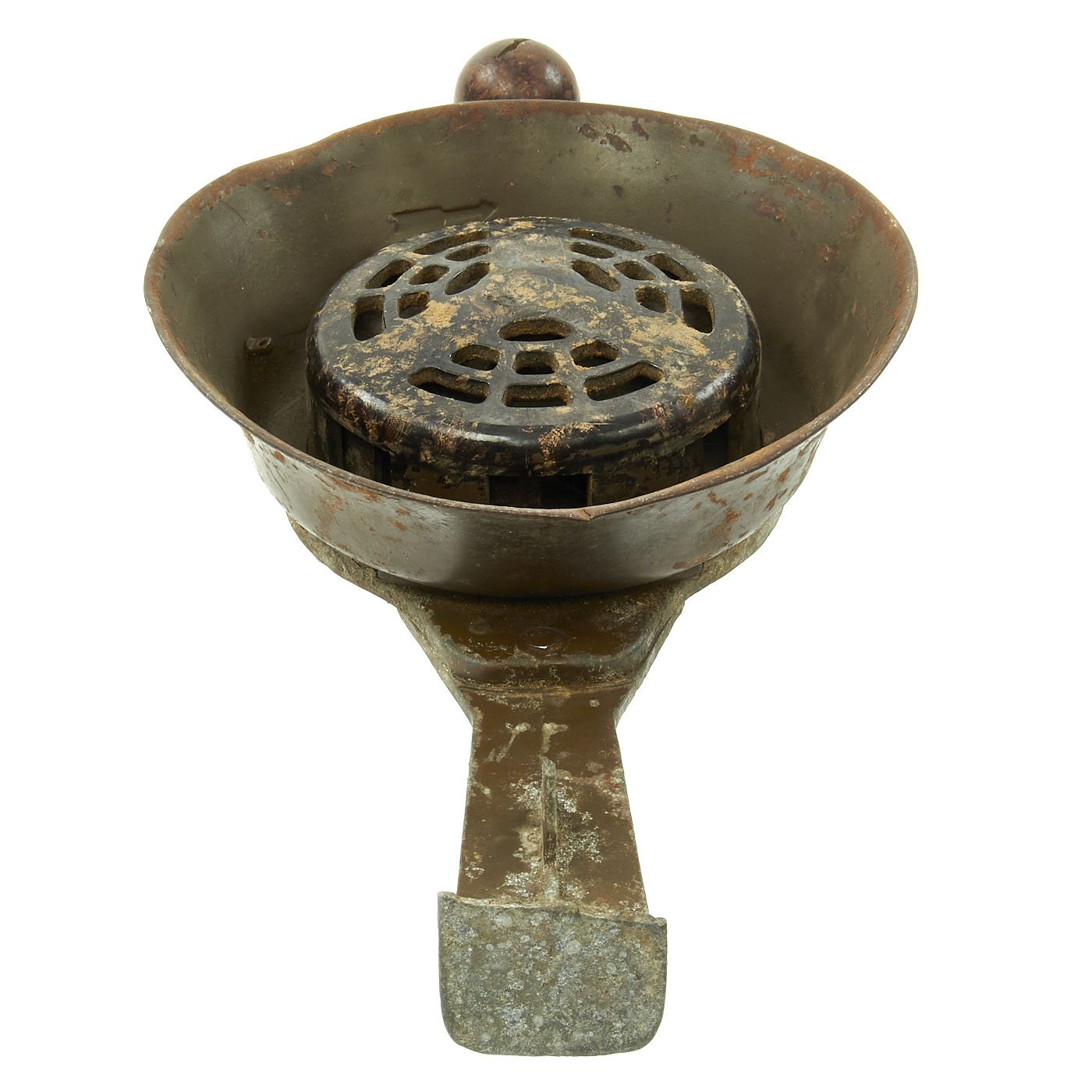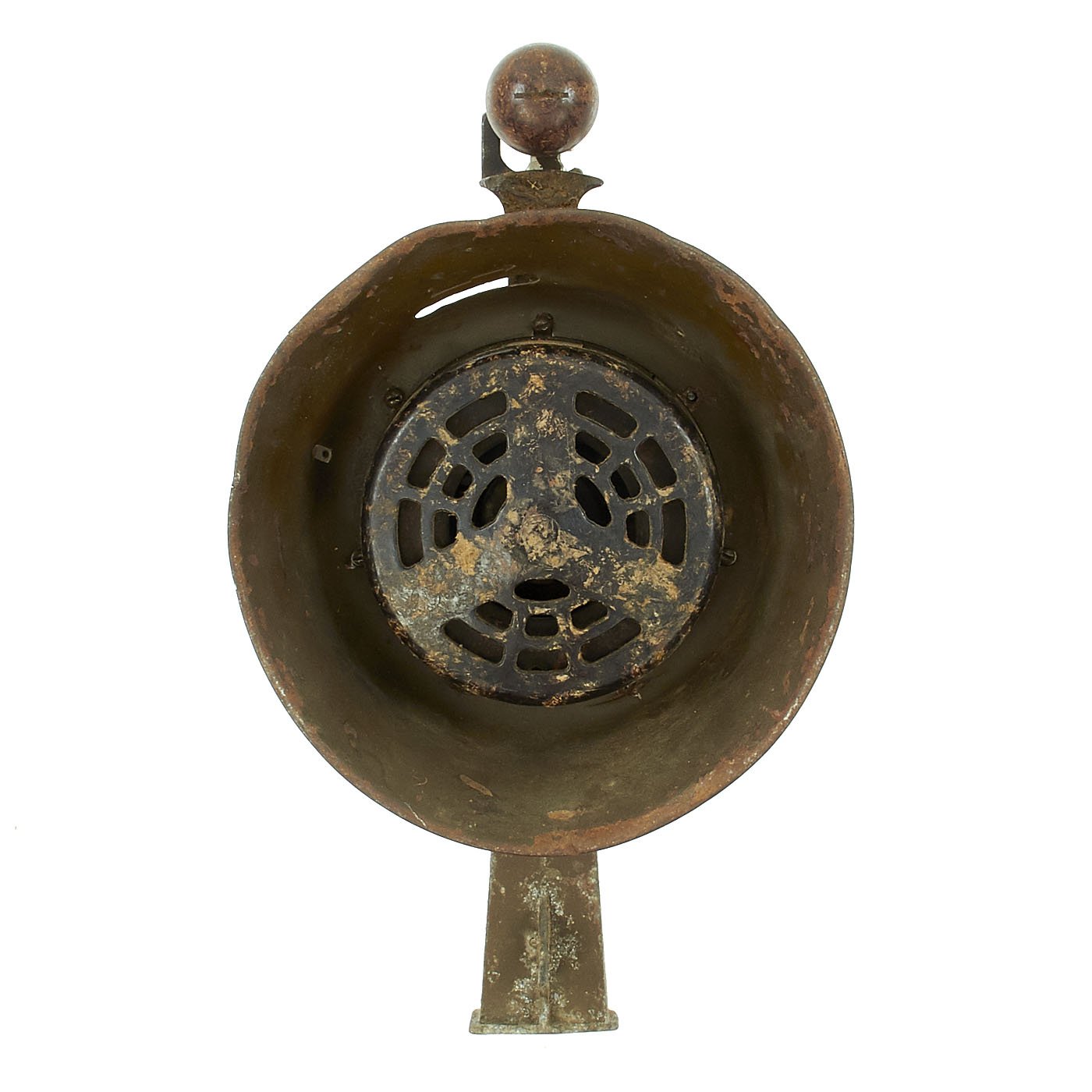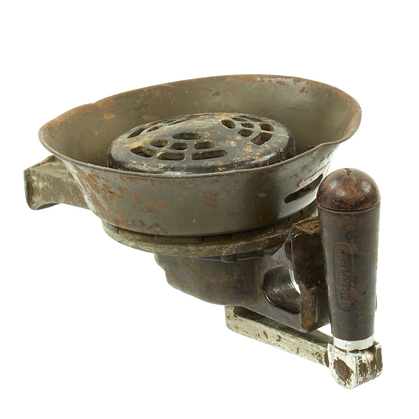 Original Item: Only One Available. Made in approximately 1940, this is a World War II German hand-crank air raid siren (Handsirene). The chopper, stator, rear housing and handle are made of Bakelite, while the horn is steel, and the other components are aluminum. It constructed from a wonderful red bakelite and still functions by emitting a classic air raid siren screech when cranked. The sound damper and handle have unfortunately been removed. Also, the OD green "bowl" for directing the sound has some damage, as does the mounting bracket bottom and retainer for the handle. The rest of the siren still retains the original paint.