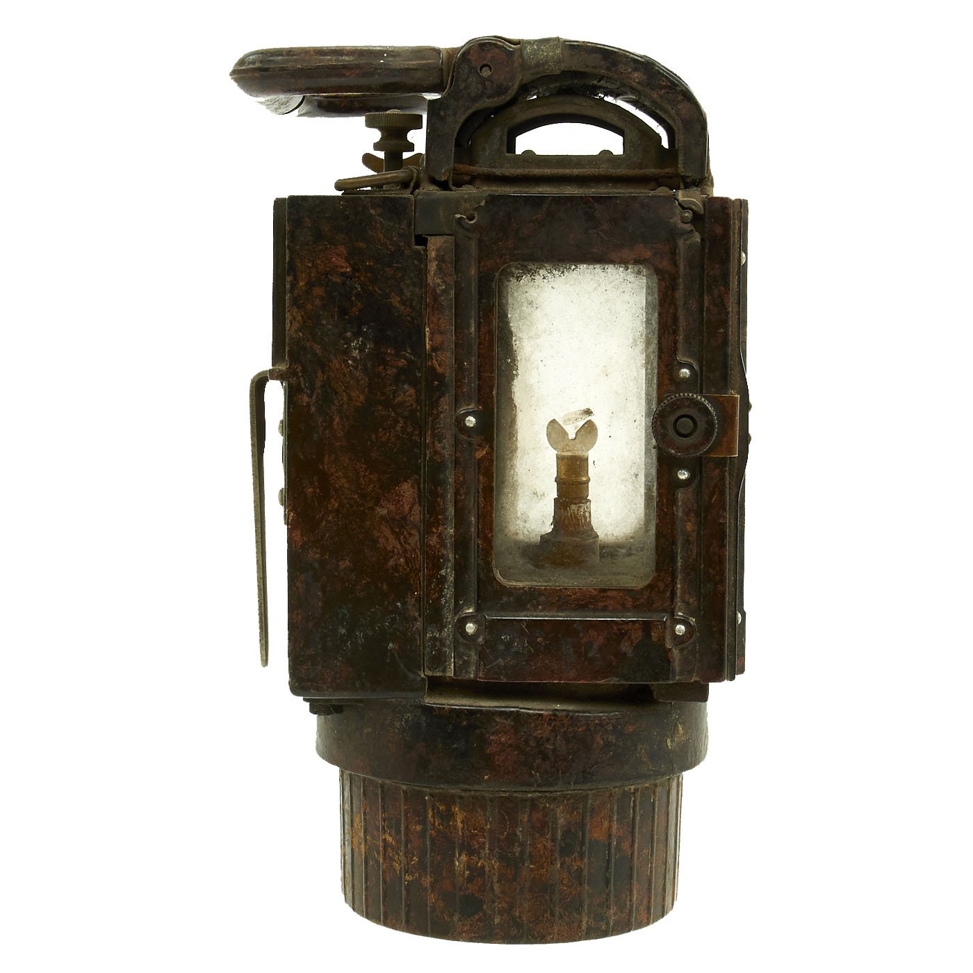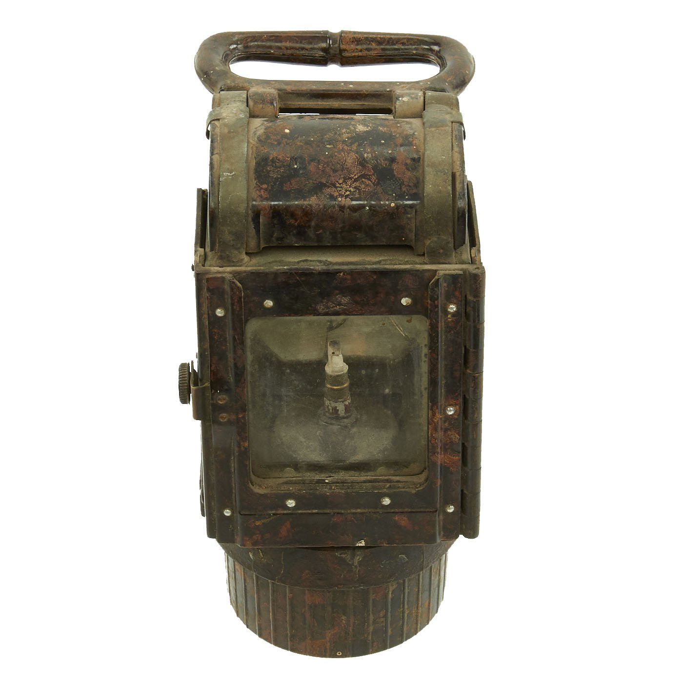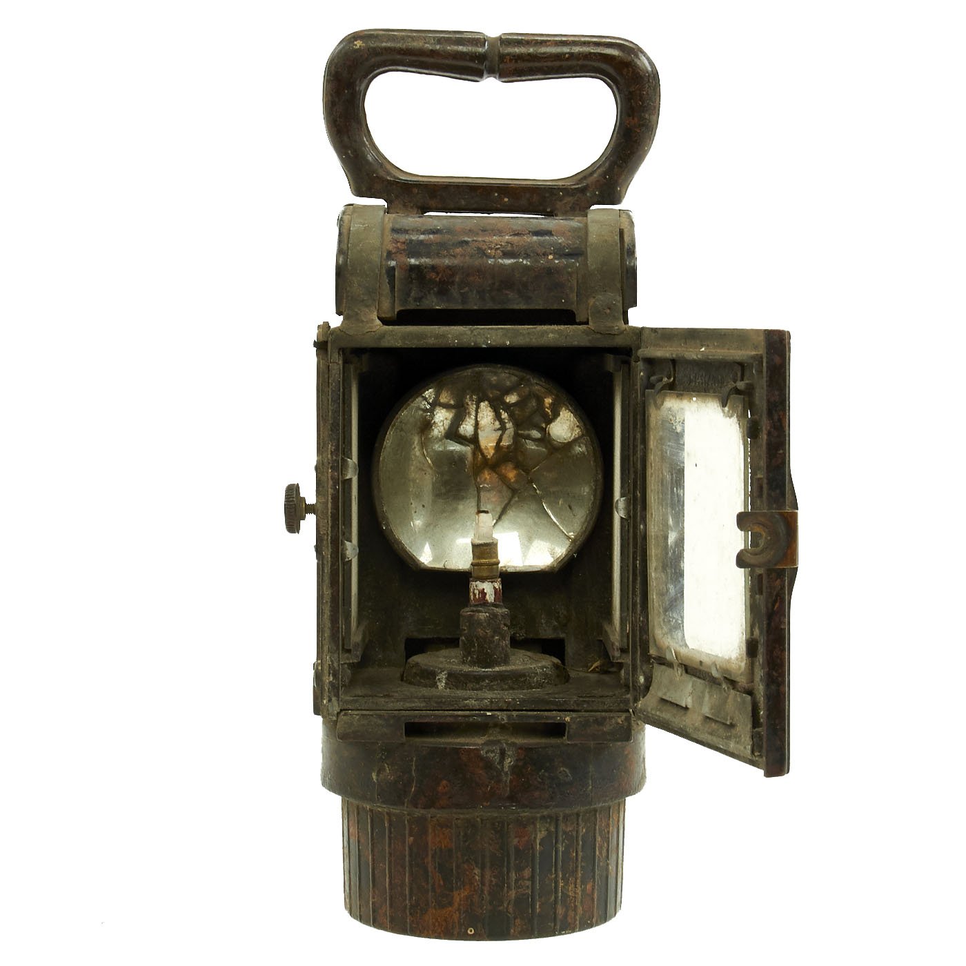 This carbide hand lantern is constructed of 90% bakelite, it features three glass window panes, a concave mirror, a folding bakelite carry handle and an aluminum belt hook which has a German WWII Waffenamt WaA 38 marking. The bakelite is wartime marked by the manufacturer on the handle, with PAG in a circle, next to 1608 A1 and other symbols.