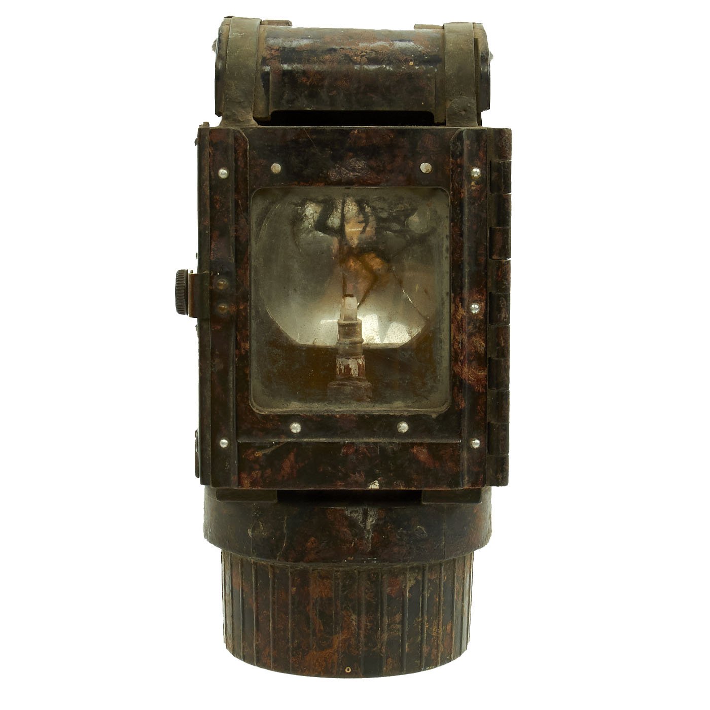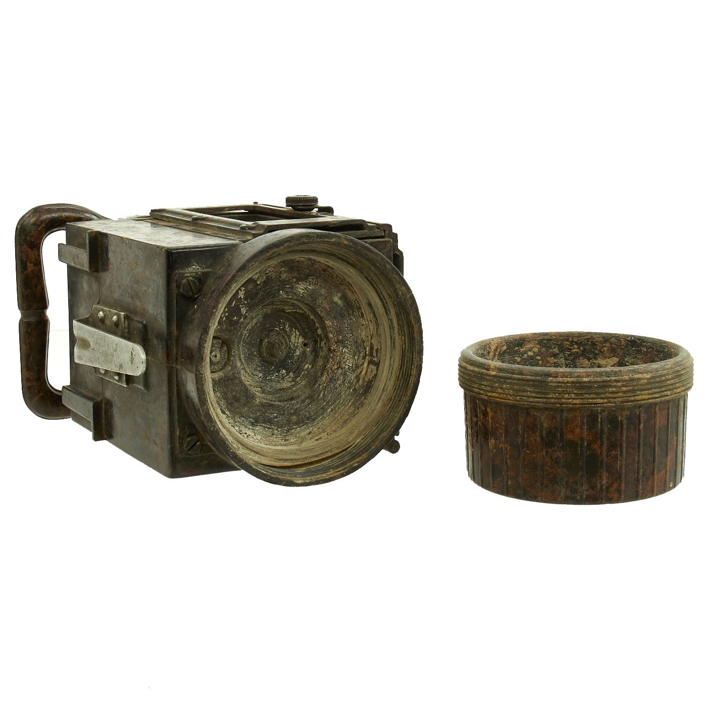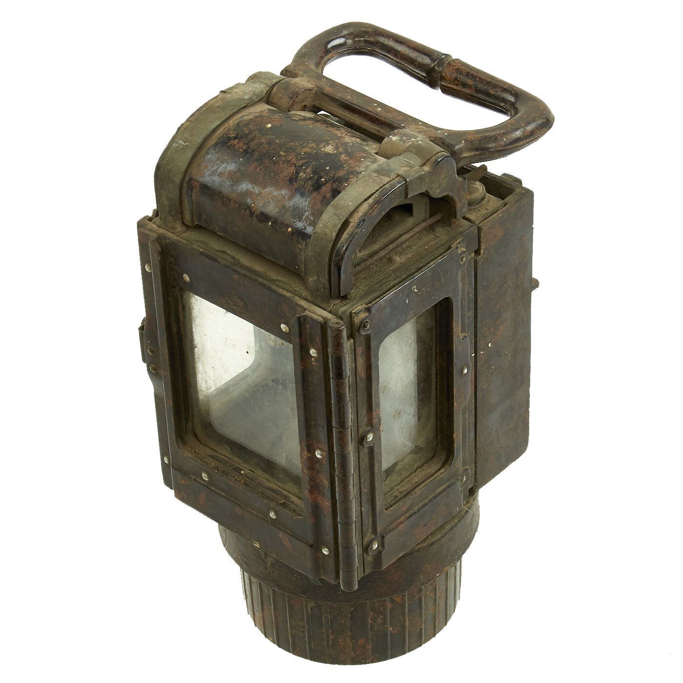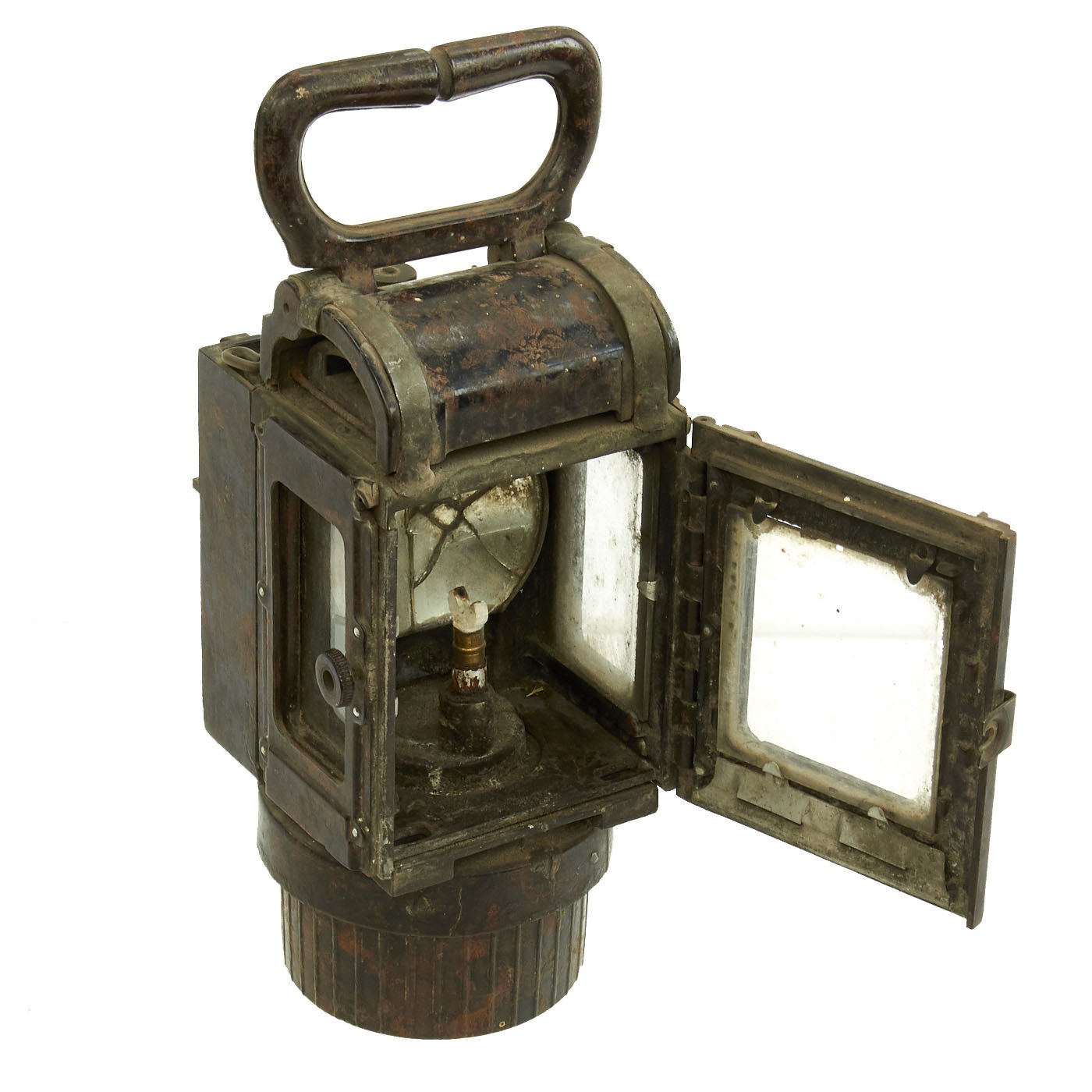 This carbide hand lantern is constructed of 90% bakelite, it features three glass window panes, a concave mirror, a folding bakelite carry handle and an aluminum belt hook which has a German WWII Waffenamt WaA 38 marking. The bakelite is wartime marked by the manufacturer on the handle, with PAG in a circle, next to 1608 A1 and other symbols.
