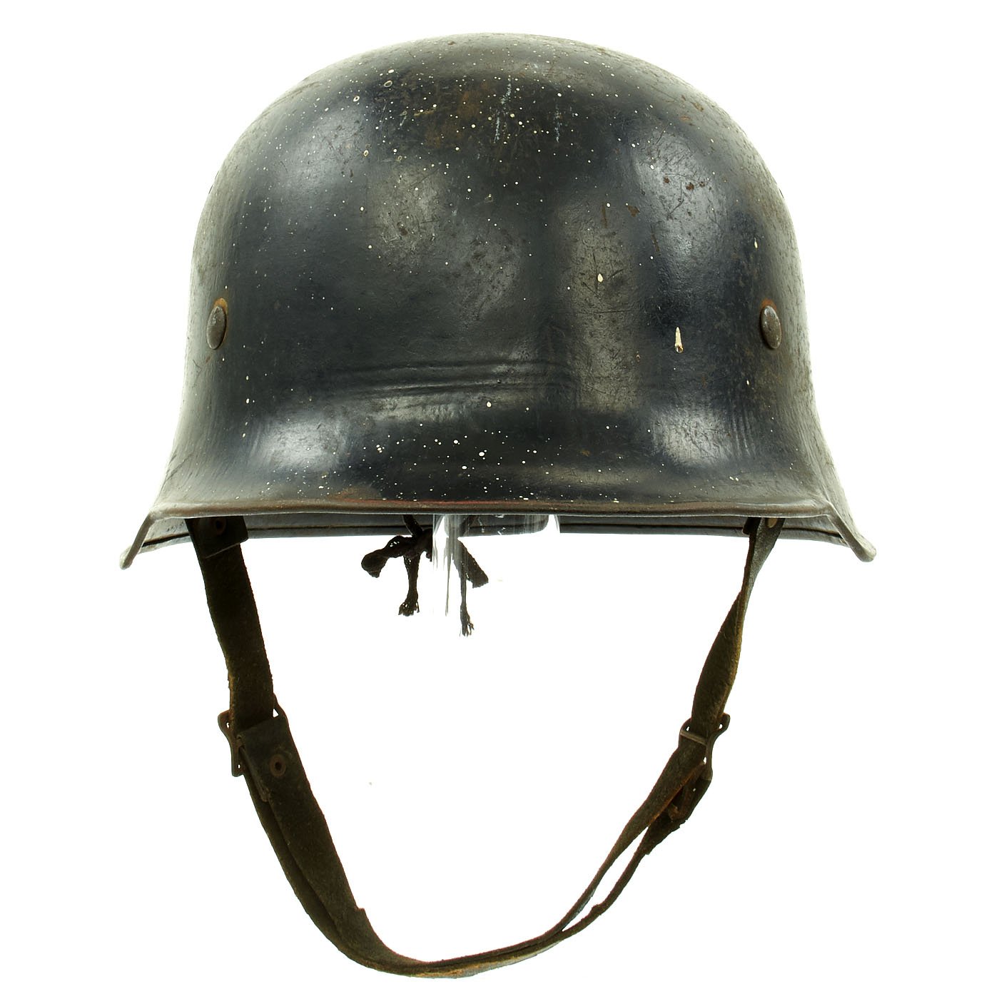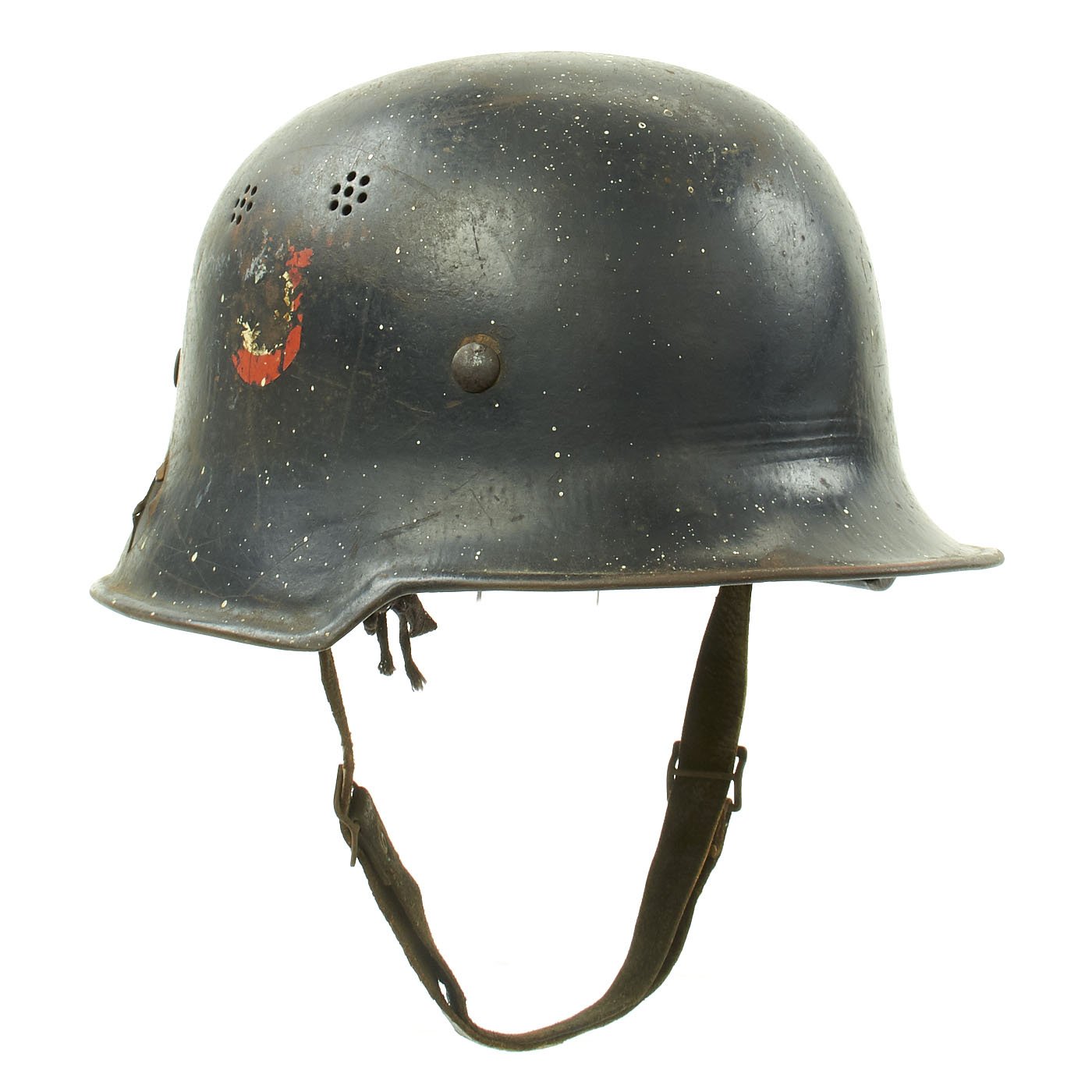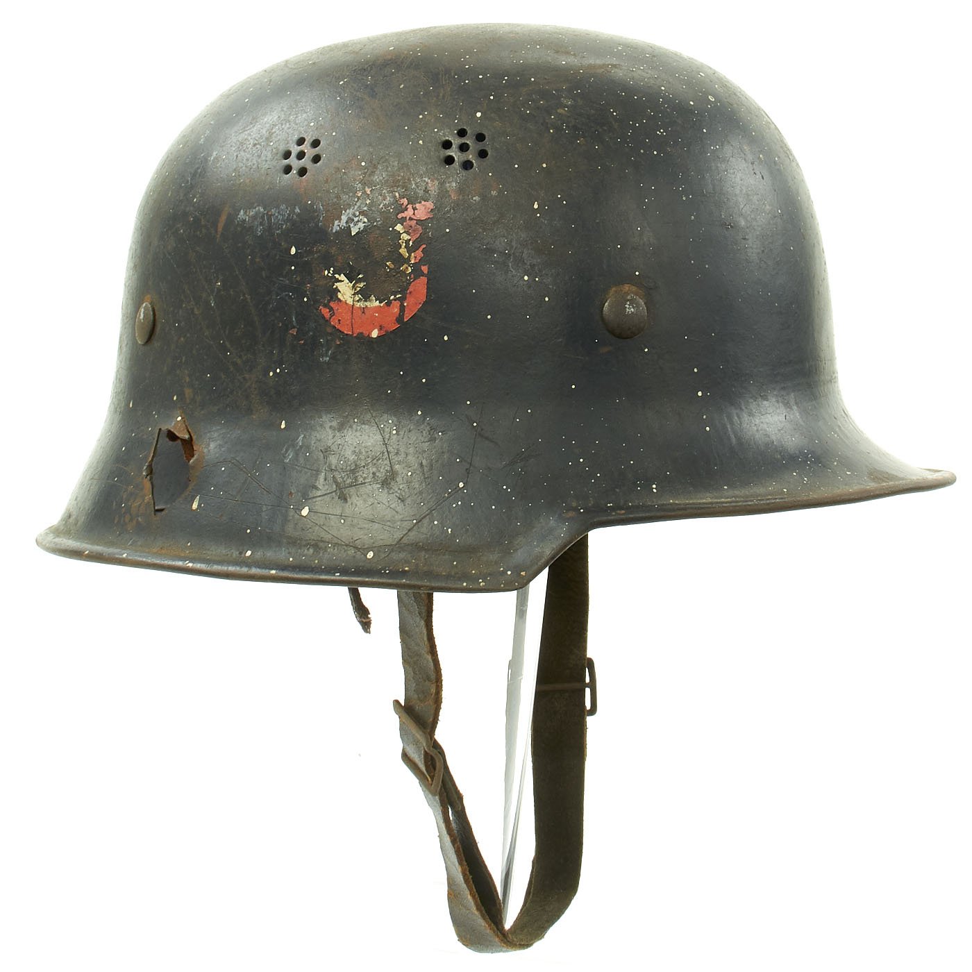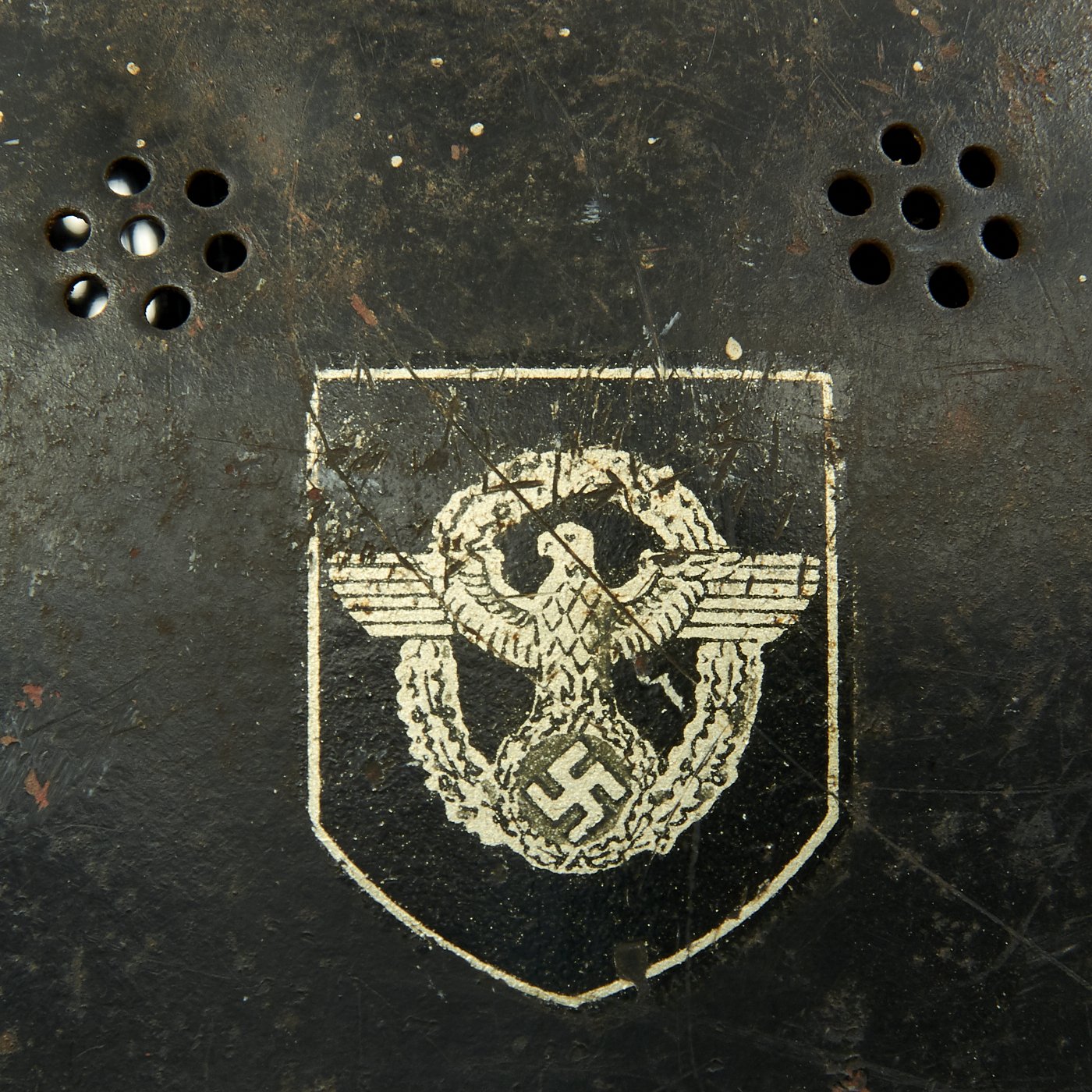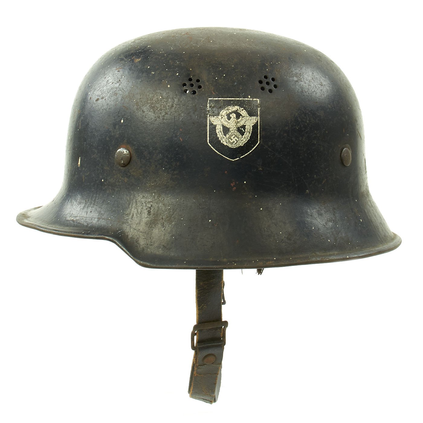 Original Item: Only One Available. This is a very nice genuine steel construction M34 "Square Dip" Third Reich helmet, outfitted for German WWII civic police issue. Unlike many that we have had, this example shows a lot of wear, including some very nice "battle damage" in the form of a hole on the right skirt, which is just about the right size for a bullet or shrapnel hitting the inside of the helmet and exiting to the right side.