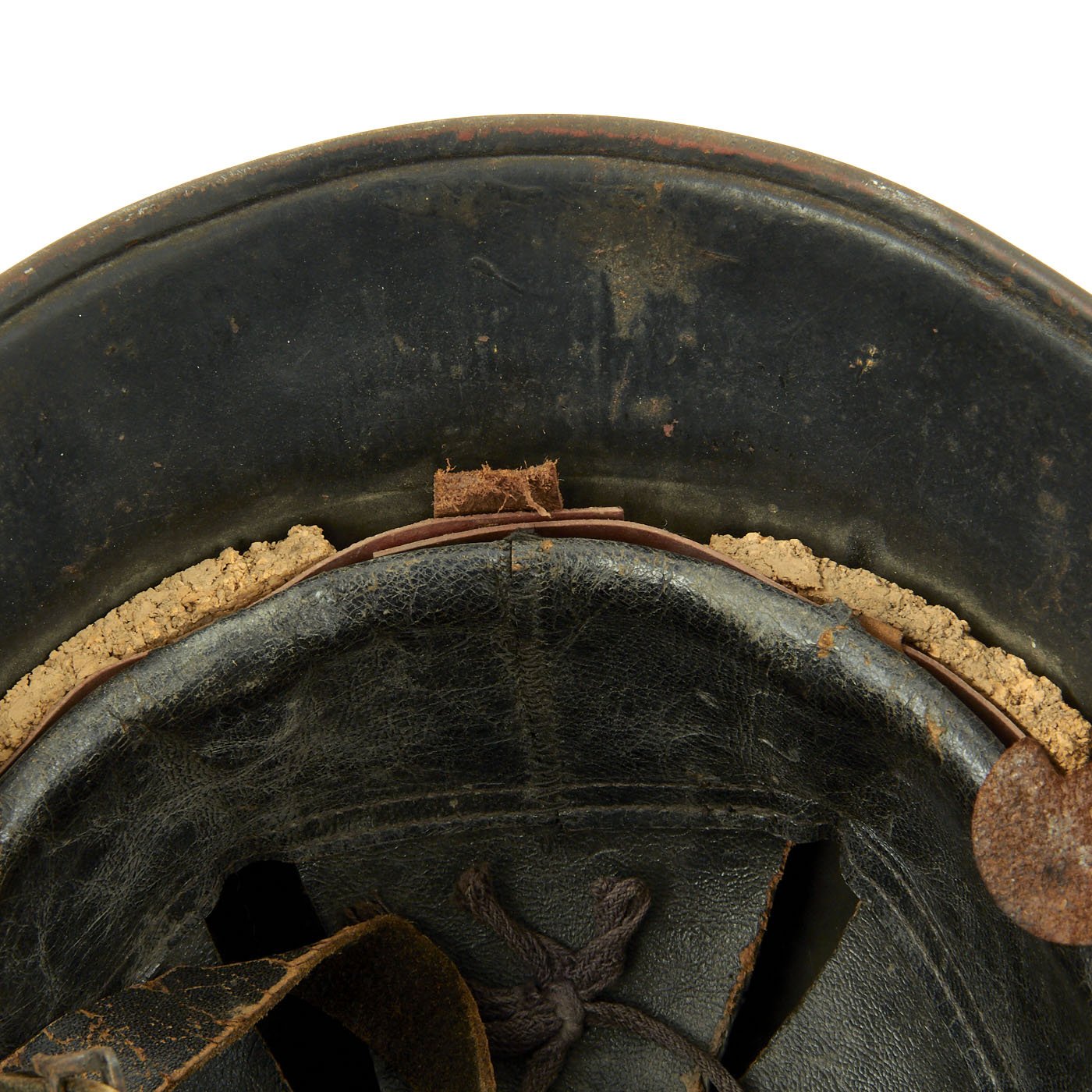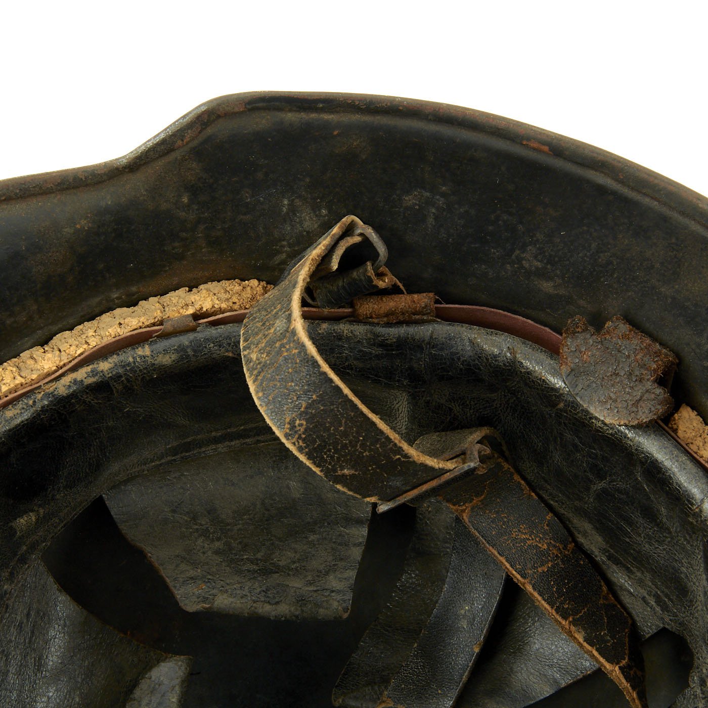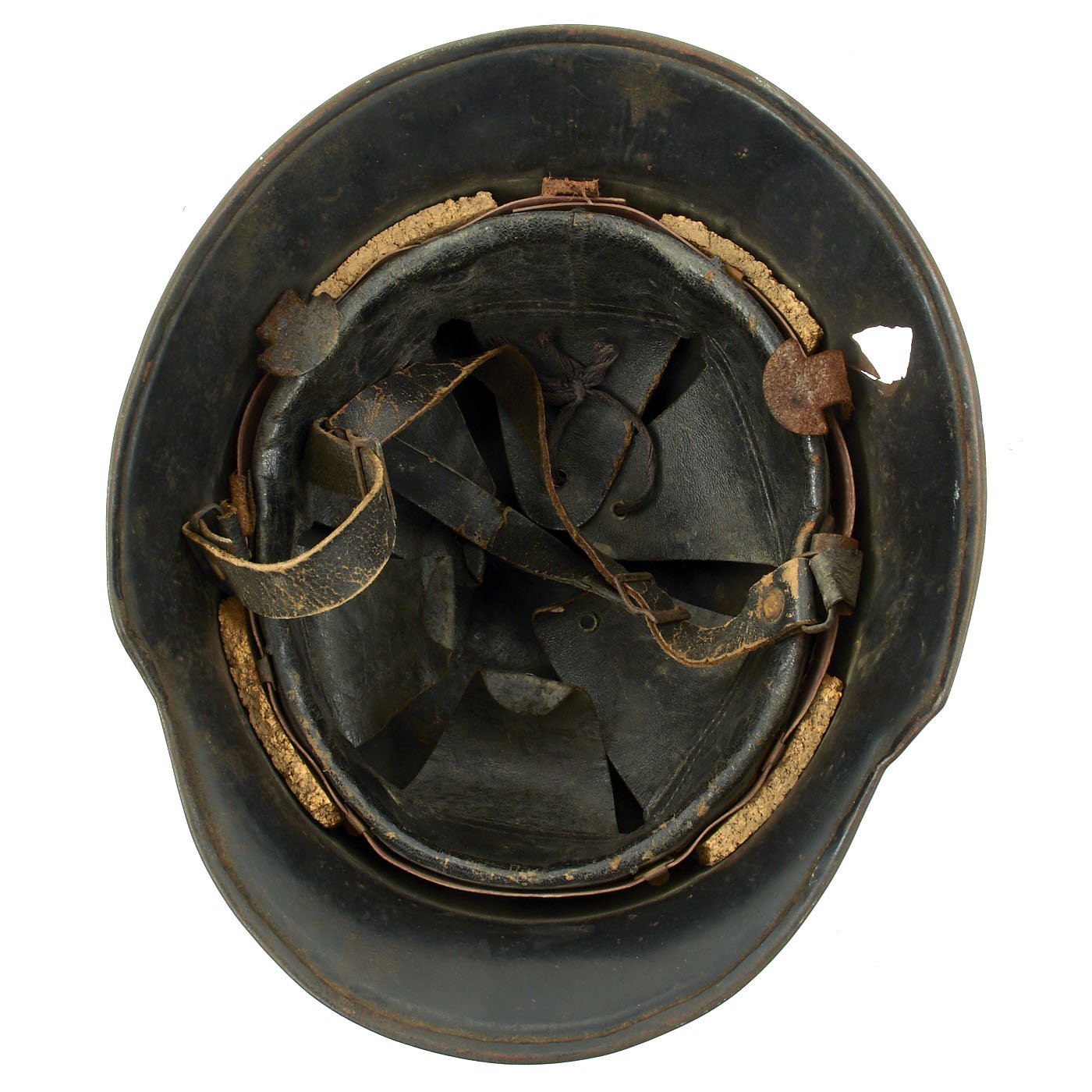 It features genuine double decals of civic eagle and NSDAP swas. Comes with complete leather liner and cork washers still intact and tight with all 4 split pins. The black leather liner is in very good condition for its age, showing some wear. The original top tie is still present, but not attached to all the fingers. The liner also still has rear tabs for a leather "skirt", which were installed on fire helmets. The chin strap is also leather, though it is dried out and cracked, and is over all in somewhat delicate condition.