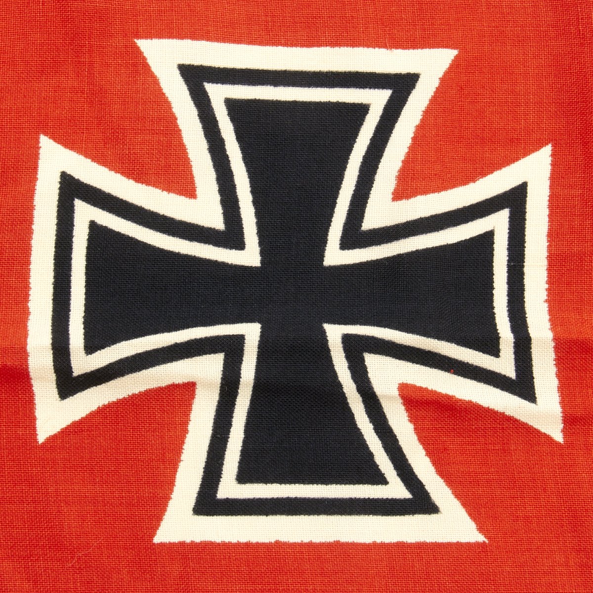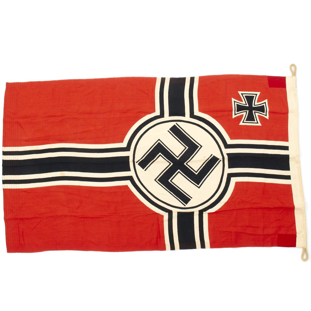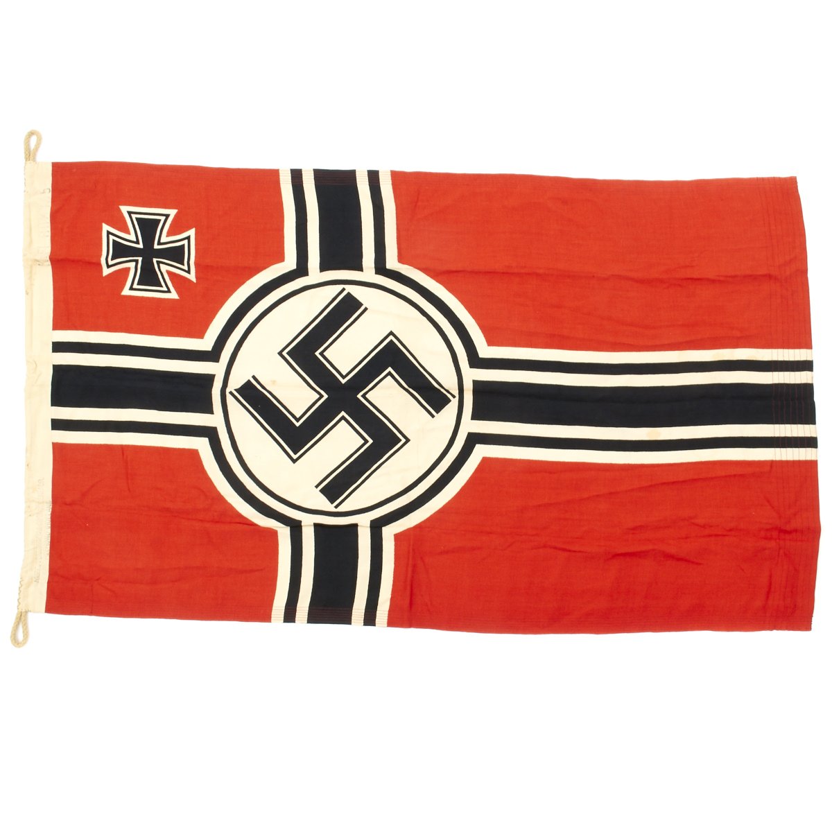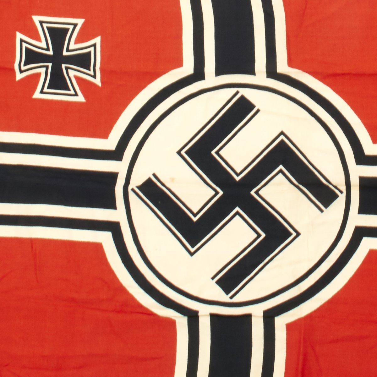 Constructed of wool with a canvas header, the flag features a bright red field with a large white central circle displaying a large swas, with the German Naval Cross design also in black and white to the edges. In the top corner canton is a black on white Iron cross.