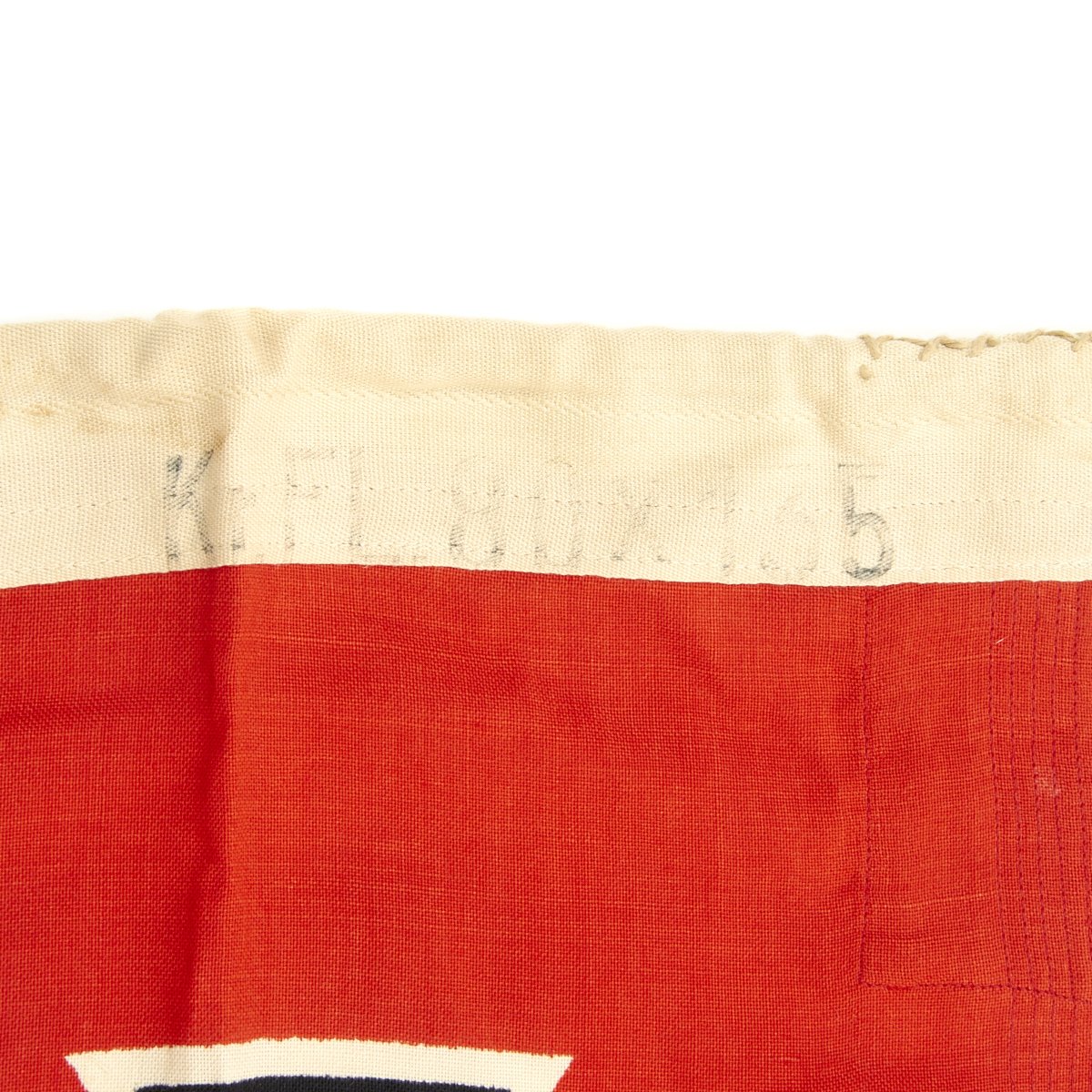 This battle flag is totally original and is in very good condition with only minor wear in a couple of isolated spots. Nicely stamped on the header with the manufacturer information: