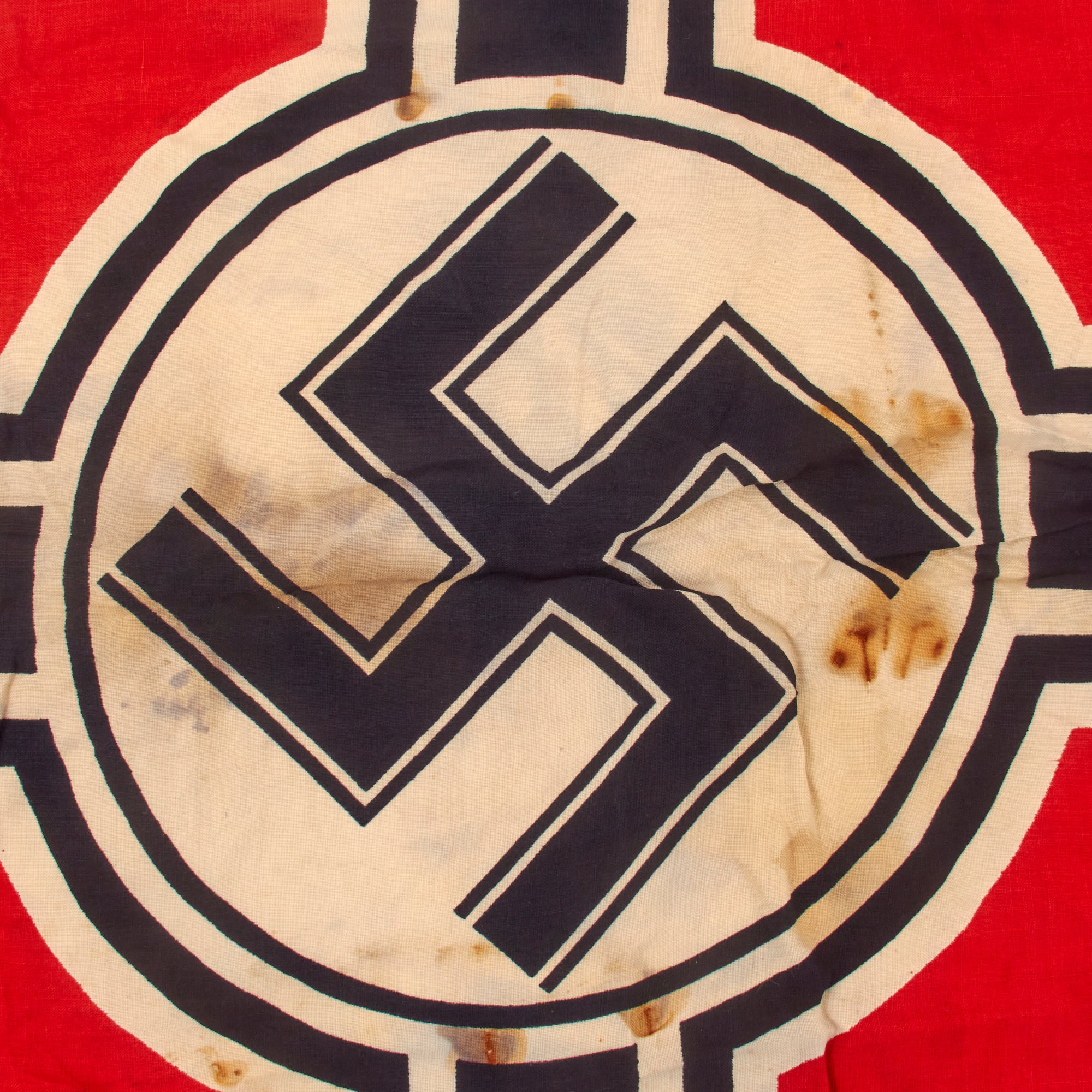 Constructed of wool with a canvas header, the flag features a bright red field with a large white central circle displaying a large swas, with the German Naval Cross design also in black and white to the edges. In the top corner canton is a black on white Iron cross.