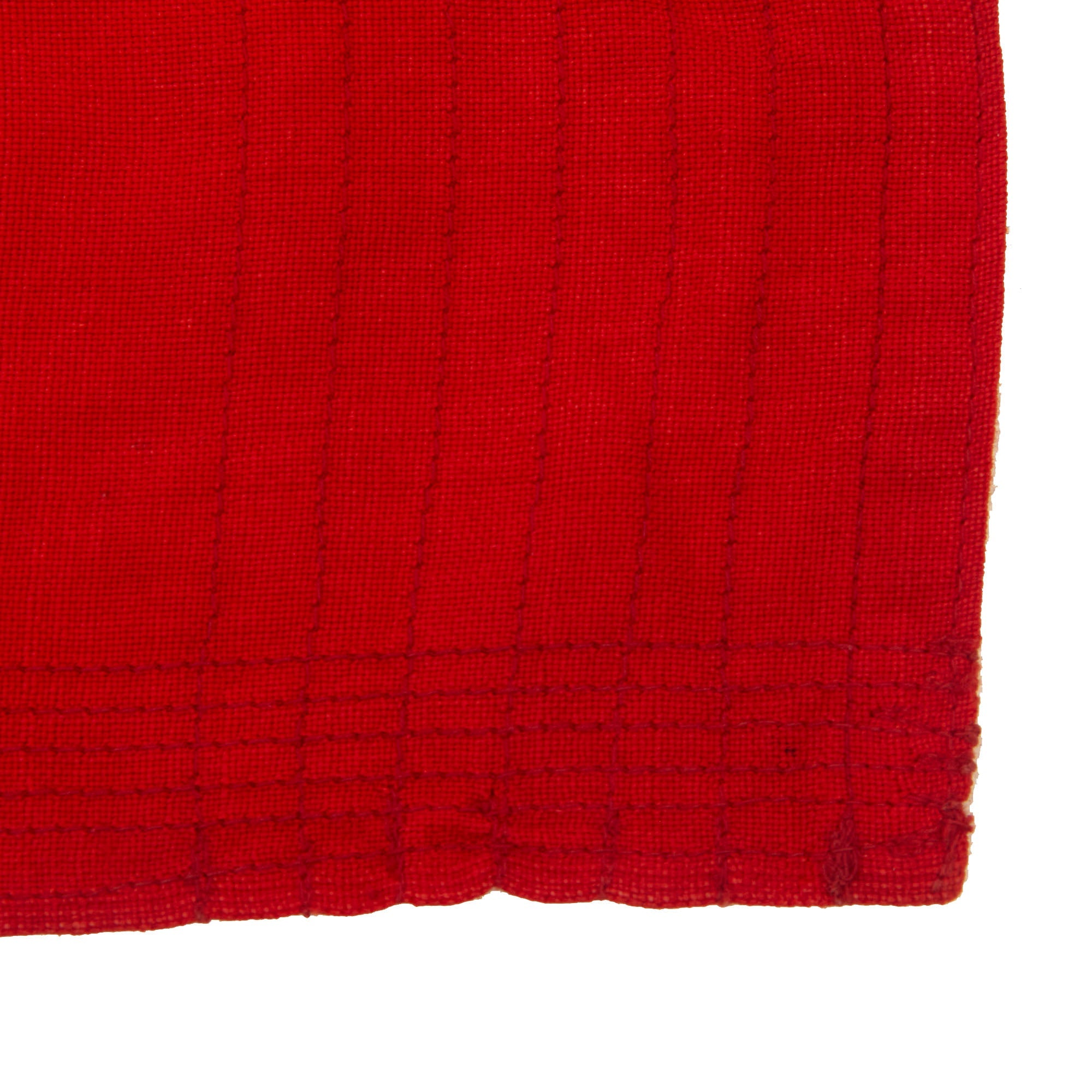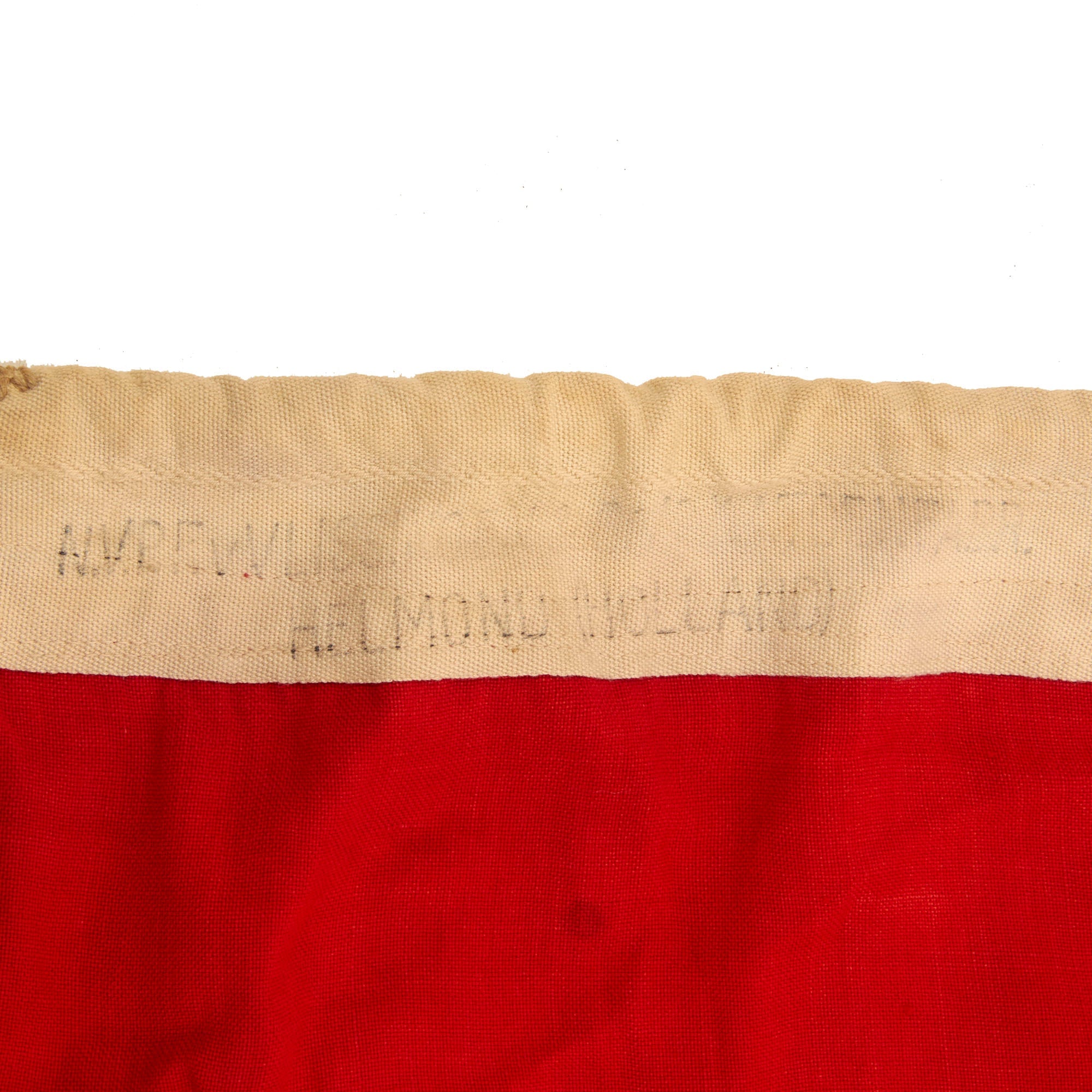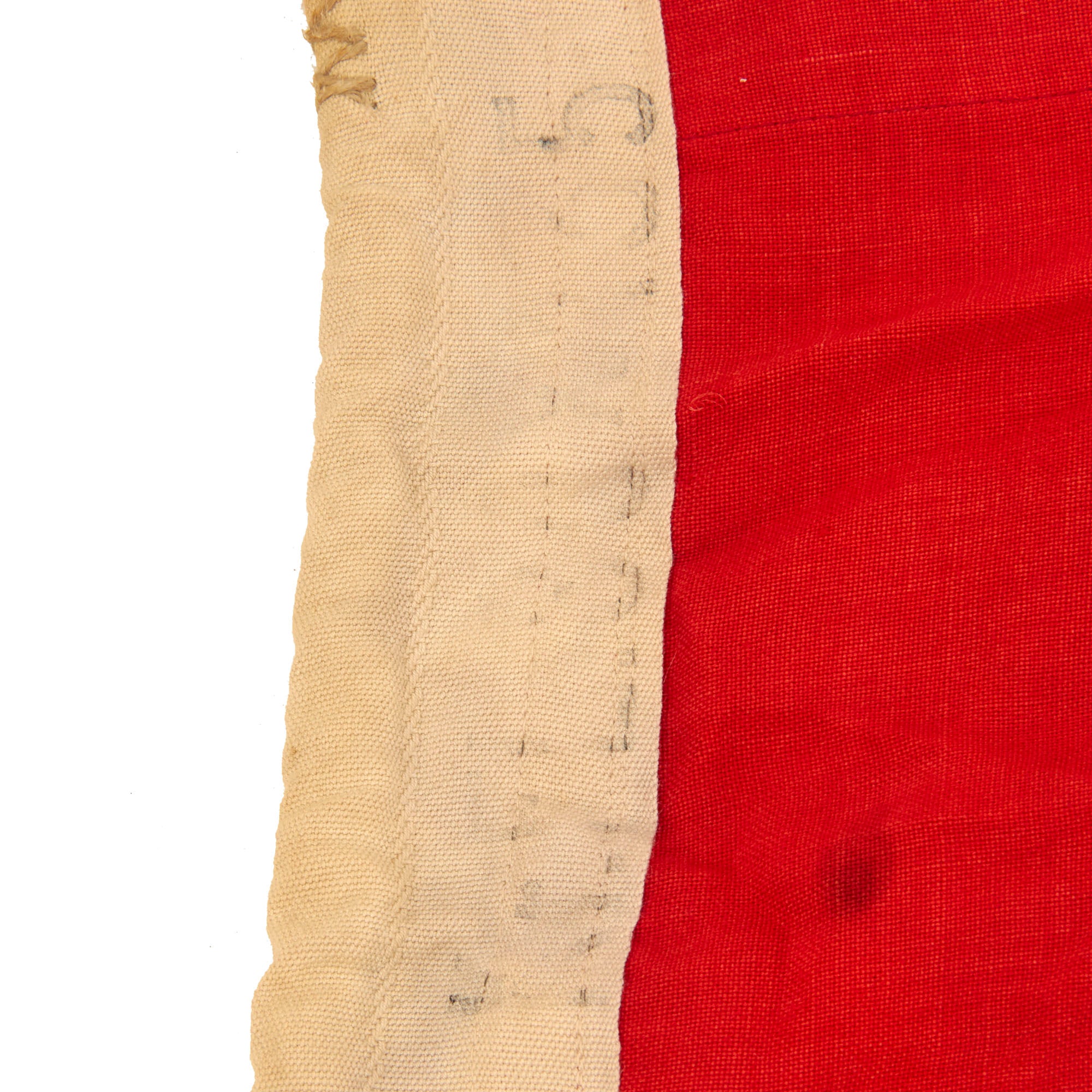 This battle flag is totally original and is in very good condition with some areas of staining. Ink stamped but faded on the header with the manufacturer information partially legible: