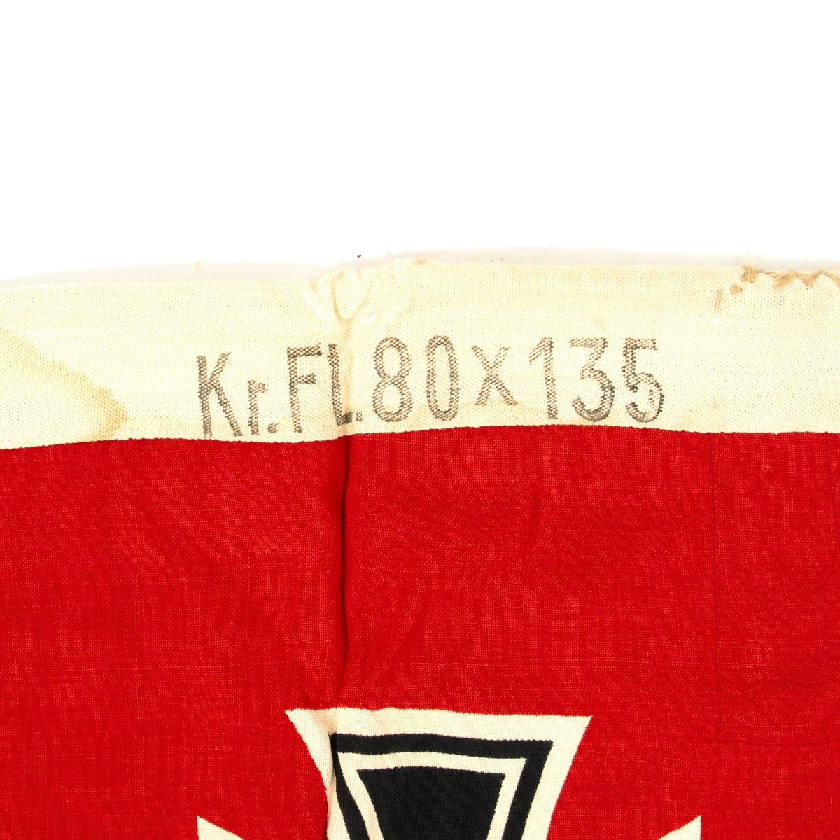The proportions of the flag are 3:5. Fusing elements of the NSDAP German Flag (swas and red background) with that of the old Imperial Reich War Flag (four arms emanating from off-center circle and Iron Cross in the canton), these flags were uniformly produced as a printed design on bunting.